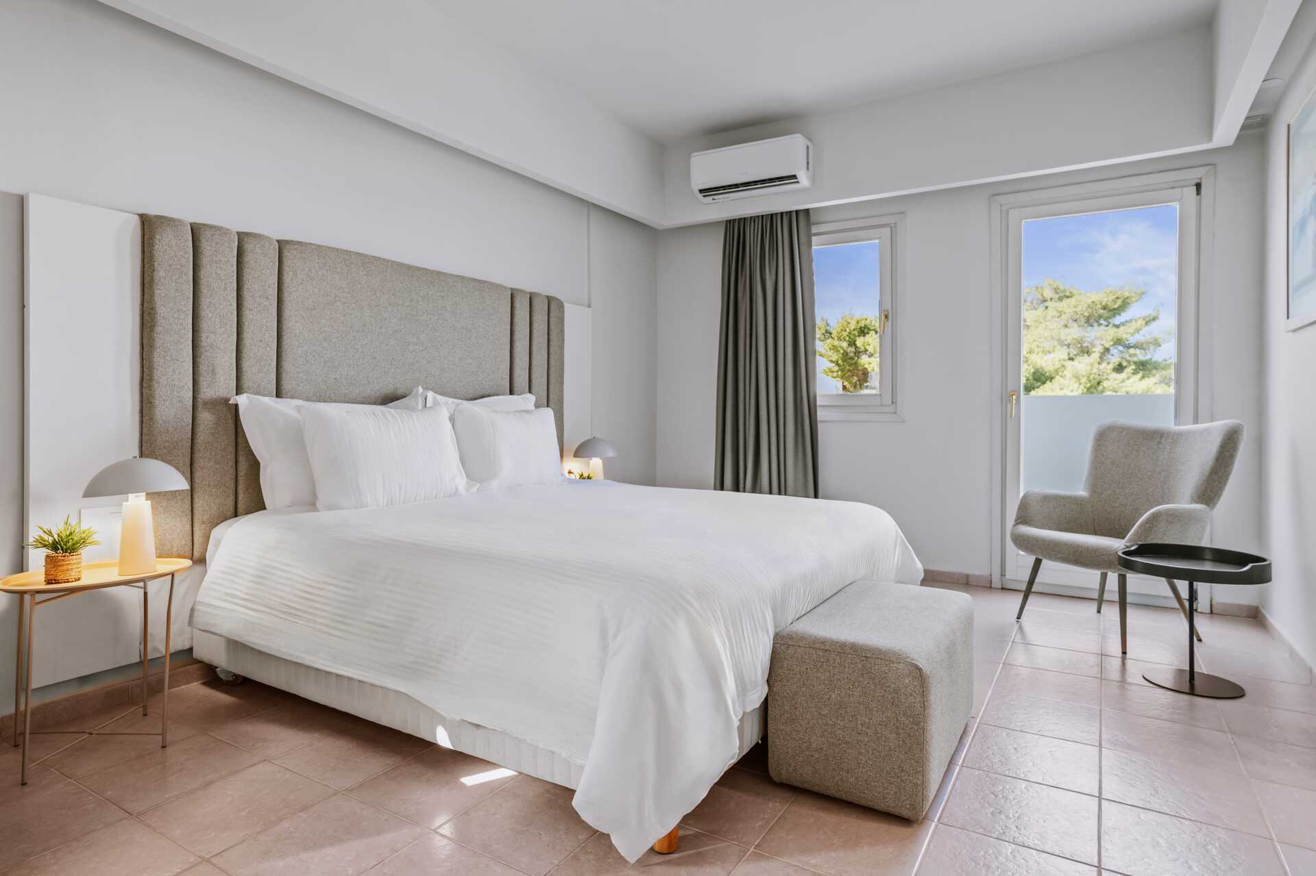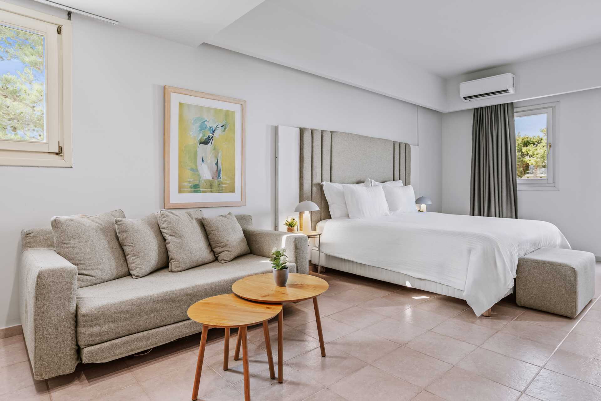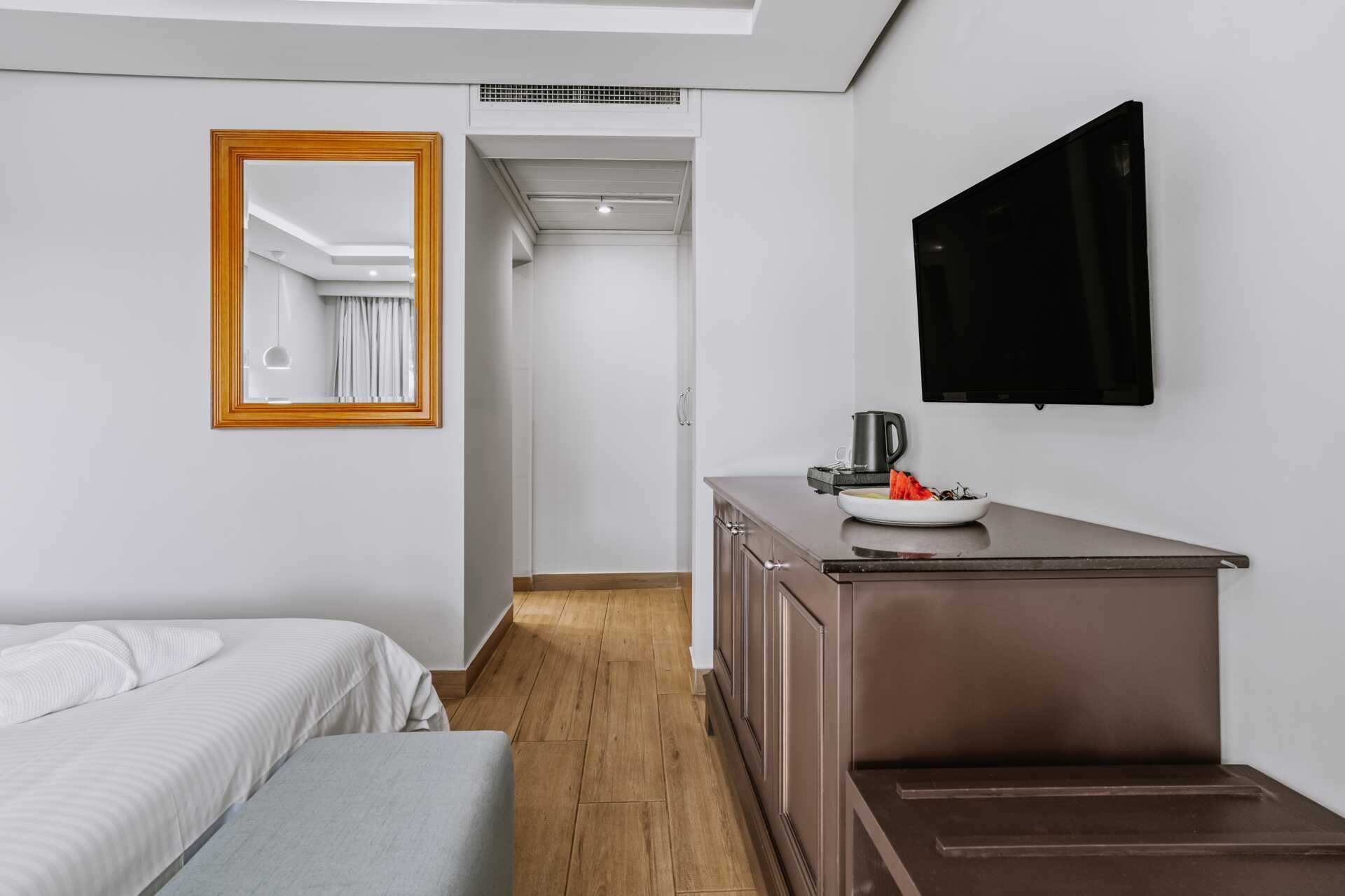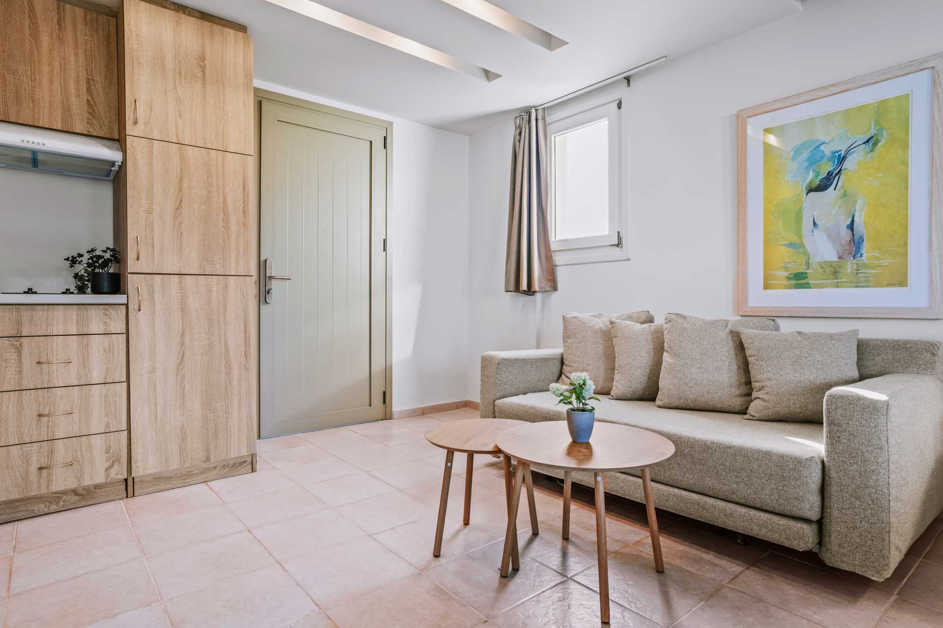 Toromsleilighet med balkong, noen med begrenset havutsikt. Balkongene varierer i størrelse. Et soverom og en stue med minikjøkken. To enkeltsenger. Mulig med ekstraseng i sovesofa. Minikjøkken med kokeplater, kjøleskap og enkelt kjøkkenutstyr. Mikrobølgeovn kan lånes (begrenset antall). Vannkoker samt kaffe og te. Wifi, safe og luftkondisjonering inkludert. TV. Hårføner. Badekar og wc. Rengjøring 7 ggr/uke.