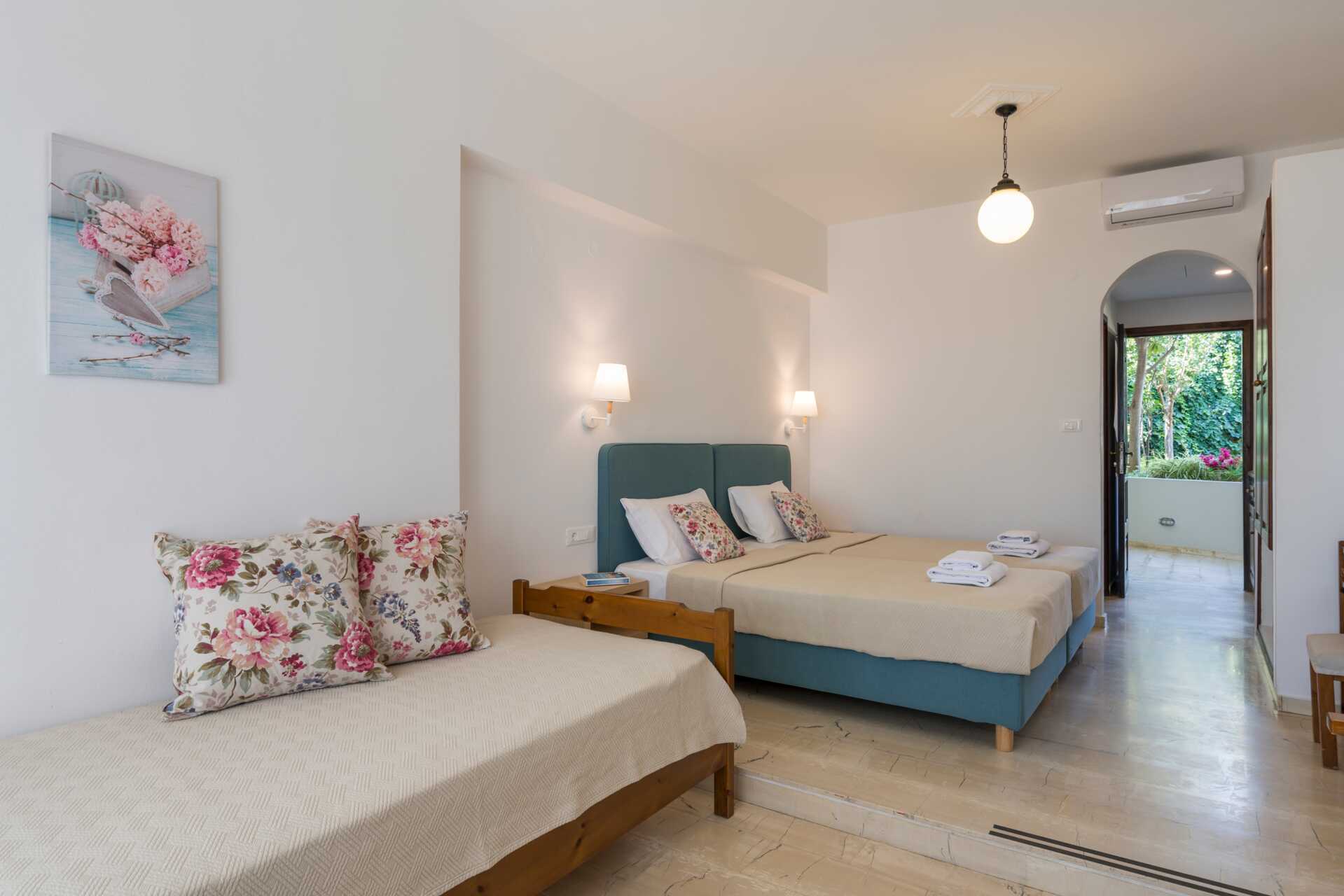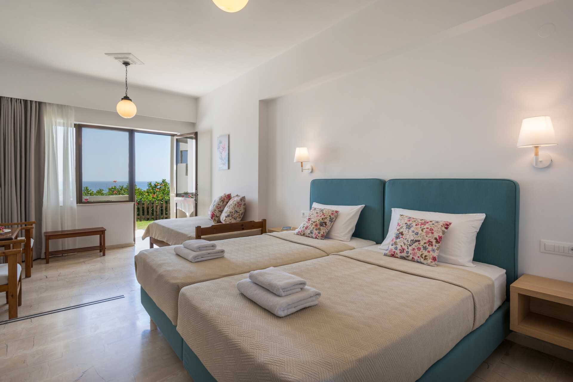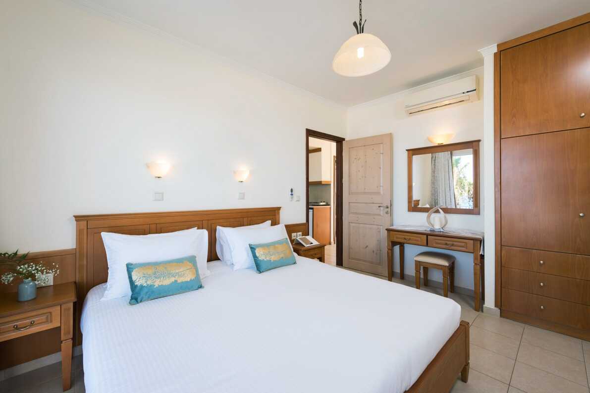Treromsleilighet med balkong og havutsikt. To soverom og en med minikjøkken. En dobbeltseng eller to enkeltsenger i hvert soverom. Minikjøkken med kokeplater, kjøleskap, vannkoker, kaffetrakter og enkelt kjøkkenutstyr. Wifi og luftkondisjonering inkludert. Safe mot avgift. TV. Hårføner. Badekar og wc. Rengjøring 6 ggr/uke.