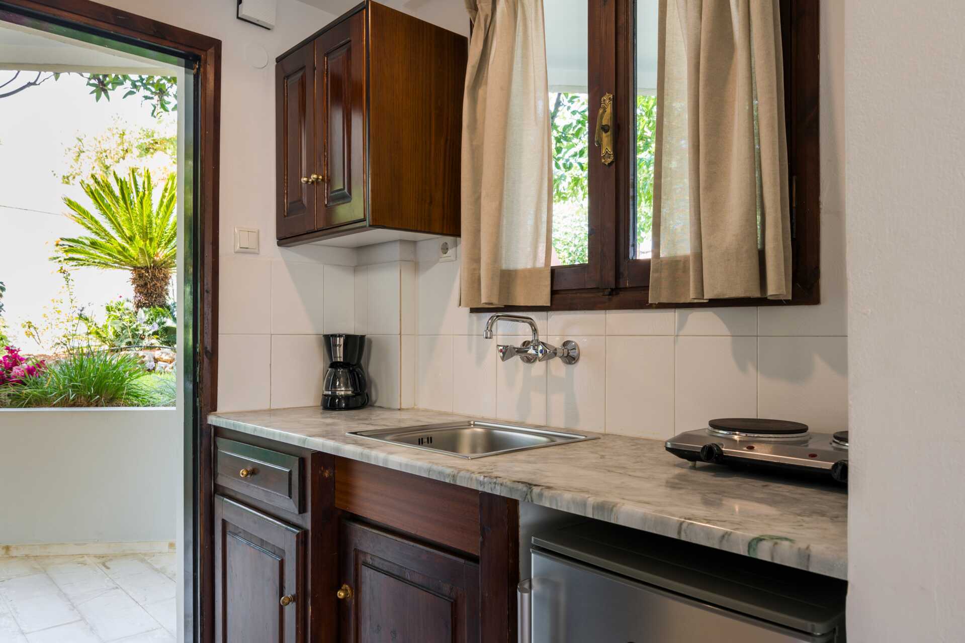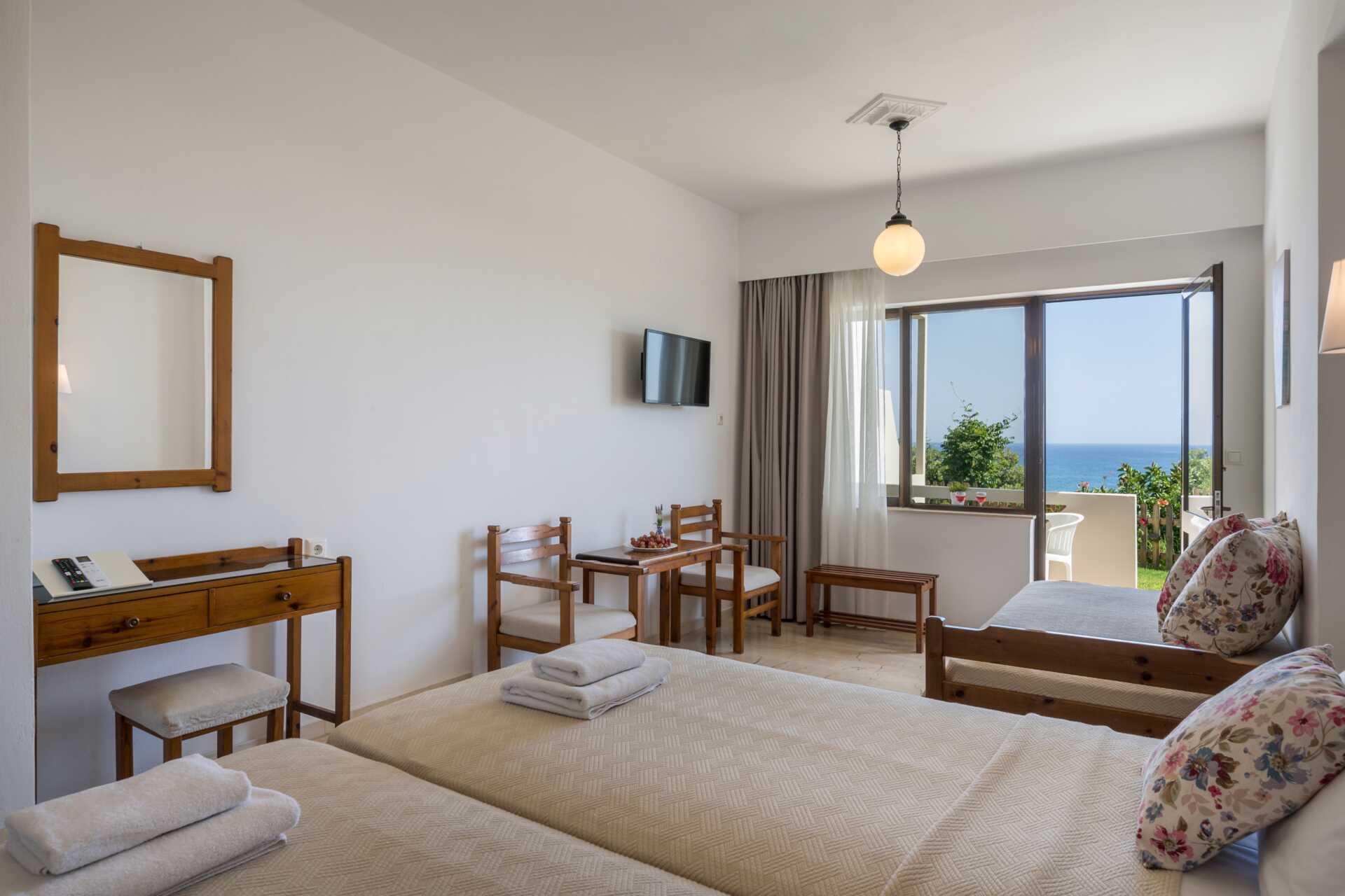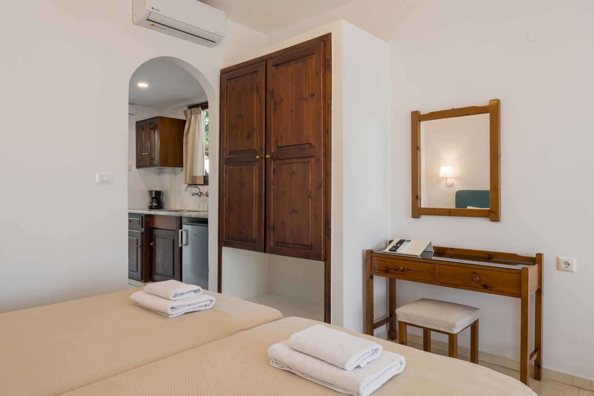 Ettromsleilighet med balkong med havutsikt, eller markterrasse og begrenset havutsikt. Kombinert soverom med stue og minikjøkken. To enkeltsenger. Mulig med en ekstraseng i enkeltseng. Soveromsdelen ligger et trappetrinn opp. Minikjøkken med kokeplater, kjøleskap, vannkoker, kaffetrakter og enkelt kjøkkenutstyr. Wifi og luftkondisjonering inkludert. Safe mot avgift. TV. Hårføner. Badekar og wc. Rengjøring 6 ggr/uke.