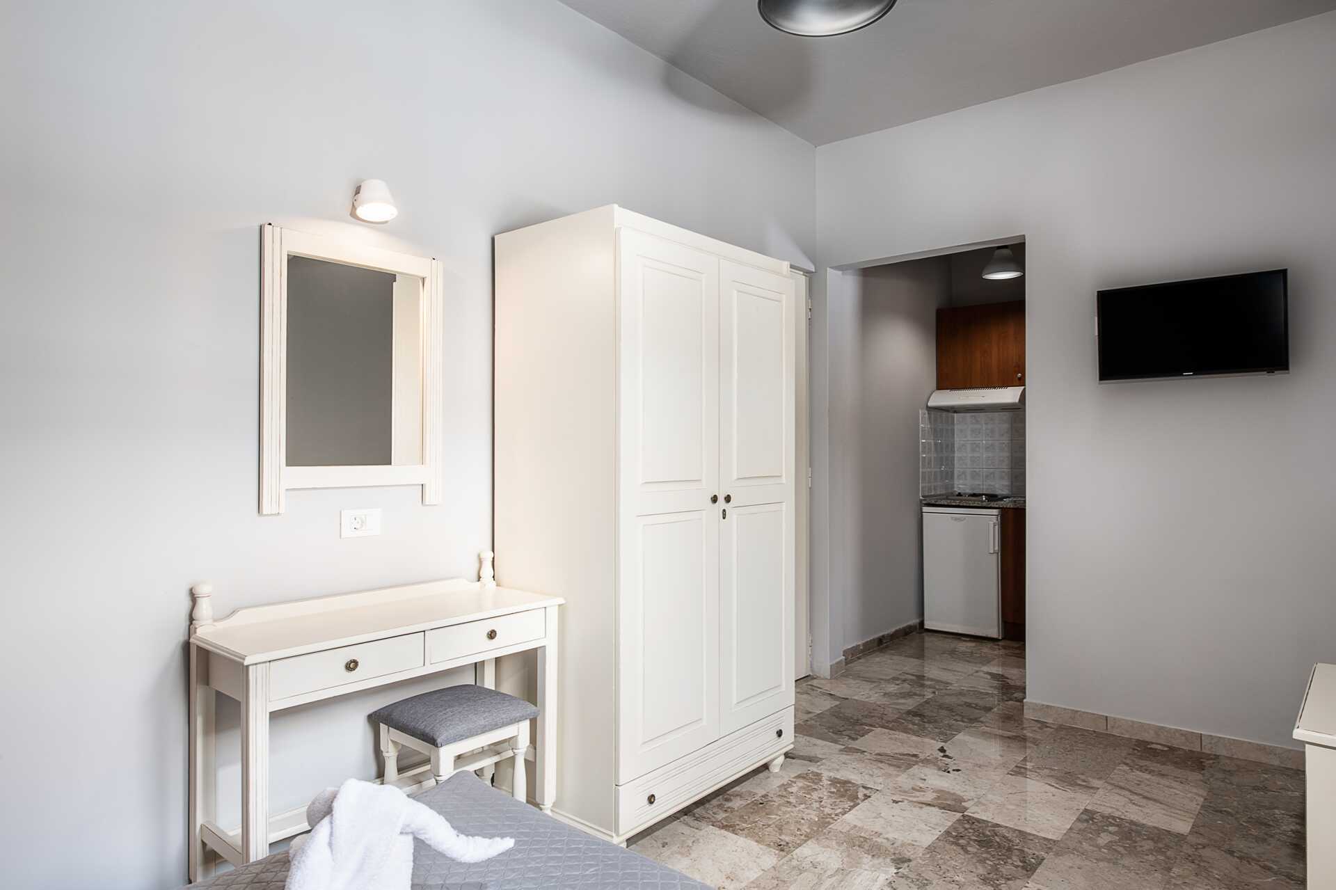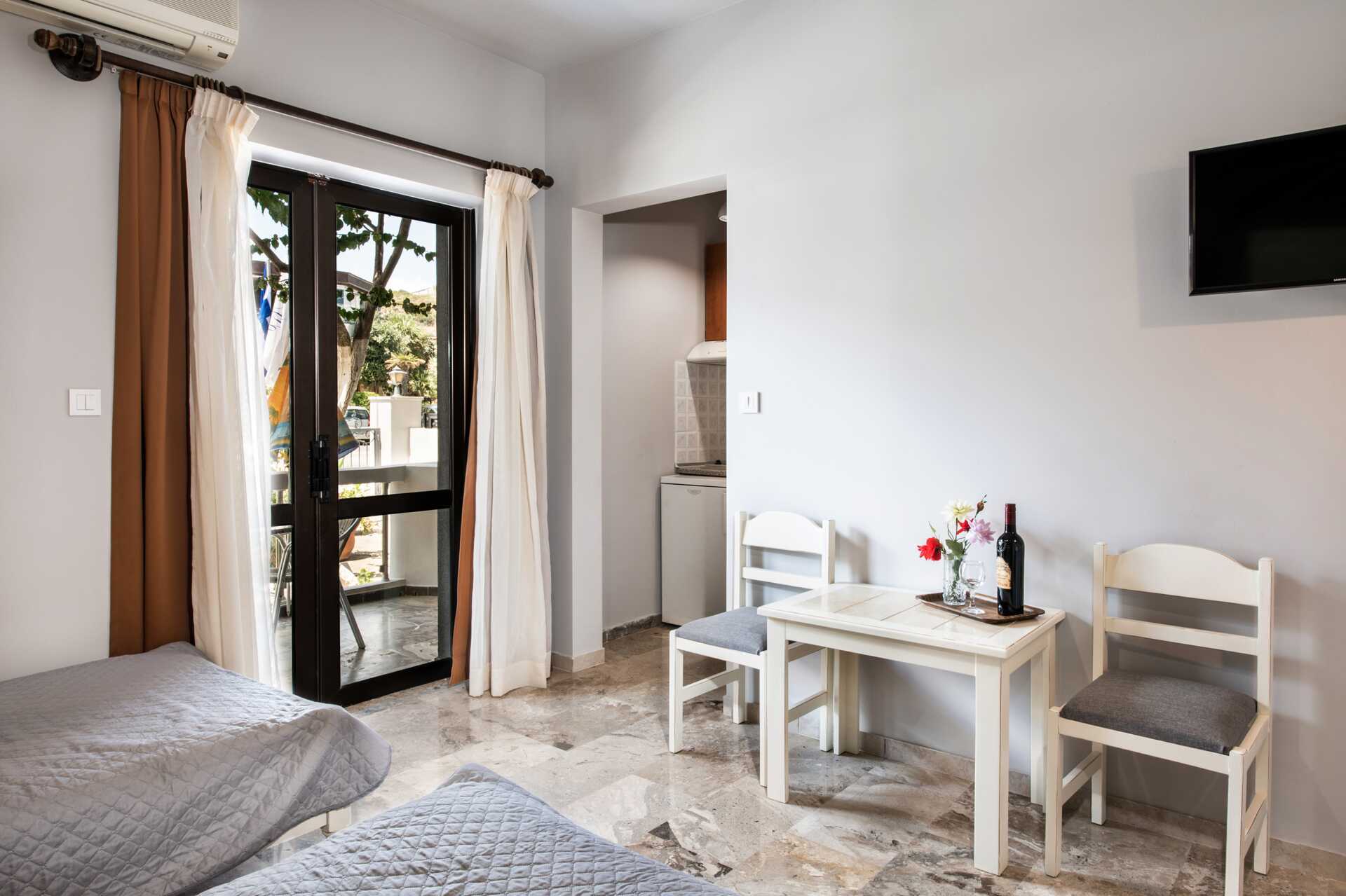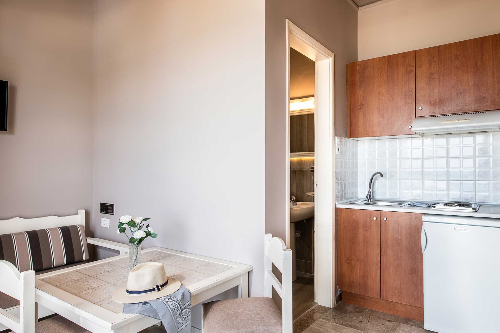 Ettromsleilighet med balkong eller terrasse, noen med begrenset havutsikt. Minikjøkken. Én enkeltseng eller to enkeltsenger. Minikjøkken med kokeplater, kjøleskap, kaffetrakter, vannkoker og enkelt kjøkkenutstyr. Wifi inkludert. Luftkondisjonering og safe mot avgift. TV. Hårføner. Baderom med dusj og wc. Rengjøring 6 ggr/uke.
