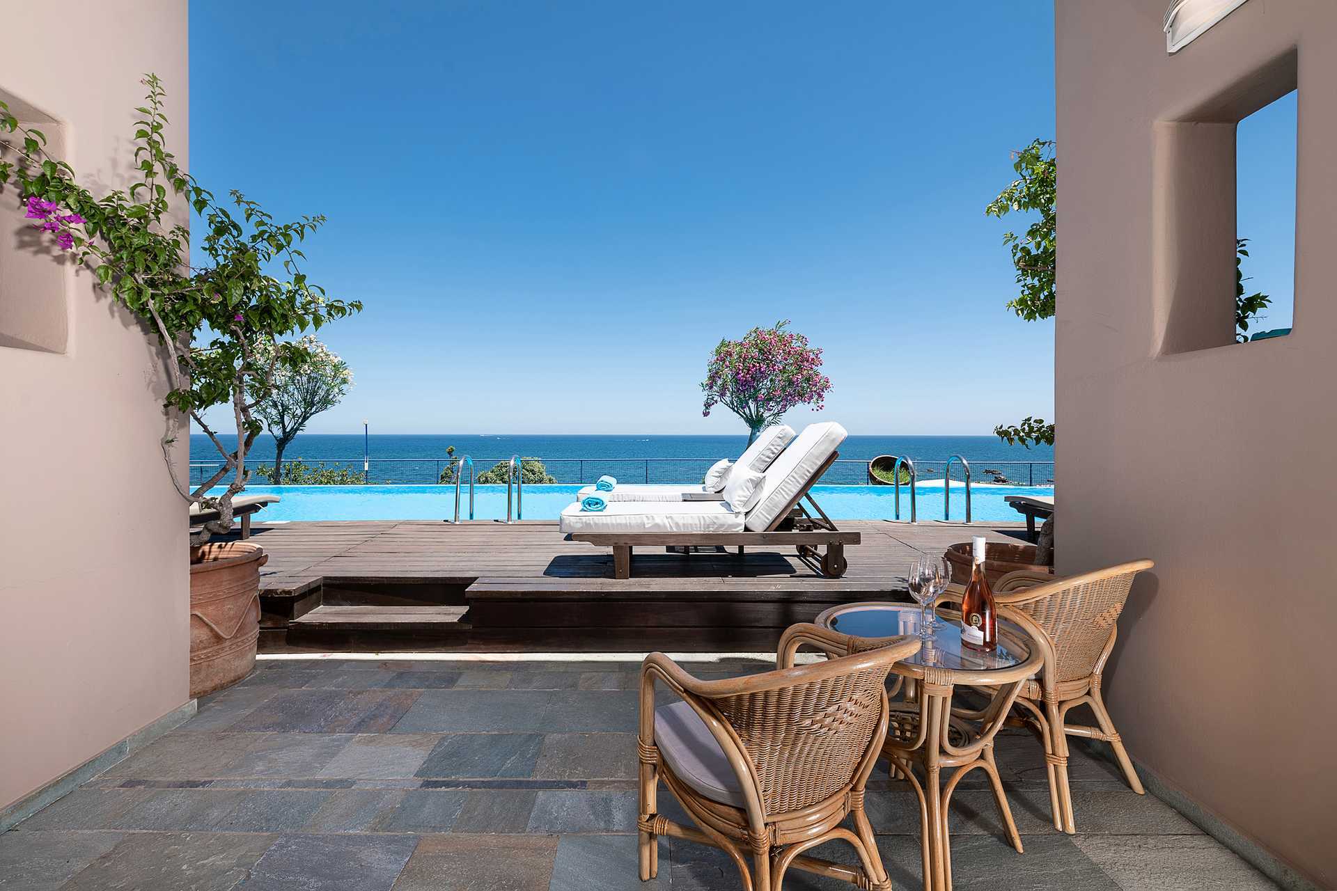 Superiorrom med delt basseng, markterrasse og havutsikt. Aldersgrense for å bo i denne romkategorien er 16 år. En dobbeltseng. Wifi, luftkondisjonering og safe inkludert. Minibar. Vannkoker samt kaffe og te. TV. Badekåper og tøfler. Hårføner. Badekar og wc. Rengjøring 7 ggr/uke. Barn under 2 år regnes inn i maksantallet i rommet.