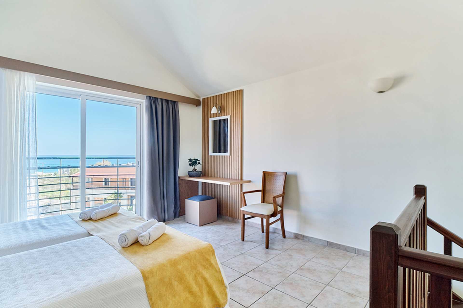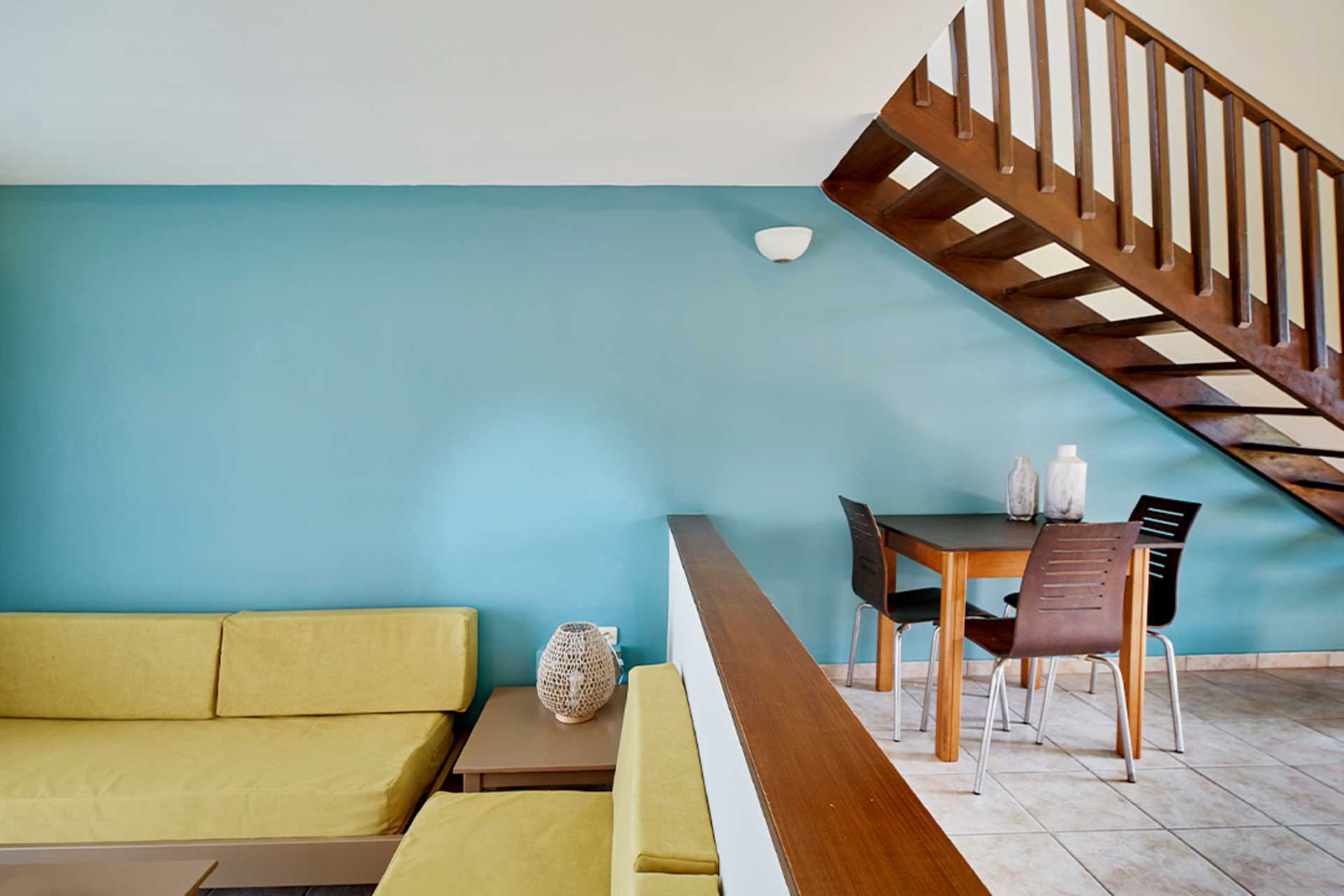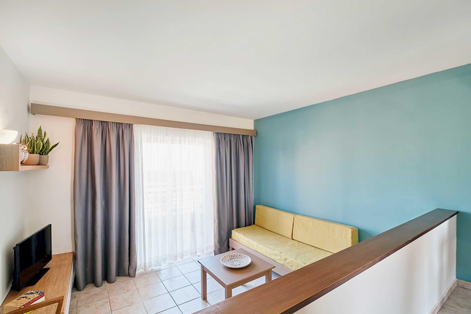 Toromsleilighet i etasje med balkong og bassengutsikt. I første etasje er det stue med to sovesofaer kombinert med minikjøkken og bad med hårføner, badekar eller dusj og wc samt balkong. En trapp opp er det en hems med to enkeltsenger, bad med hårføner, badekar eller dusj, wc og balkong. Det er åpent mellom etasjene. Wifi, luftkondisjonering og safe inkludert. Minikjøkken med kokeplater, kjøleskap, kaffetrakter, mikrobølgeovn, vannkoker, brødrister og enkel kjøkkenutstyr. TV. Rengjøring 6 ggr/uke.