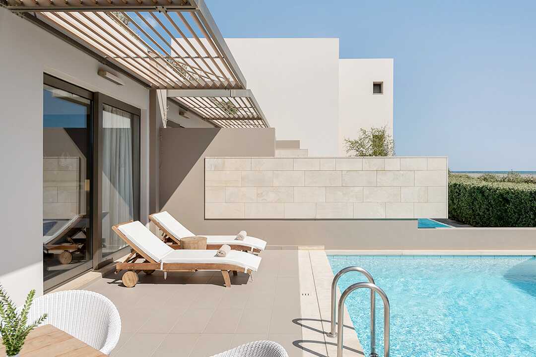 Deluxesuite med eget basseng og stor markterrasse. Stige ned i bassenget. Solsenger samt stoler og bord på terrassen. Suitene består av et soverom og en stue adskilt med en skyvedør. Soverom med en dobbeltseng og bad med badekar og separat dusj samt wc i tilslutning. Mulig med ekstrasenger i sovesofa i stuen. Wc ved stua. Wifi, luftkondisjonering og safe inkludert. Minibar mot avgift. Vannkoker samt kaffe og te. TV. Hårføner. Badekåper og tøfler. Rengjøring 7 ggr/uke. Barn under to år regnes inn i det maksimale antallet personer i rommet.