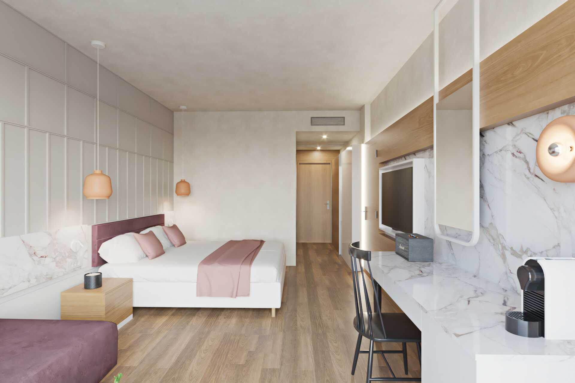 Familierom med balkong eller terrasse. En dobbeltseng. Mulig med en ekstraseng i sovesofa. Wifi, luftkondisjonering og safe inkludert. Minibar mot avgift. Vannkoker samt kaffe og te. TV. Hårføner. Badekåper og tøfler. Bad med badekar, separat dusj og wc. Rengjøring 7 ggr/uke. Barn under 2 år regnes inn i maksantallet i rommet.
