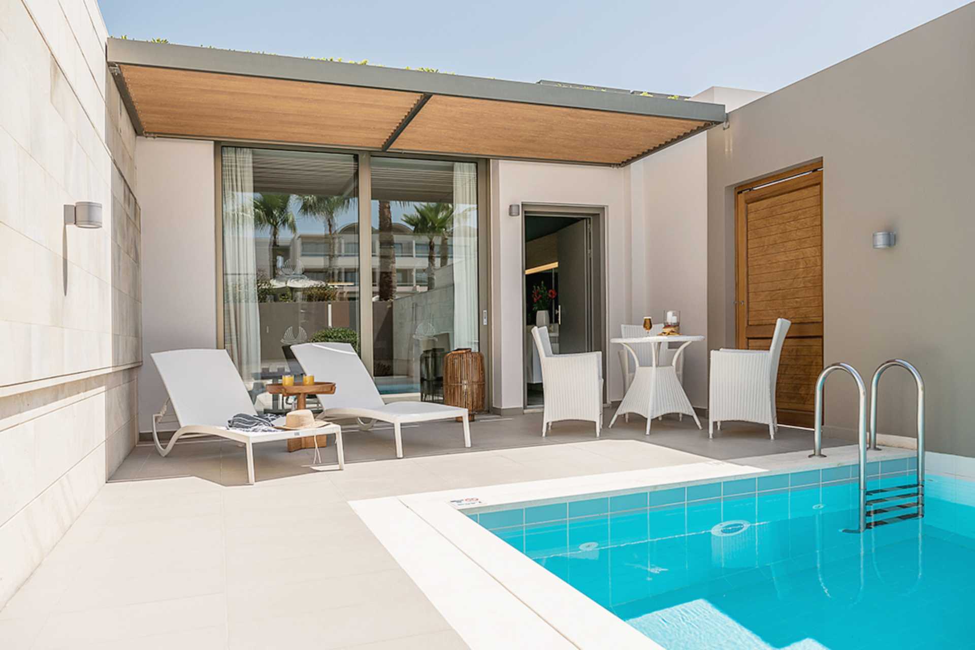 Dobbeltrom med privat basseng med markterrasse. Stige ned i bassenget. Solsenger samt stoler og bord på terrassen. En dobbeltseng eller to enkeltsenger. Wifi, luftkondisjonering og safe inkludert. Minibar mot avgift. Vannkoker samt kaffe og te. TV. Hårføner. Badekåper og tøfler. Bad med badekar, separat dusj og wc. Rengjøring 7 ggr/uke. Barn under 2 år regnes inn i maksantallet i rommet.