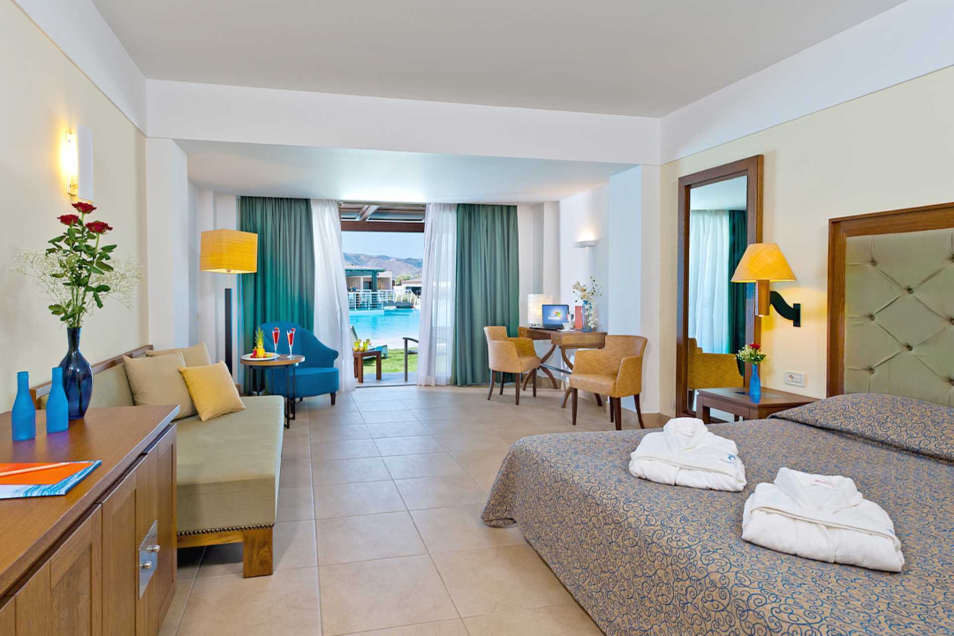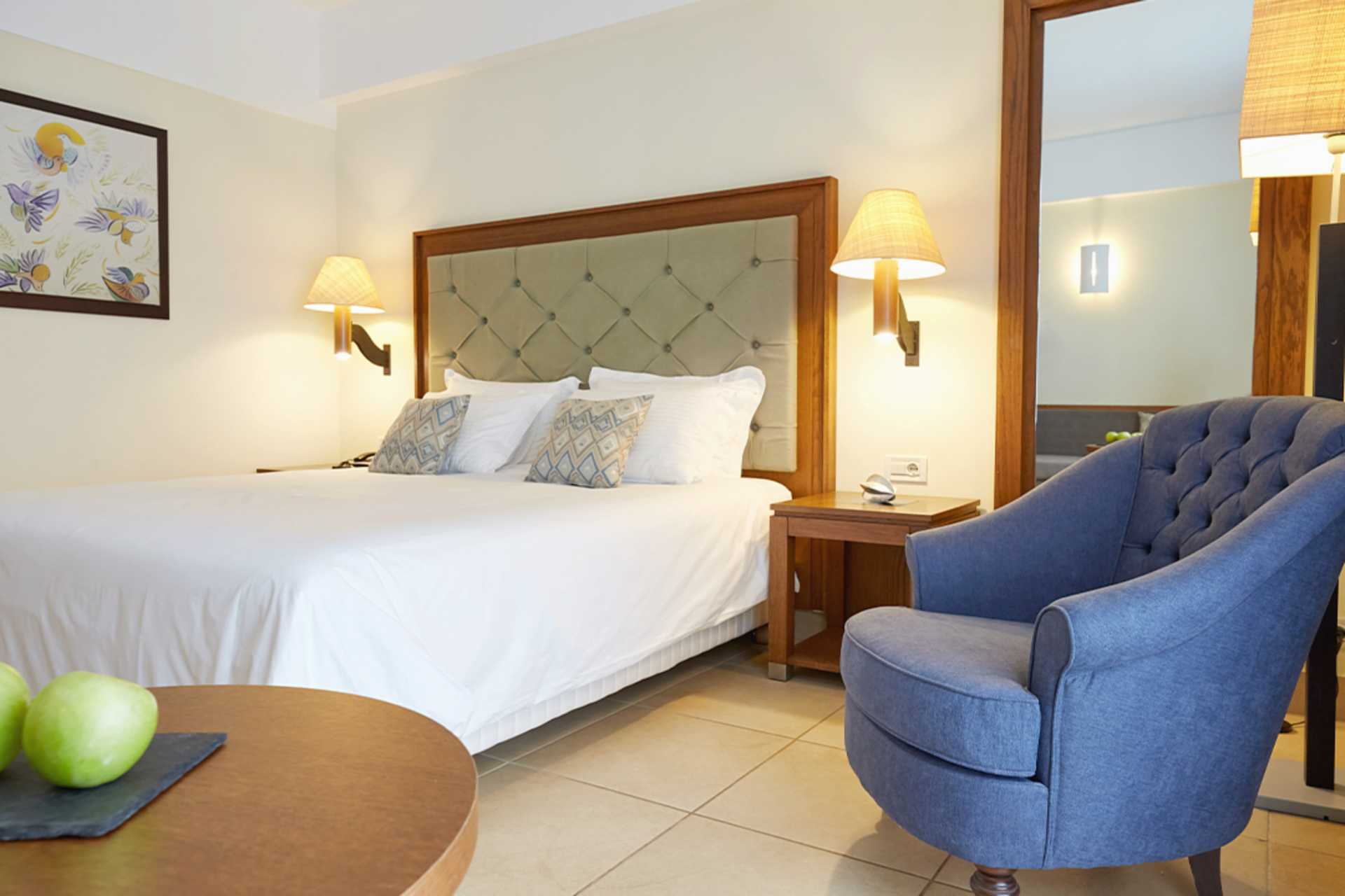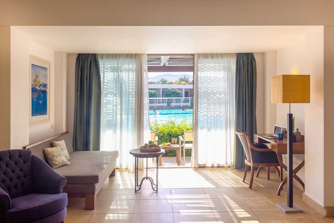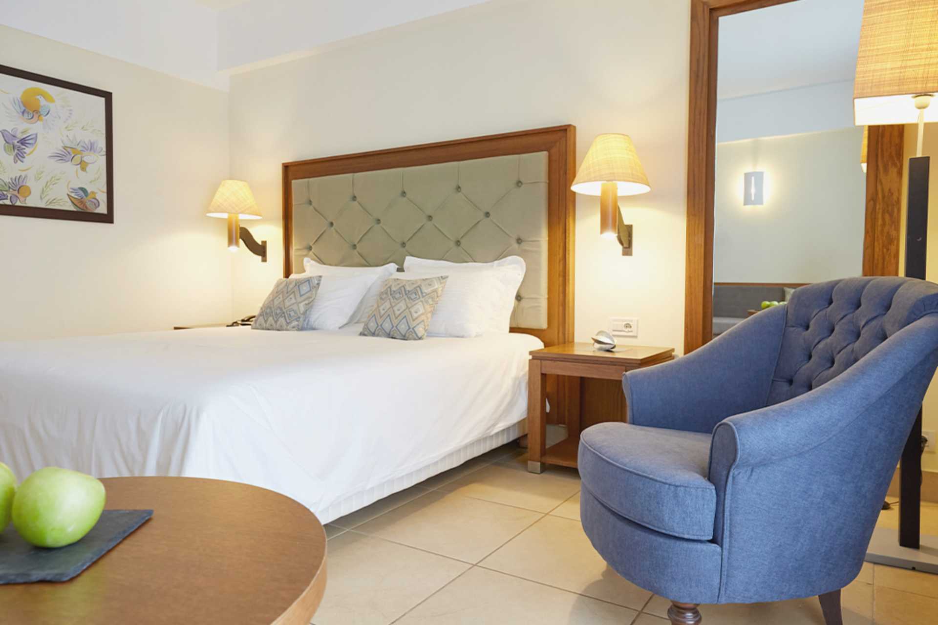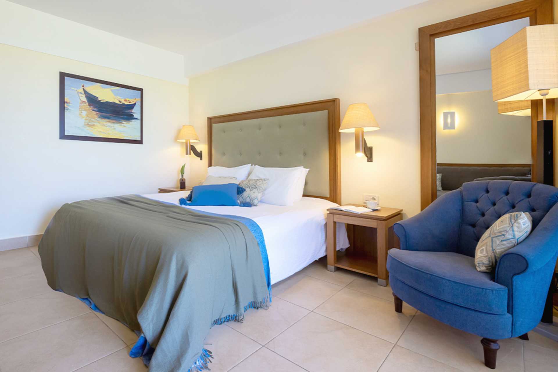 Juniorsuiter med direkte utgang til det store fellesbassenget fra terrassen, begrenset havutsikt. På terrassen er det to solsenger og et bord og stoler. En dobbeltseng. Mulig med en ekstraseng i sovesofa. Wifi, luftkondisjonering og safe inkludert. Minibar. Vannkoker samt kaffe og te. Espresso kaffemaskin, kapsler mot avgift. TV. Badekåper og tøfler Hårføner. Badekar, dusj og wc. Rengjøring 7 ggr/uke.