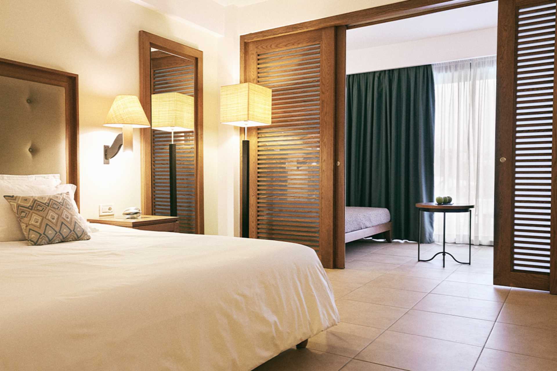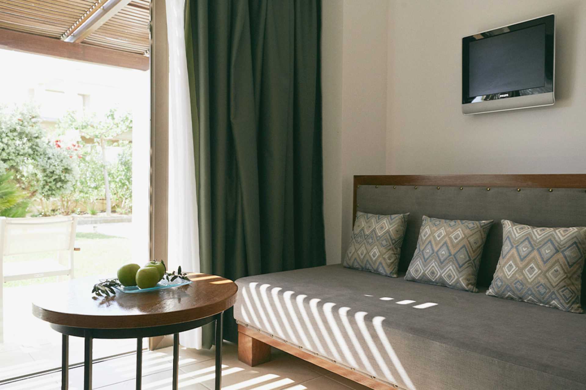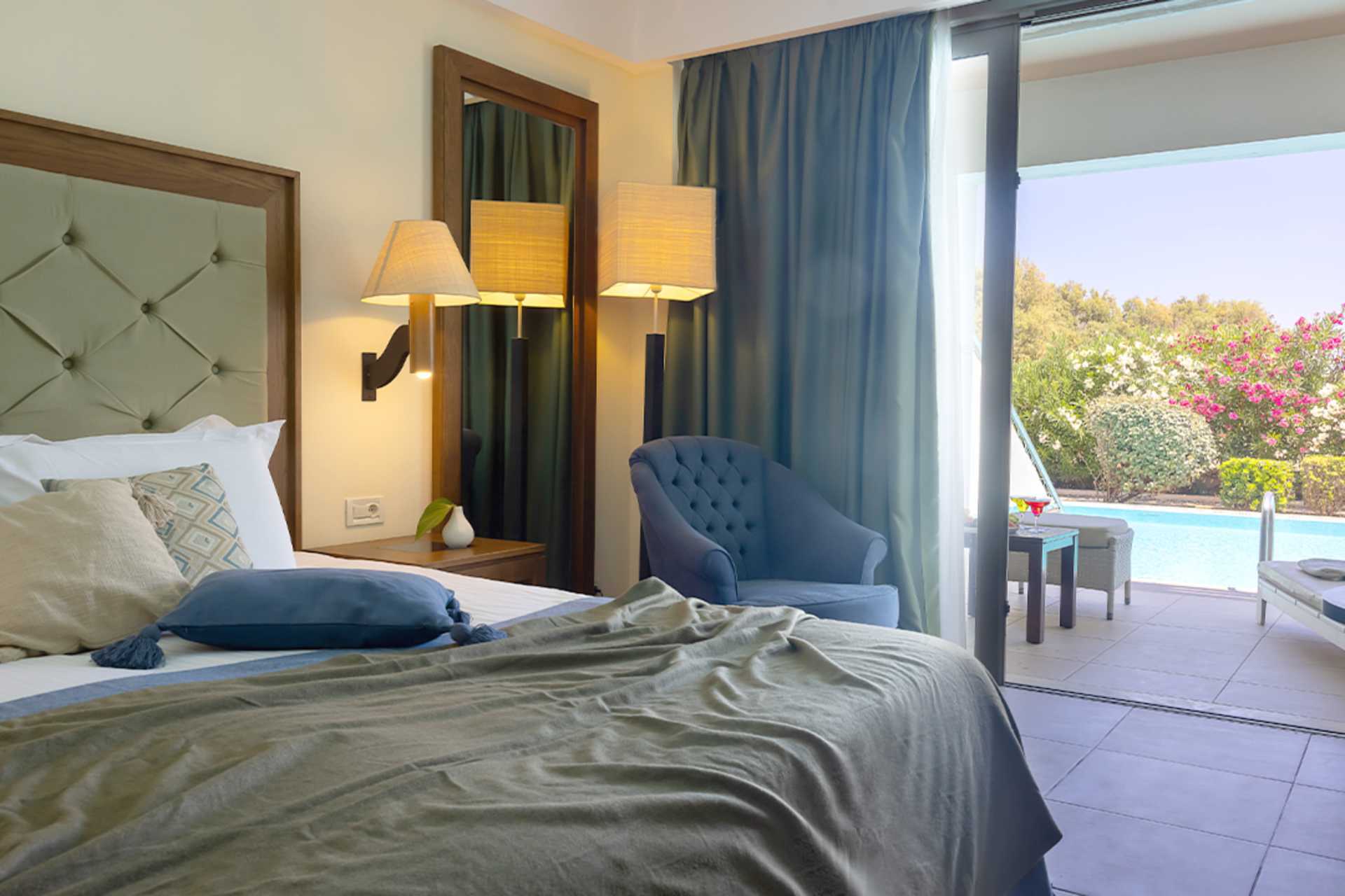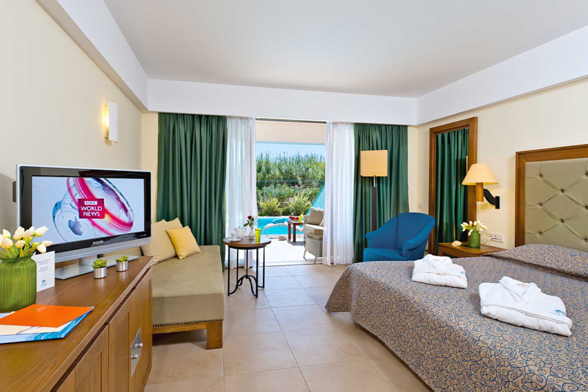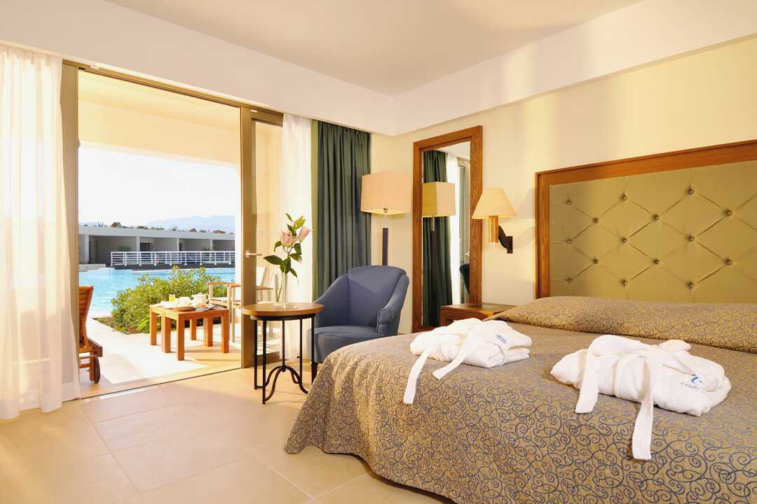 Juniorsuiter med direkte utgang til det store fellesbassenget fra terrassen, begrenset havutsikt. På terrassen er det to solsenger og et bord og stoler. En dobbeltseng. Mulig med en ekstraseng i sovesofa. Wifi, luftkondisjonering og safe inkludert. Minibar. Vannkoker samt kaffe og te. Espresso kaffemaskin, kapsler mot avgift. TV. Badekåper og tøfler Hårføner. Badekar, dusj og wc. Rengjøring 7 ggr/uke.