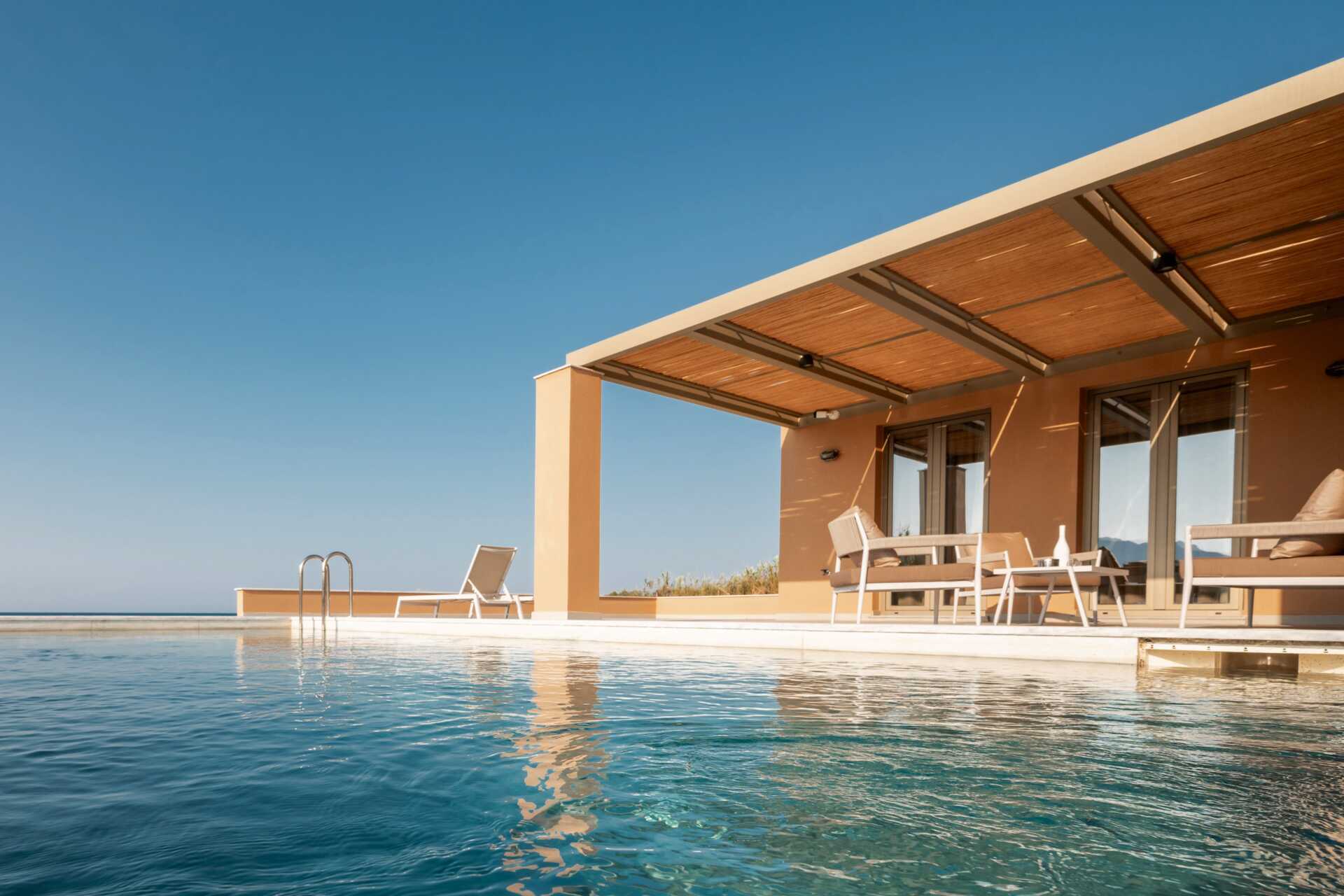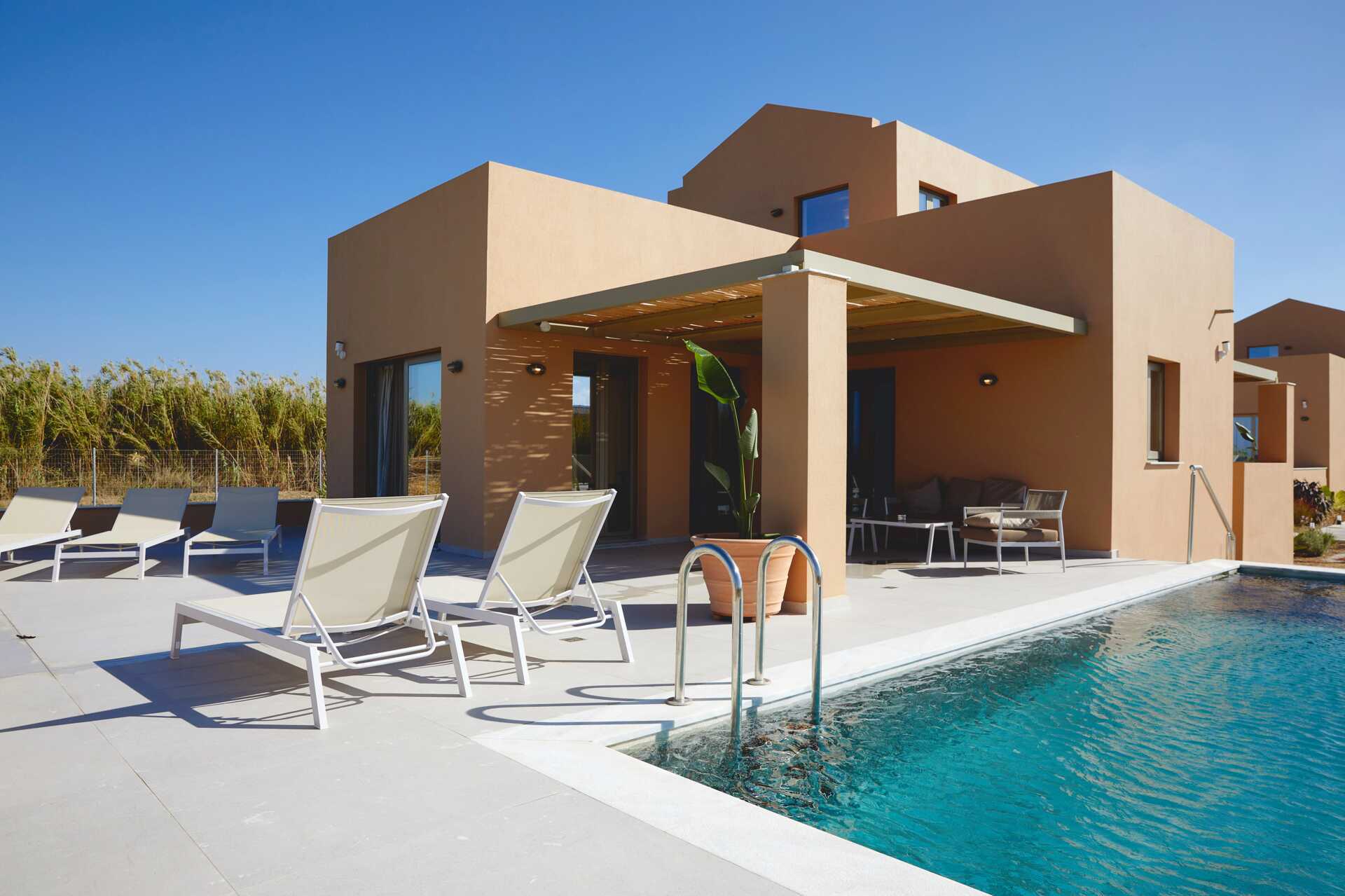 Giannoulis Ele Villas består av to treromsvillaer med balkong og terrasse, med havutsikt eller mot havet. På terrassen er det et privat basseng på 30 kvadratmeter med solsenger og parasoller og det er også solsenger og parasoller på stranden hvis inkludert. Basseng- og strandhåndklær inkludert. To pergolaer hvor du kan hvile og spise middagen i skyggen.