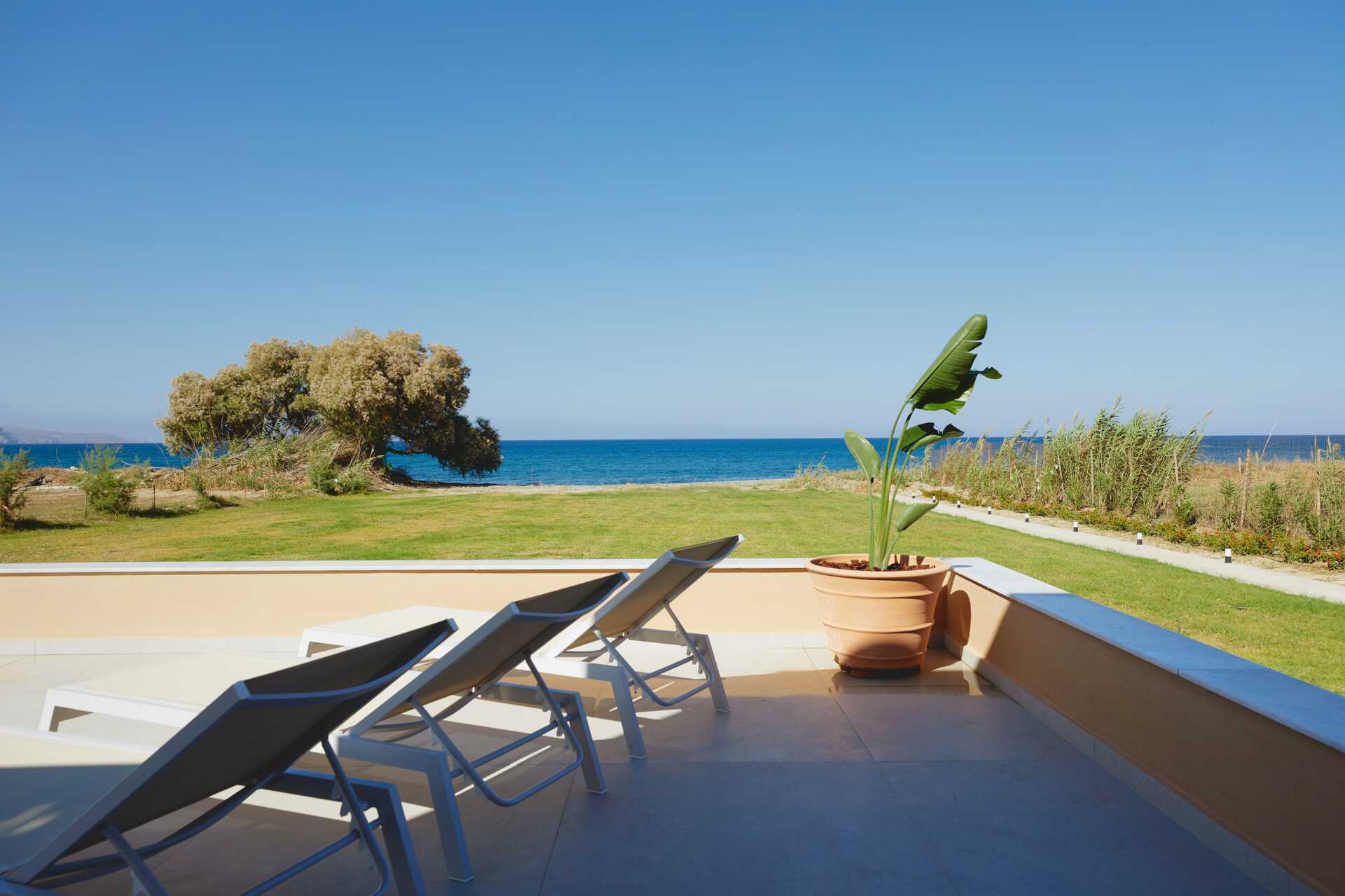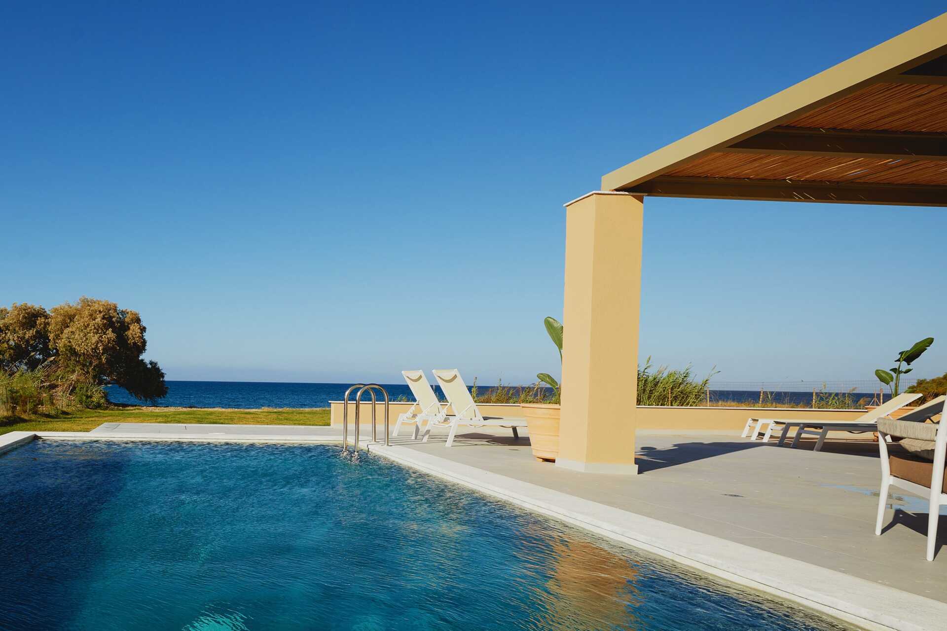 Treroms villa med balkong og terrasse mot havet. På terrassen er det et basseng på 30 kvm (dybde 140 cm) med solsenger og parasoller og bassenghåndklær. To pergolaer hvor du kan hvile og spise middagen i skyggen. Hotellet kaller villaen Giannoulis Ele Mare. Wifi, luftkondisjonering og safe inkludert. Vaskemaskin og tørketrommel. Strykejern og strykebrett. Rengjøring 6 ggr/uke. Rengjørings- og vaskeutstyr samt oppvask- og rengjøringsmidler.