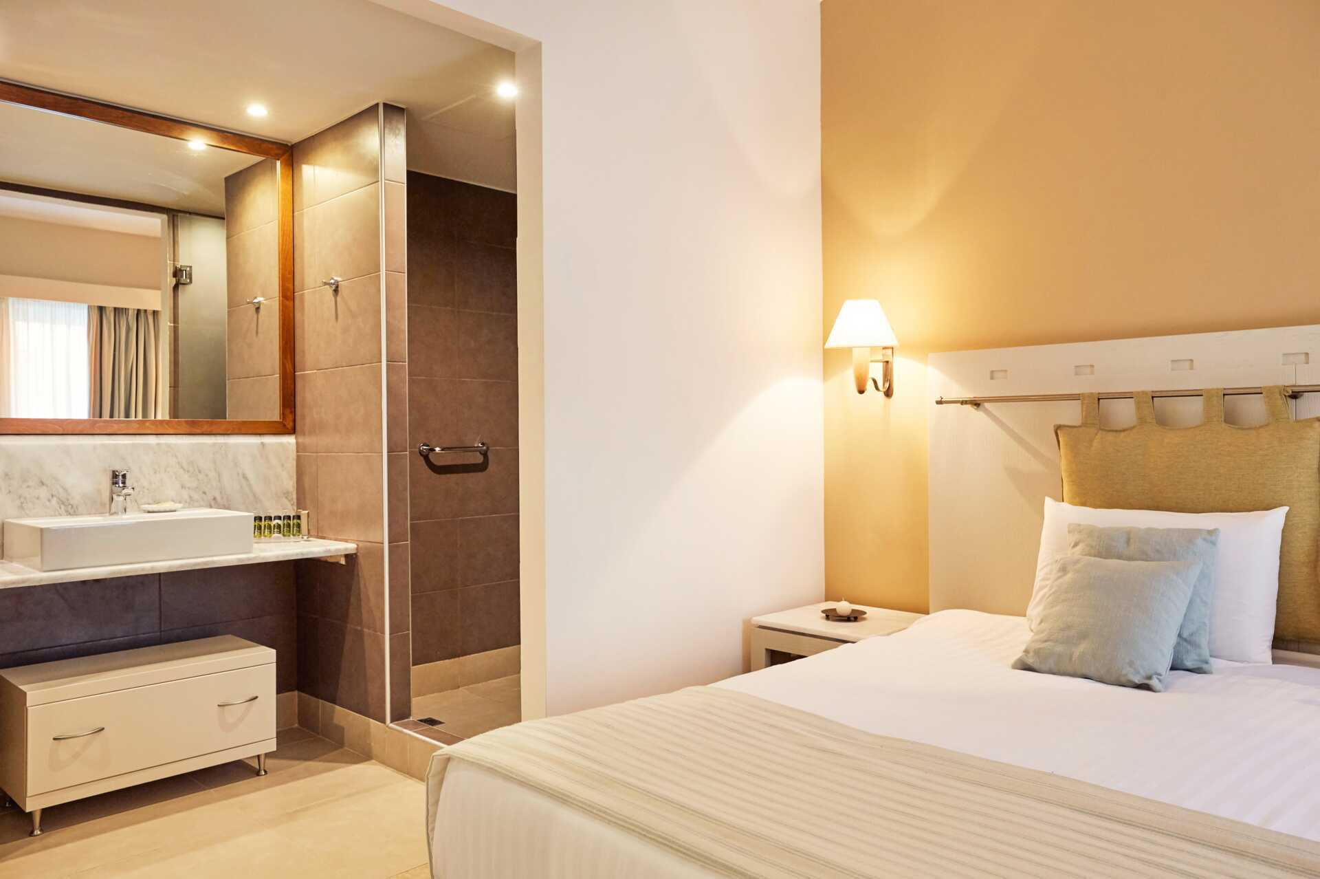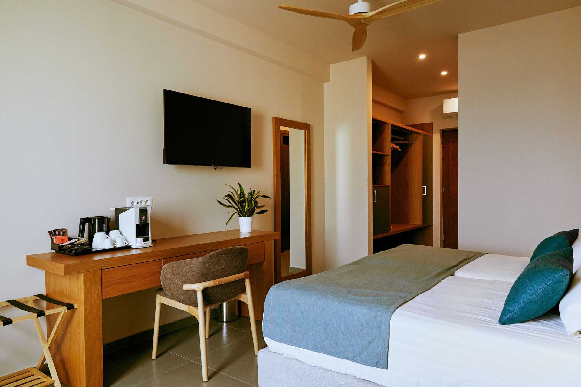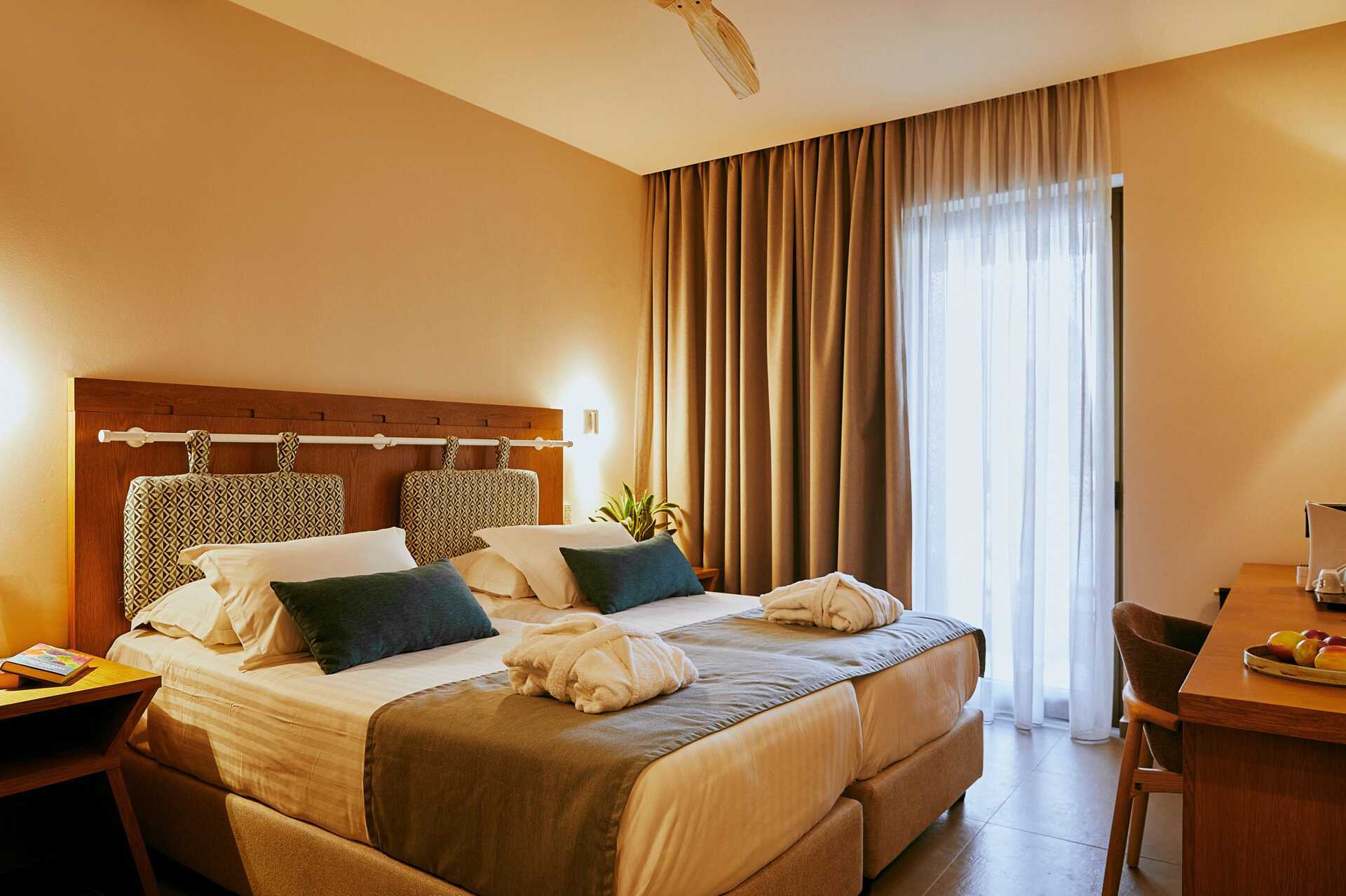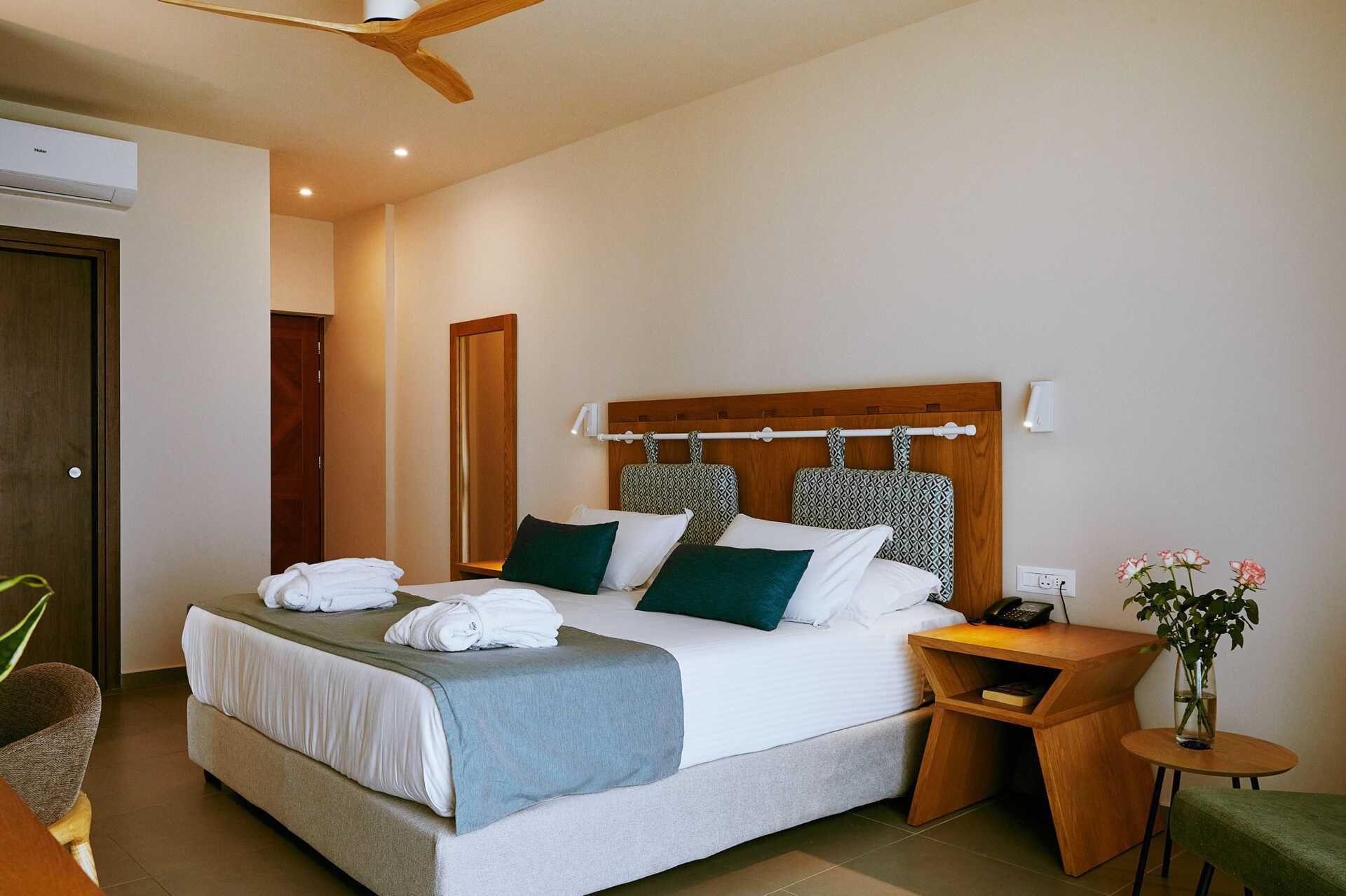 Dobbeltrom med delt basseng fra markterrassen, noen har havutsikt. Solsenger og parasoller på uteplassen. Noen få skritt opp til terrassen. En dobbeltseng eller to enkeltsenger. Wifi, luftkondisjonering og safe inkludert. Minibar mot tillegg. Espresso kaffemaskin, kapsler inkludert og etterfylles daglig. TV. Badekåper og tøfler Hårføner. Baderom med badekar eller dusj samt wc. Rengjøring 7 ggr/uke.