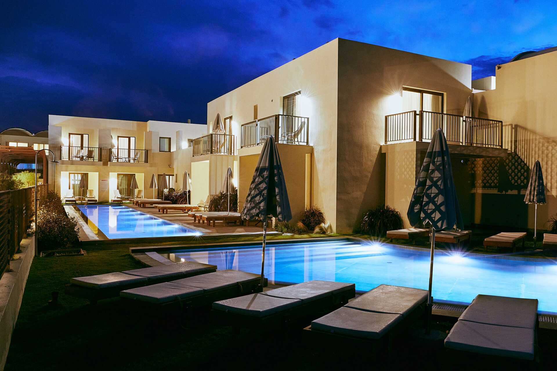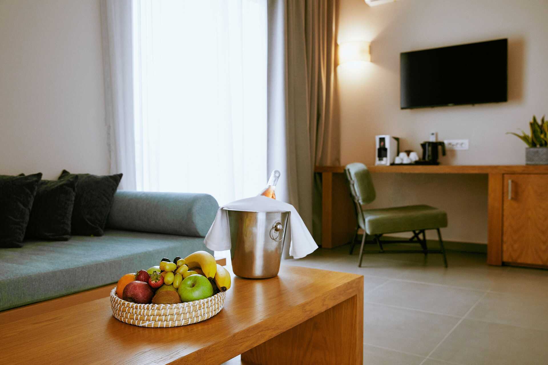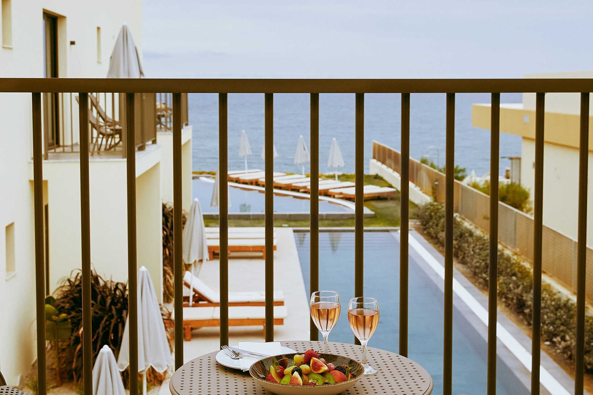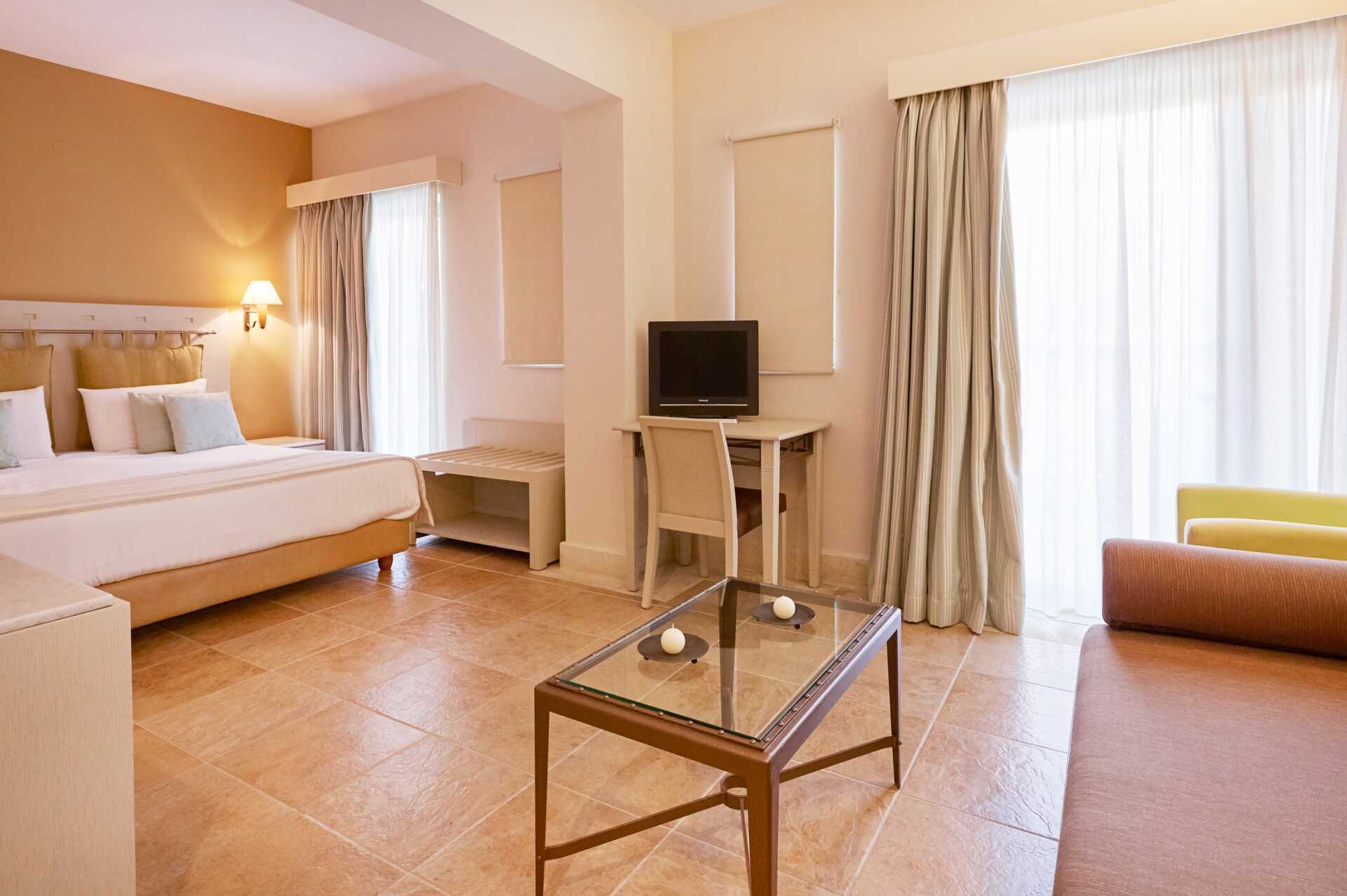 Juniorsuiter med tilgang til basseng og havutsikt fra markterrassen. Det er noen få trinn opp til terrassen hvor solsenger og parasoller er tilgjengelige. En dobbeltseng eller to enkeltsenger. Mulig med en ekstraoppredning i sovesofa. Det er også salongbord og et lite kjøkkenbord med et par stoler i rommet. Wifi, luftkondisjonering og safe inkludert. Minibar mot tillegg. Espresso kaffemaskin, kapsler inkludert og etterfylles daglig. TV. Badekåper og tøfler Hårføner. Baderom med badekar eller dusj samt wc. Rengjøring 7 ggr/uke.