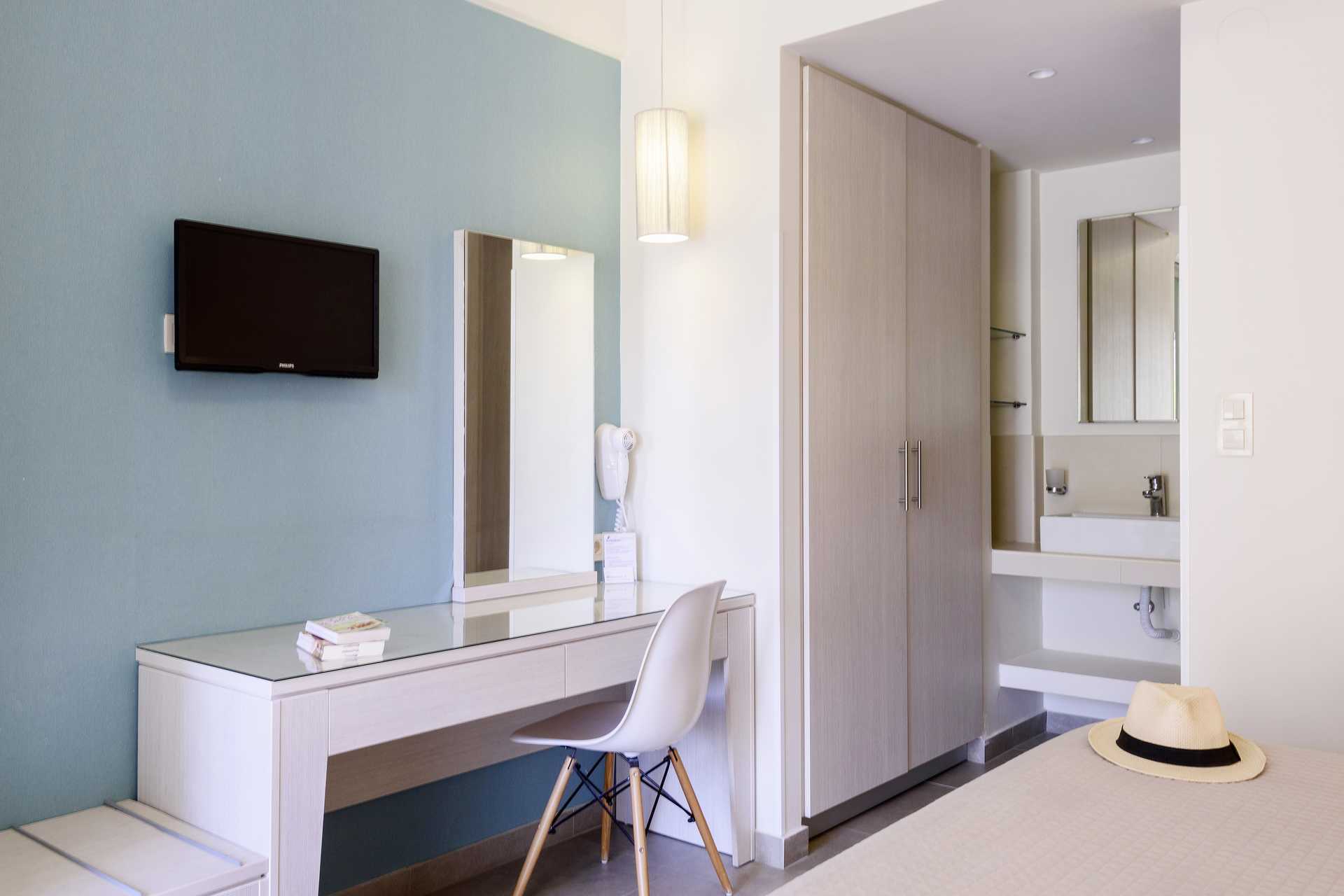 Ettromsleilighet med balkong eller terrasse. Leilighetene ligger både i hovedbygningen og sidebygningen, cirka 250 meter unna. Minikjøkken. En dobbeltseng eller to enkeltsenger. Mulig med en ekstraseng i sovesofa. Minikjøkken med kjøleskap, kokeplater, kaffetrakter, vannkoker og enkelt kjøkkenutstyr. Wifi, luftkondisjonering og safe inkludert. TV. Myggnetting i balkongdørene. Hårføner. Badekar eller dusj samt wc. Rengjøring 7 ggr/uke.