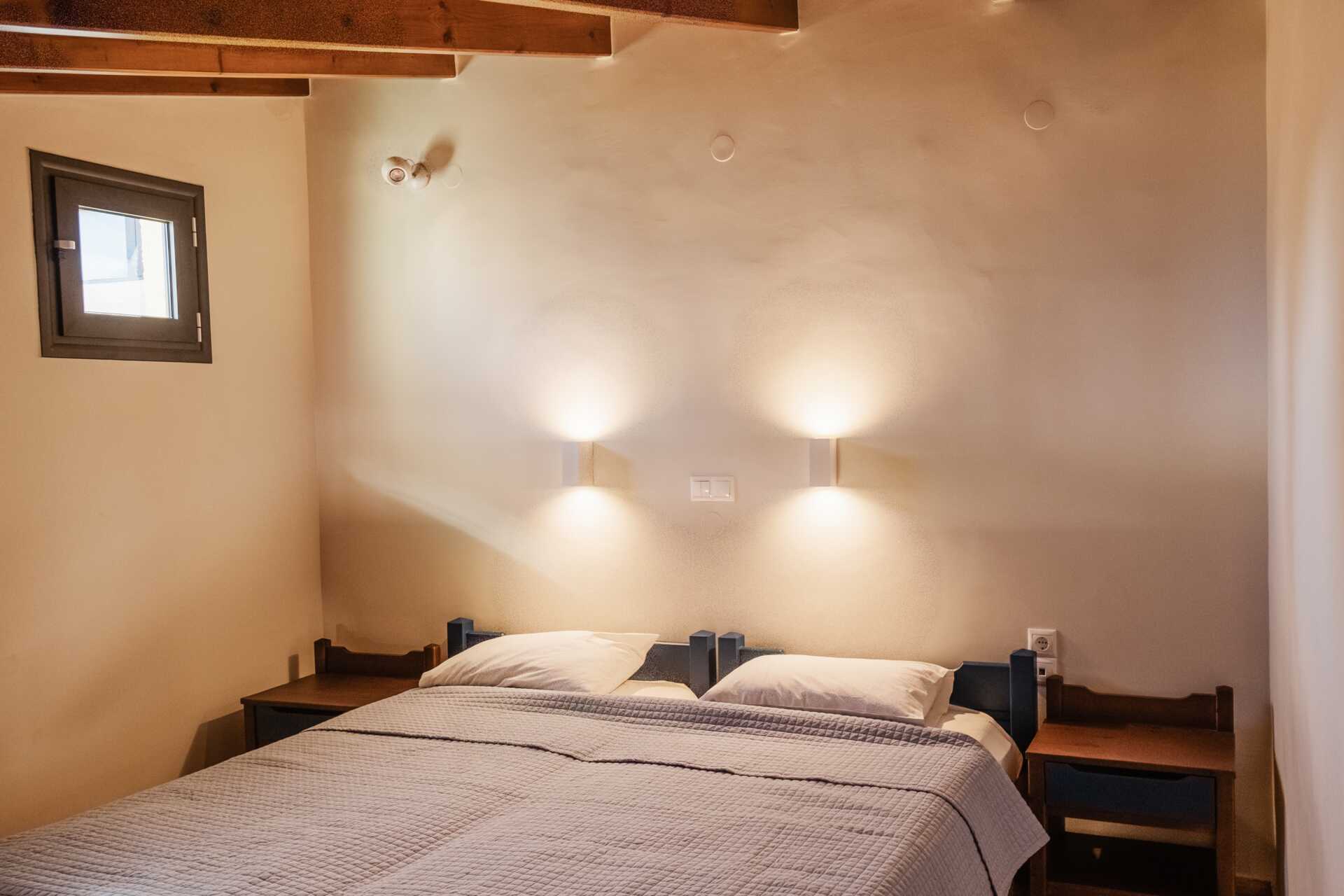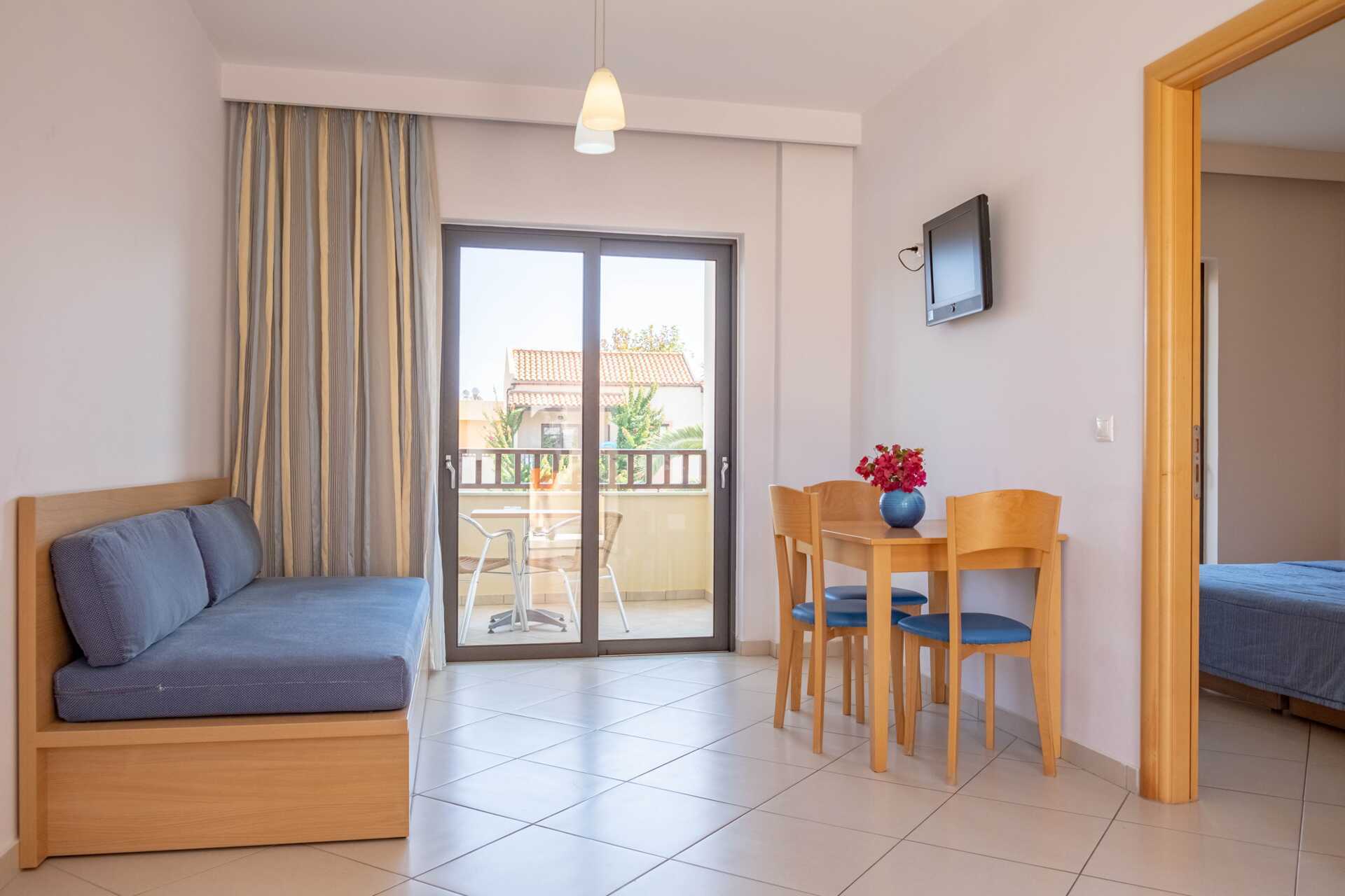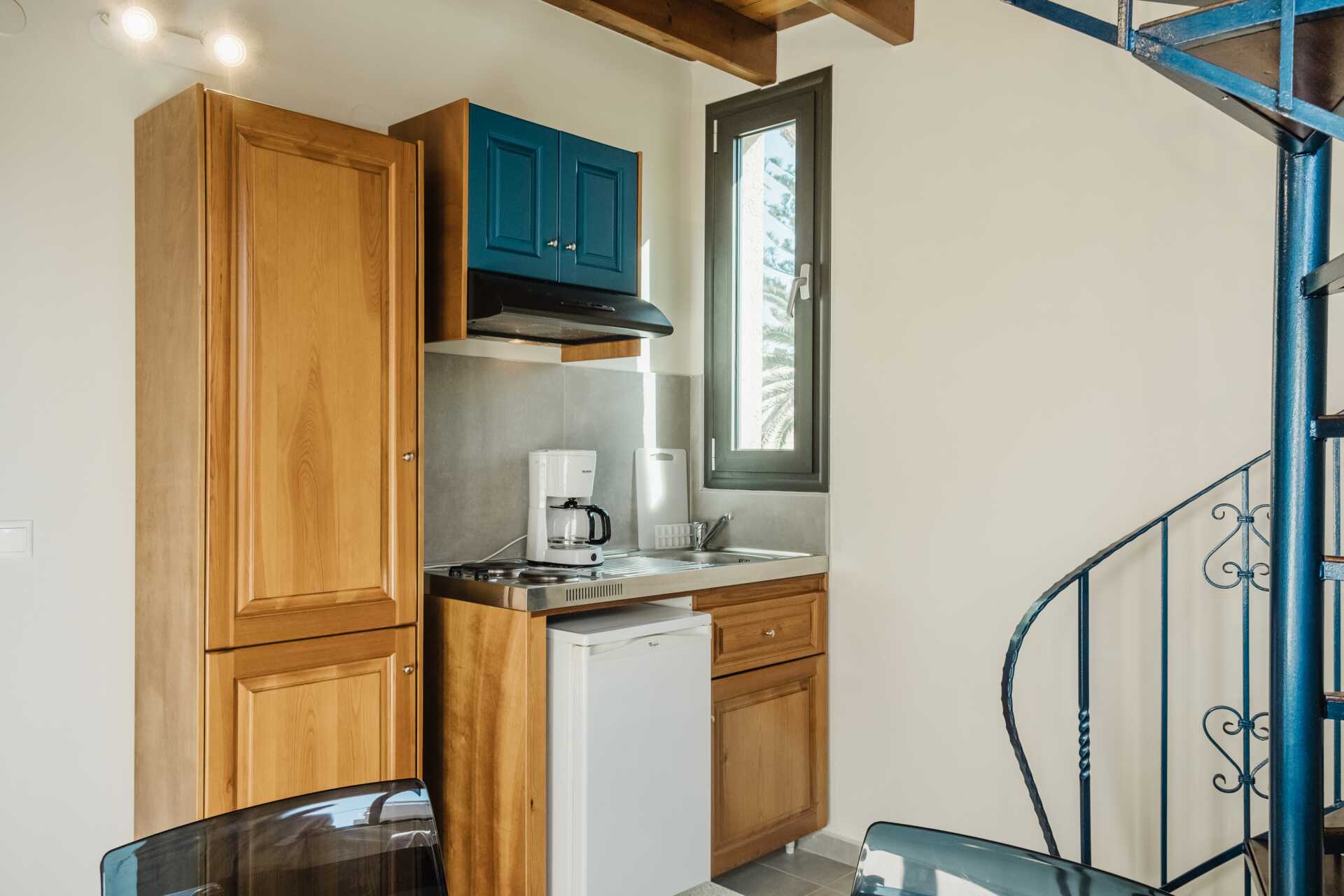Ettromsleilighet i etasje med balkong. Leiligheten ligger i andre etasje i den eldre delen av hotellet. I første etasje er det stue kombinert med minikjøkken og bad. En sovehems med to enkeltsenger. En smal og bratt spiraltrapp fører opp til sovehemsen. Å komme seg opp og ned trappene kan være vanskelig for små barn og personer med balanse- og/eller gangvansker. Minikjøkken med kokeplater, kjøleskap, brødrister og enkelt kjøkkenutstyr. Wifi, luftkondisjonering og safe inkludert. TV. Hårføner. Baderom med dusj og wc. Rengjøring 6 ggr/uke.