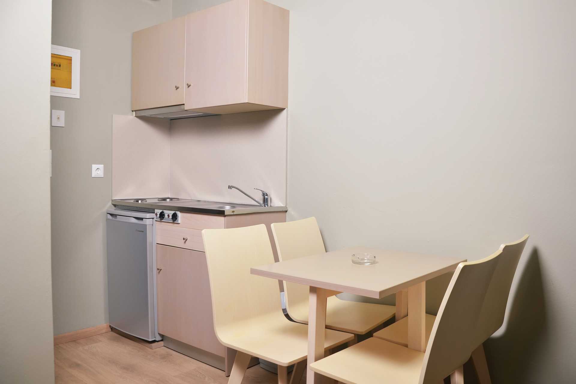 Ettromsleilighet med balkong, markbalkong eller markterrasse. En av leilighetene har nivåforskjell/trappetrinn inne i leiligheten. Noen av leilighetene ligger i hovedbygningen og nås via trapper fra resepsjonen. Det er ikke heis på hotellet. Dette gjelder også leilighetene som har markbalkong. Kombinert soverom og minikjøkken. En dobbeltseng eller to enkeltsenger. Mulig med ekstrasenger i en sovesofa eller en oppredbar lenestol. Minikjøkken med kjøleskap, kokeplater, kaffetrakter, vannkoker, brødrister og enkelt kjøkkenutstyr. Wifi, luftkondisjonering og safe inkludert. TV med lokale kanaler. Badekar eller dusj samt wc. Rengjøring 6 ggr/uke.