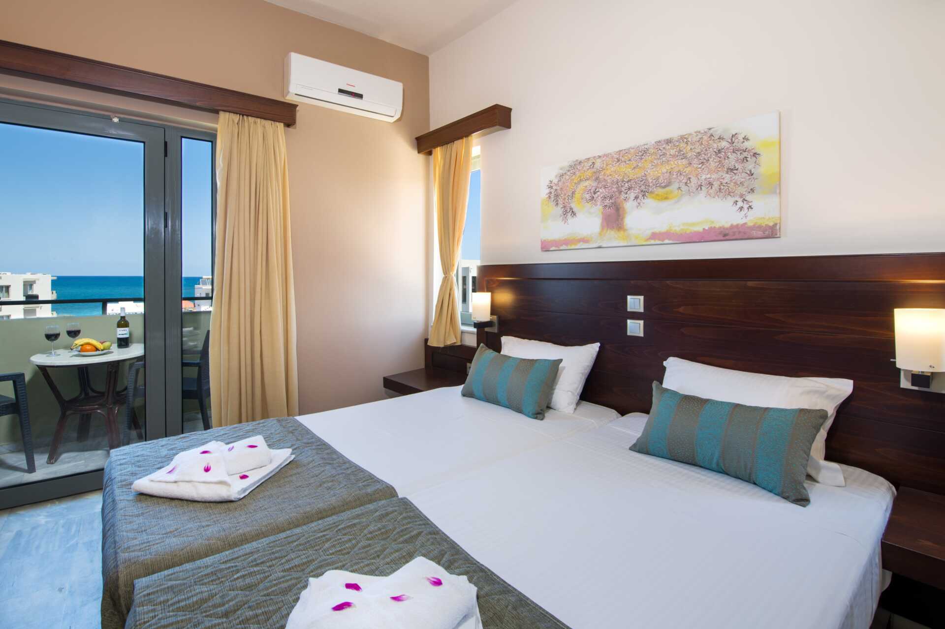 Toromsleiligheter som ligger i strand-/poolbygningen. Balkong, noen med havutsikt eller begrenset havutsikt. Ett soverom og kombinert stue/minikjøkken. To enkeltsenger. Mulig med ekstrasenger i to sovesofaer. Leilighetene inkluderer en flaske vin og en flaske vann ved ankomst. Minikjøkken med kjøleskap, kokeplater, kaffetrakter, vannkoker, brødrister og enkelt kjøkkenutstyr. Wifi, luftkondisjonering og safe inkludert. TV. Strykejern og strykebrett. Badekåper og tøfler Hårføner. Baderom med dusj og wc. Rengjøring 6 ggr/uke.