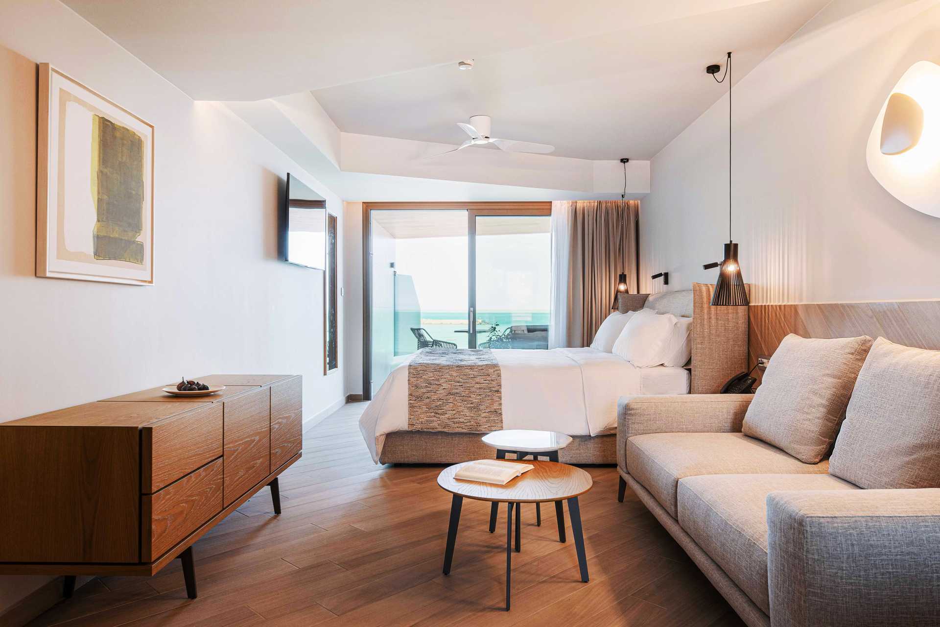 Executivesuite med havutsikt og stor balkong på cirka 15 kvadratmeter med solseng. En dobbeltseng. Sofagruppe. Wifi, luftkondisjonering og safe inkludert. Espressomaskin, kapsler inkludert. Vannkoker og te og kaffe. Kjøleskap. Ved ankomst venter en flaske vin og frisk frukt i suiten. TV. Strykejern og strykebrett. Badekåper og tøfler Hårføner. Dusj og wc. Rengjøring 7 ggr/uke.