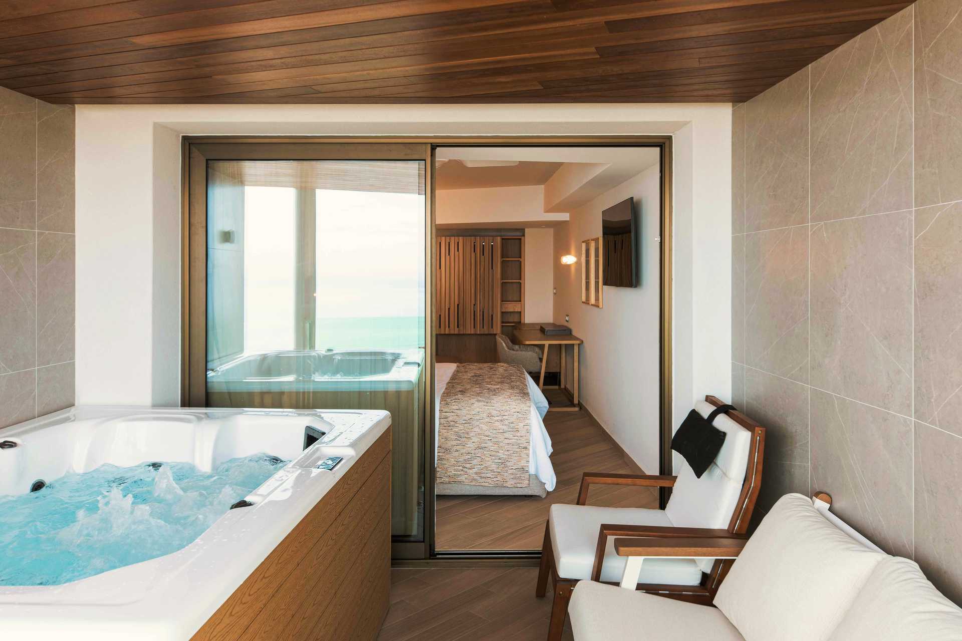 Executivesuiter med havutsikt og romslig balkong på cirka 15 kvadratmeter med jacuzzi. En dobbeltseng. Sofagruppe. Wifi, luftkondisjonering og safe inkludert. Espressomaskin, kapsler inkludert. Vannkoker og te og kaffe. Kjøleskap. Ved ankomst venter en flaske vin og frisk frukt i suiten. TV. Strykejern og strykebrett. Badekåper og tøfler Hårføner. Dusj og wc. Rengjøring 7 ggr/uke.