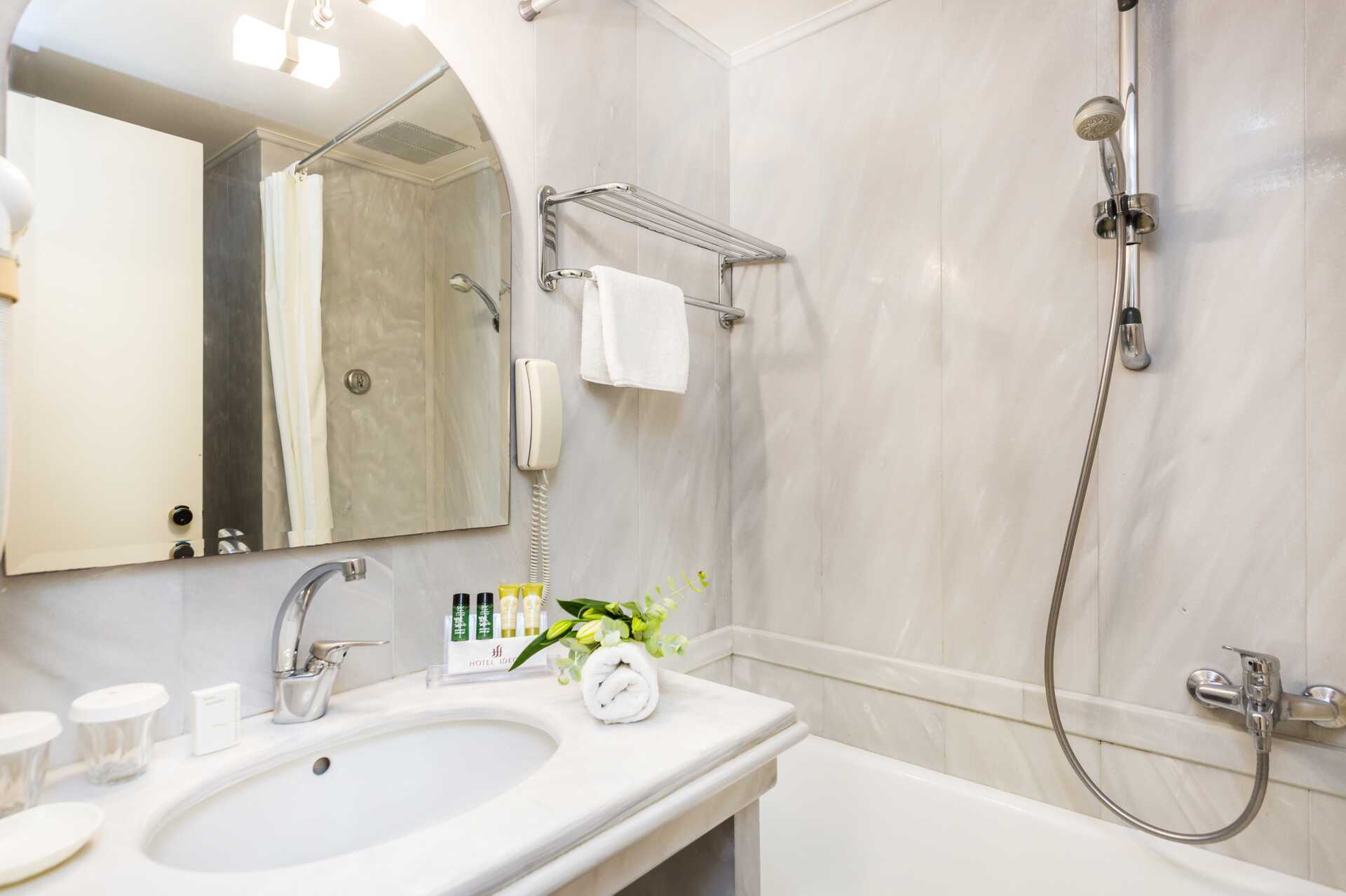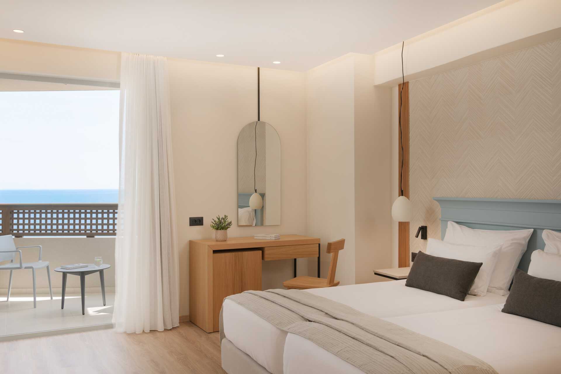 Dobbeltrom med balkong, noen med havutsikt. Rommene ligger i hotellets hovedbygning eller i en sidebygning. Noen dobbeltrom er renoverte, og noen er delvis renoverte. Trapp til noen av dobbeltrommene. En dobbeltseng eller to enkeltsenger. Mulig med ekstraseng i feltseng eller sovesofa. Wifi, safe og luftkondisjonering inkludert. Kjøleskap. TV. Hårføner. Baderom med dusj og wc. Rengjøring 7 ggr/uke.