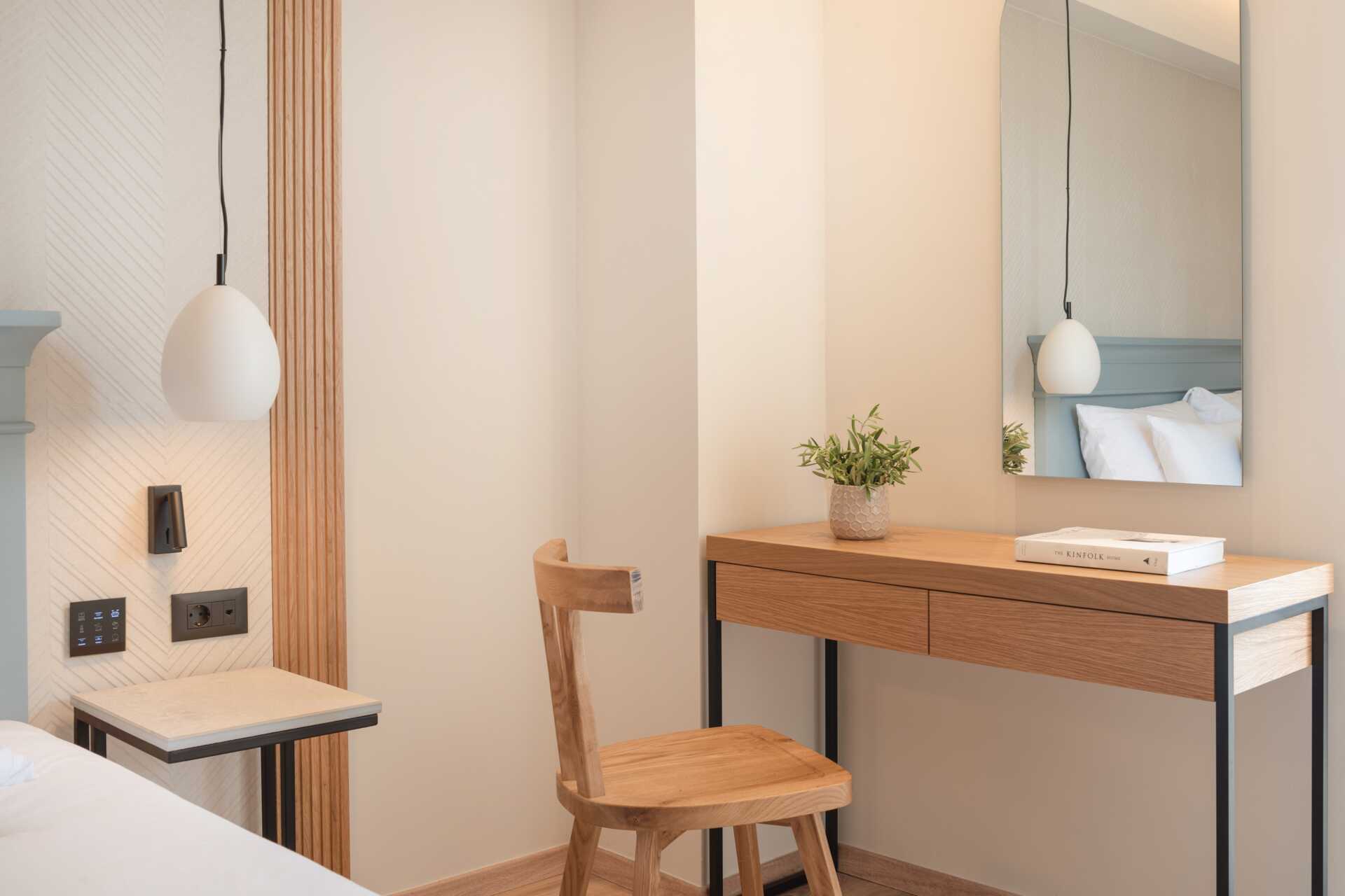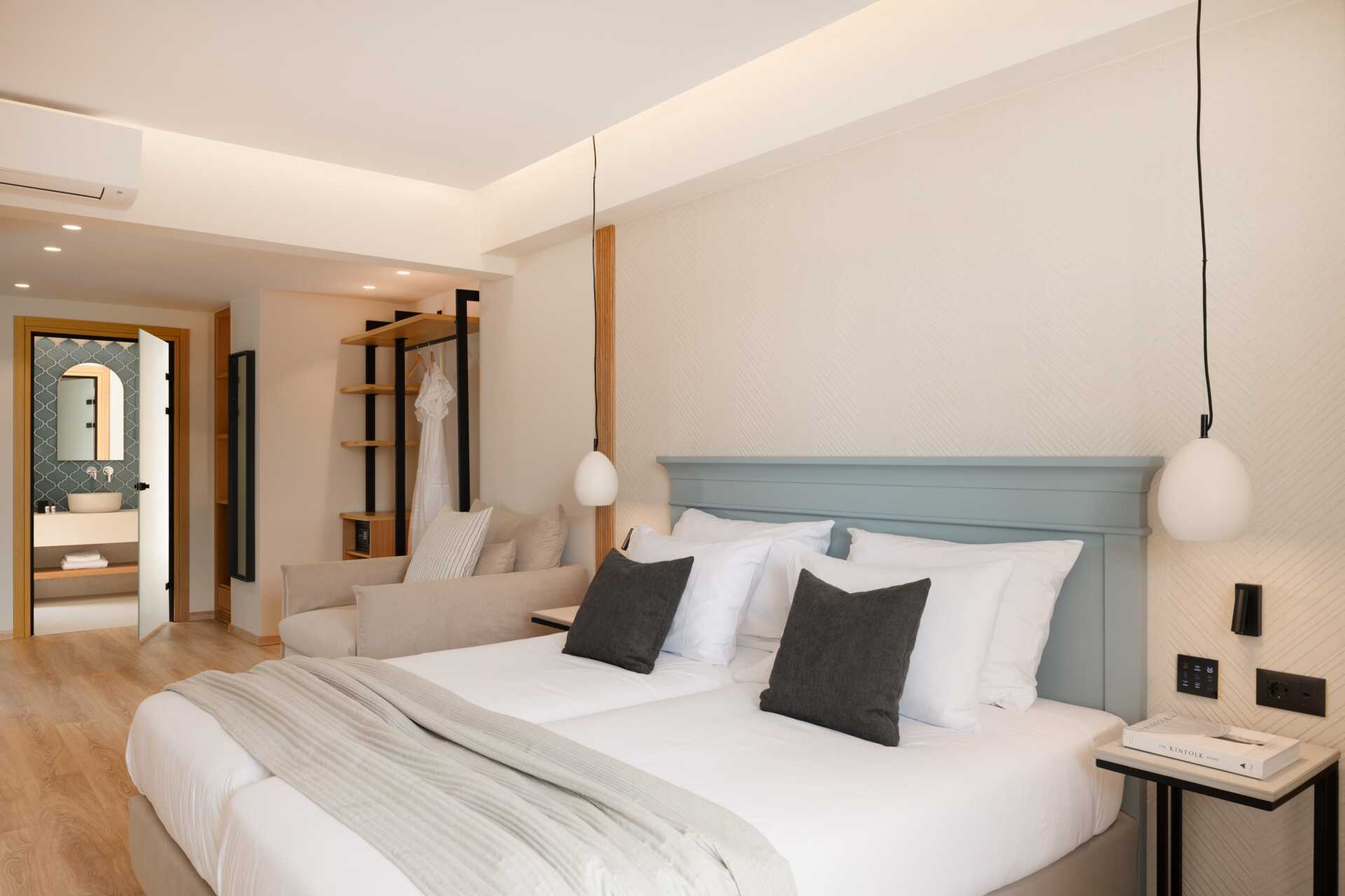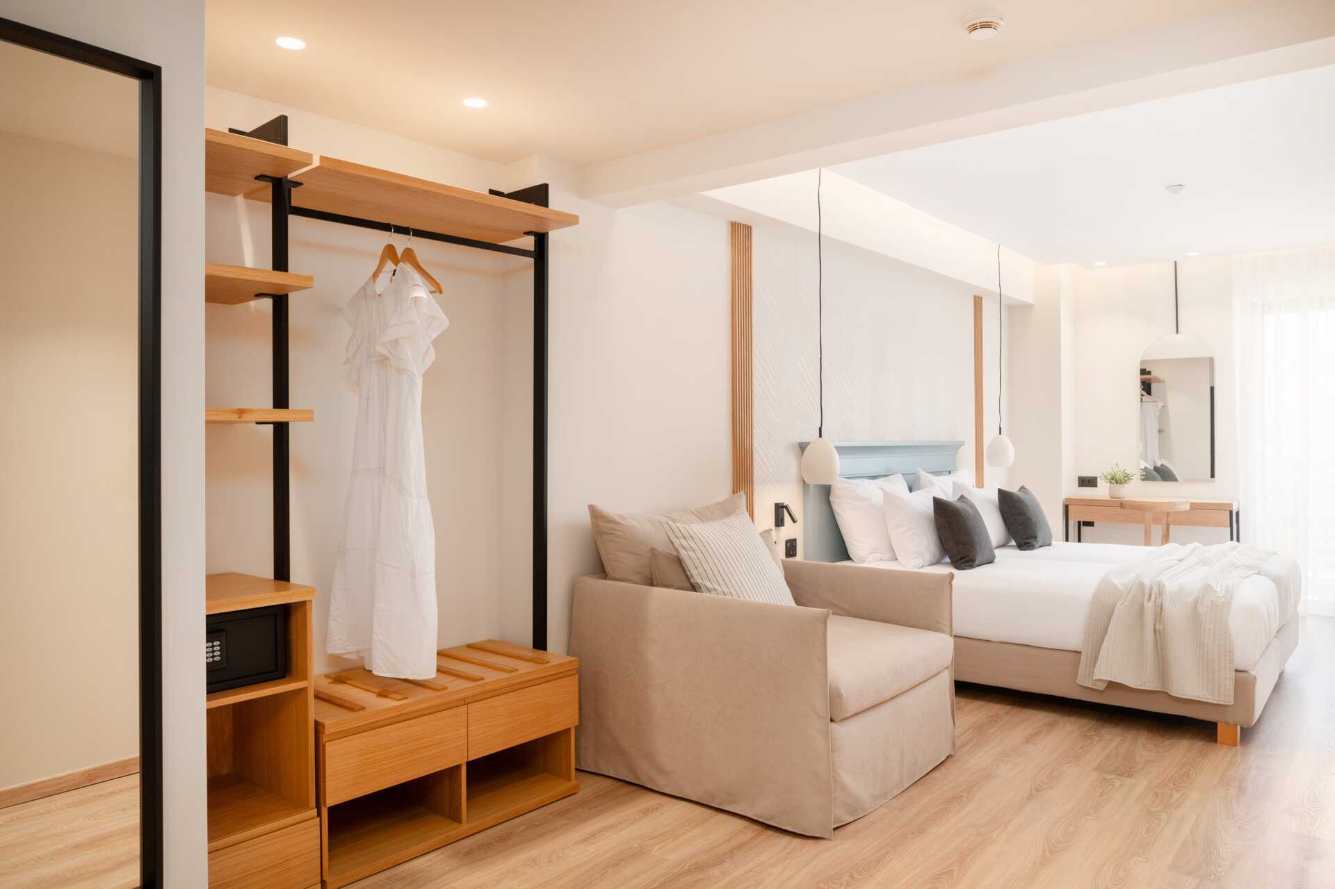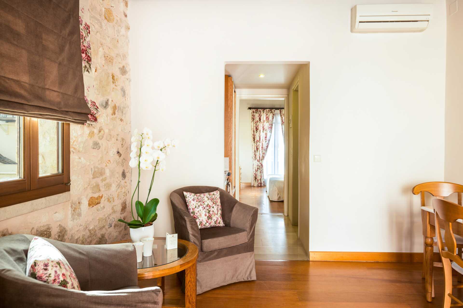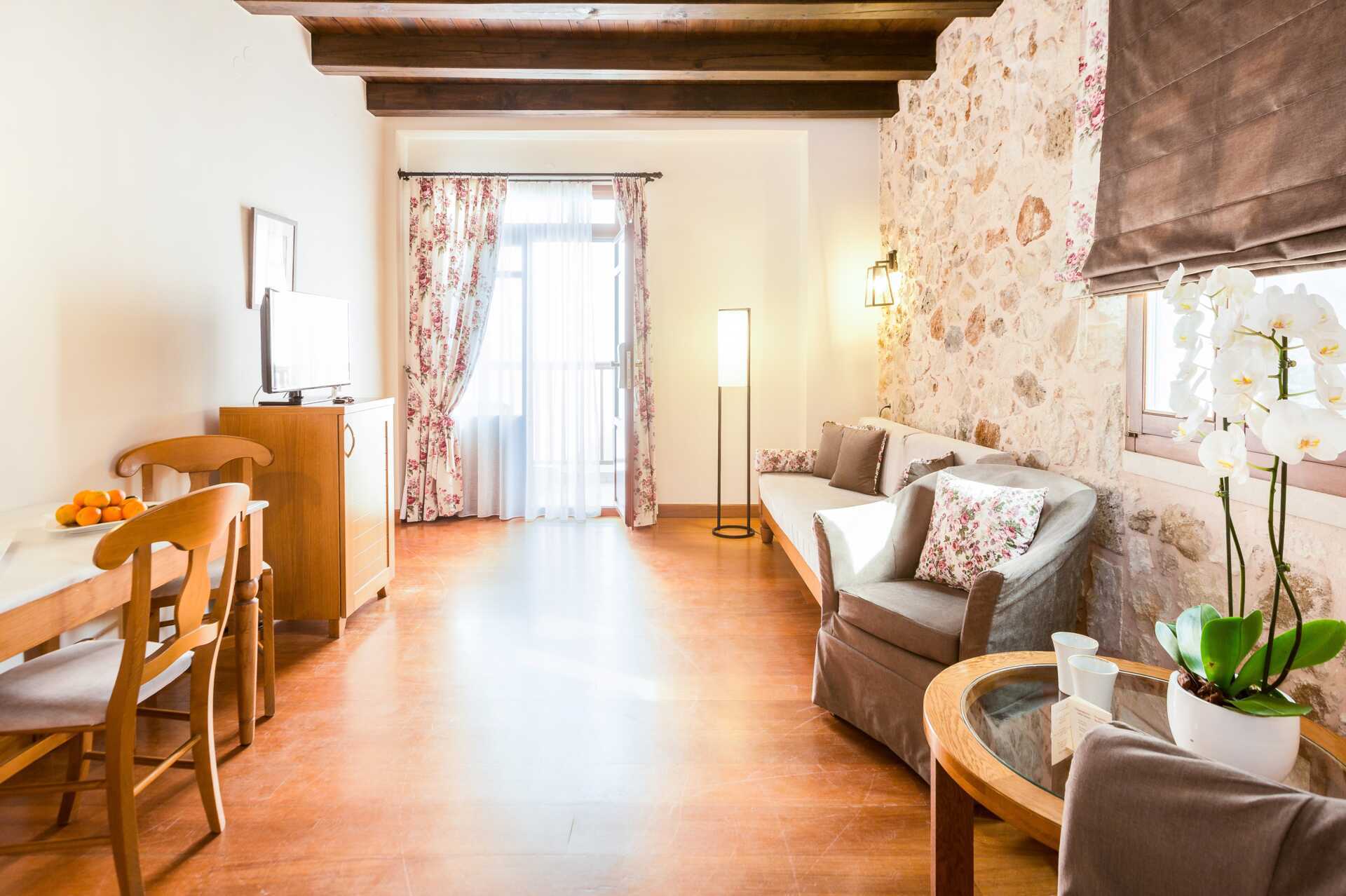 Toromsleilighet med delt uteplass. Leilighetene ligger i en sidebygning til hotellet. Et soverom og en stue med minikjøkken. To enkeltsenger. Mulig med ekstrasenger i sovesofa. Minikjøkken med kokeplater og stekeovn, kjøleskap og enkelt kjøkkenutstyr. Wifi og luftkondisjonering er inkludert. Safe mot avgift. TV. Hårføner. Badekar og wc. Rengjøring 7 ggr/uke.