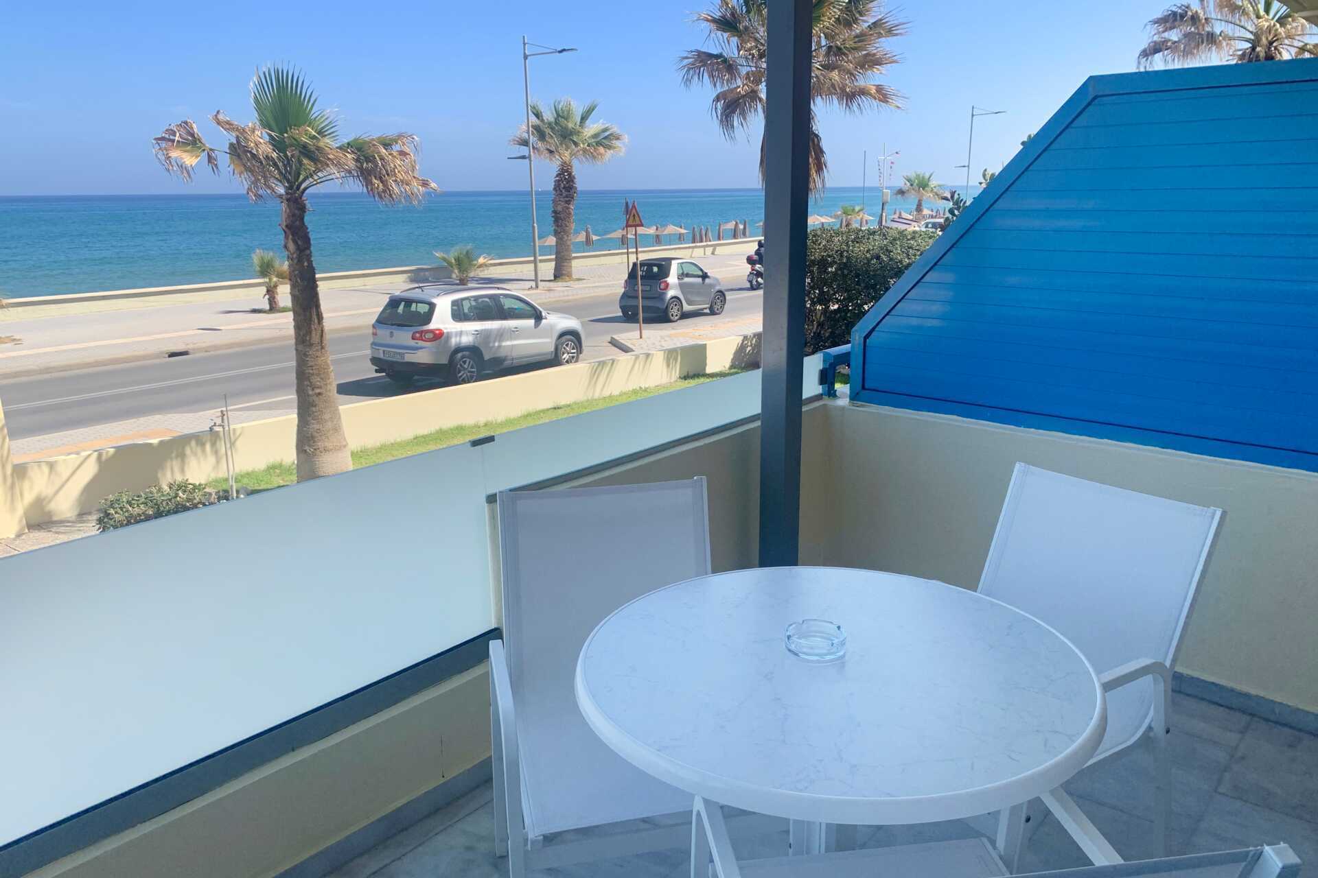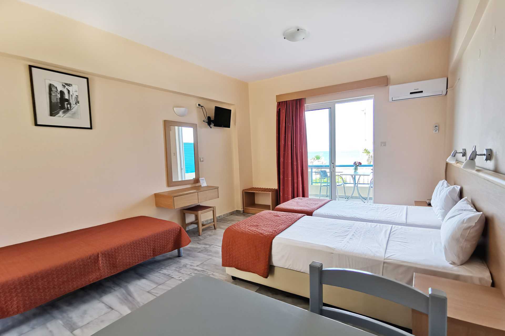 Ettromsleiligheter med balkong og havutsikt. Minikjøkken. To enkeltsenger. Mulig med en ekstraseng i sovesofa. Minikjøkken med kokeplater, kjøleskap, kaffetrakter, liten stekeovn og enkel kjøkkenutstyr. Wifi og luftkondisjonering inkludert. Safe mot avgift. TV. Lite bad med dusj og wc. Rengjøring 6 ggr/uke.