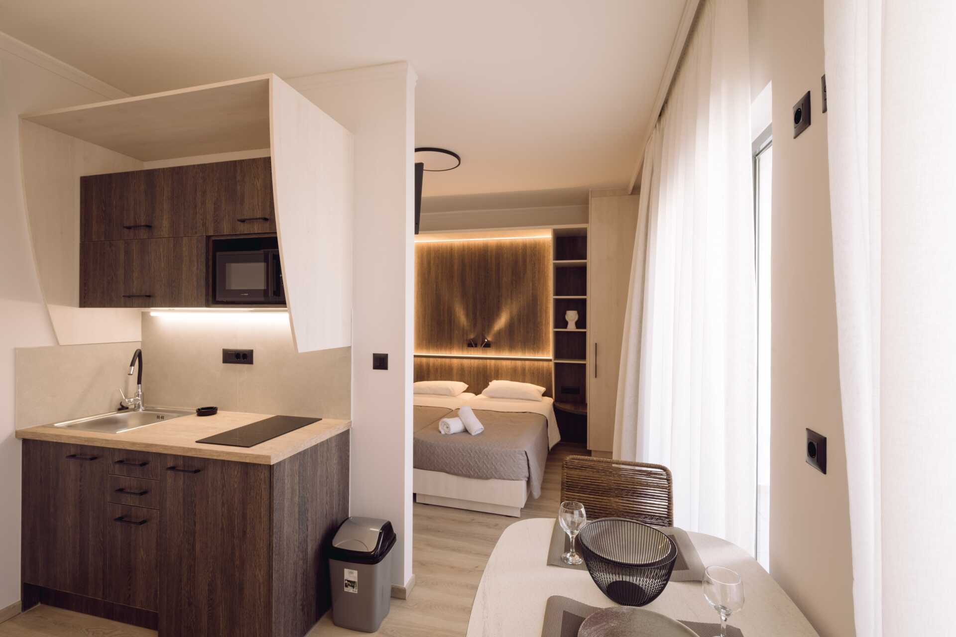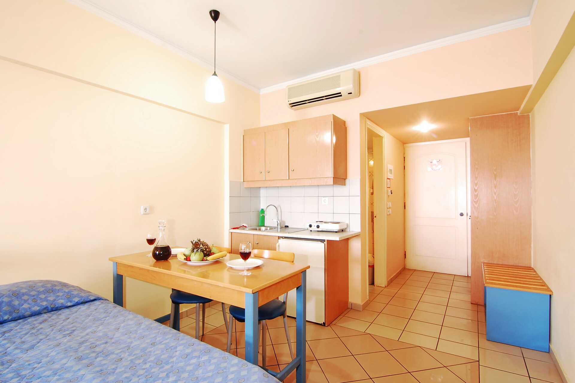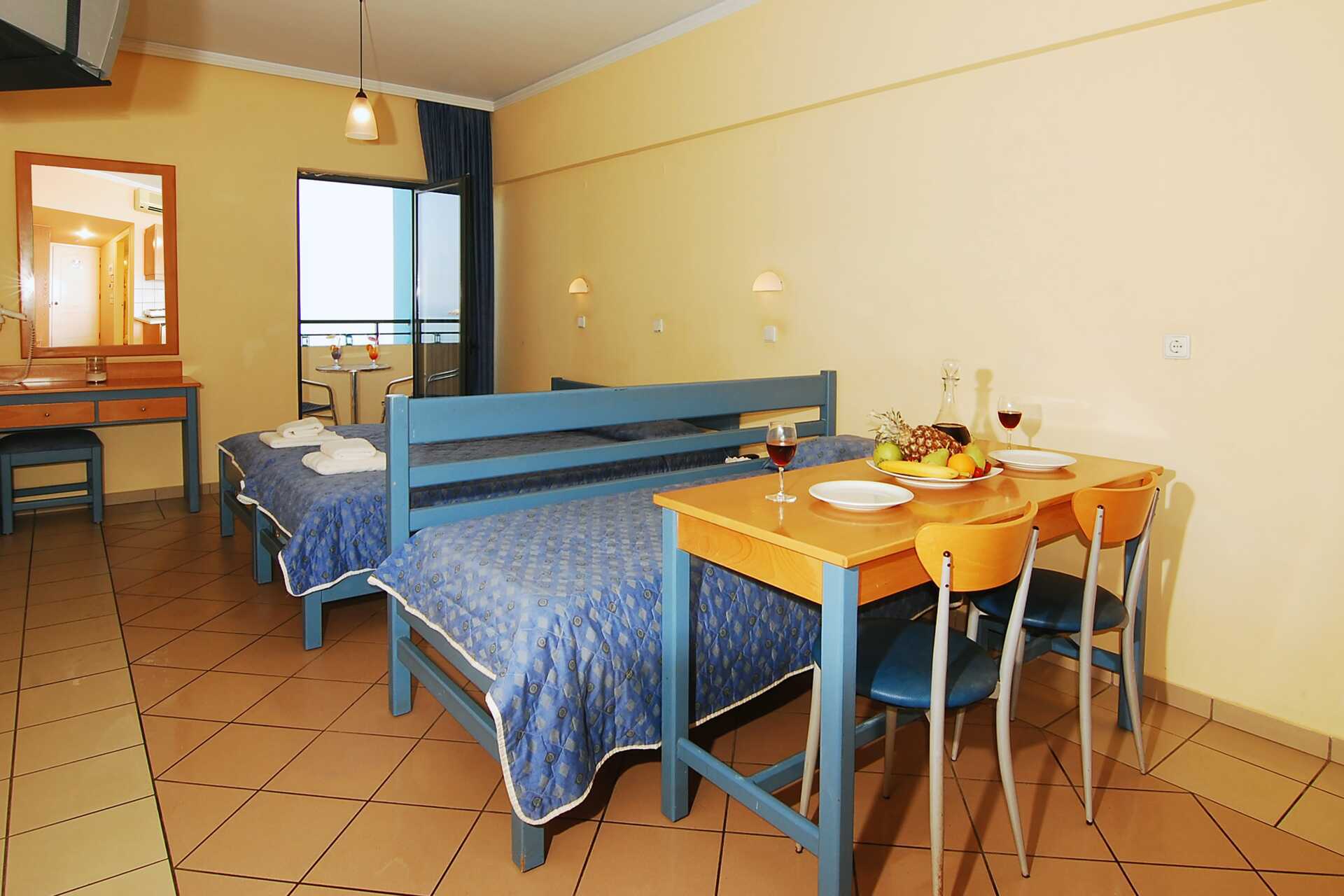 Ettromsleilighet med balkong og havutsikt eller bassengutsikt, alternativt med stor balkong og bassengutsikt. Kombinert soverom og minikjøkken. To enkeltsenger. Mulig med ekstraseng i enkeltseng. Minikjøkken med kokeplater, kjøleskap, brødrister, kaffetrakter eller vannkoker samt enkelt kjøkkenutstyr. Wifi og luftkondisjonering er inkludert. Safe mot avgift. TV med lokale kanaler. Hårføner. Dusj og wc. Rengjøring 6 ggr/uke.