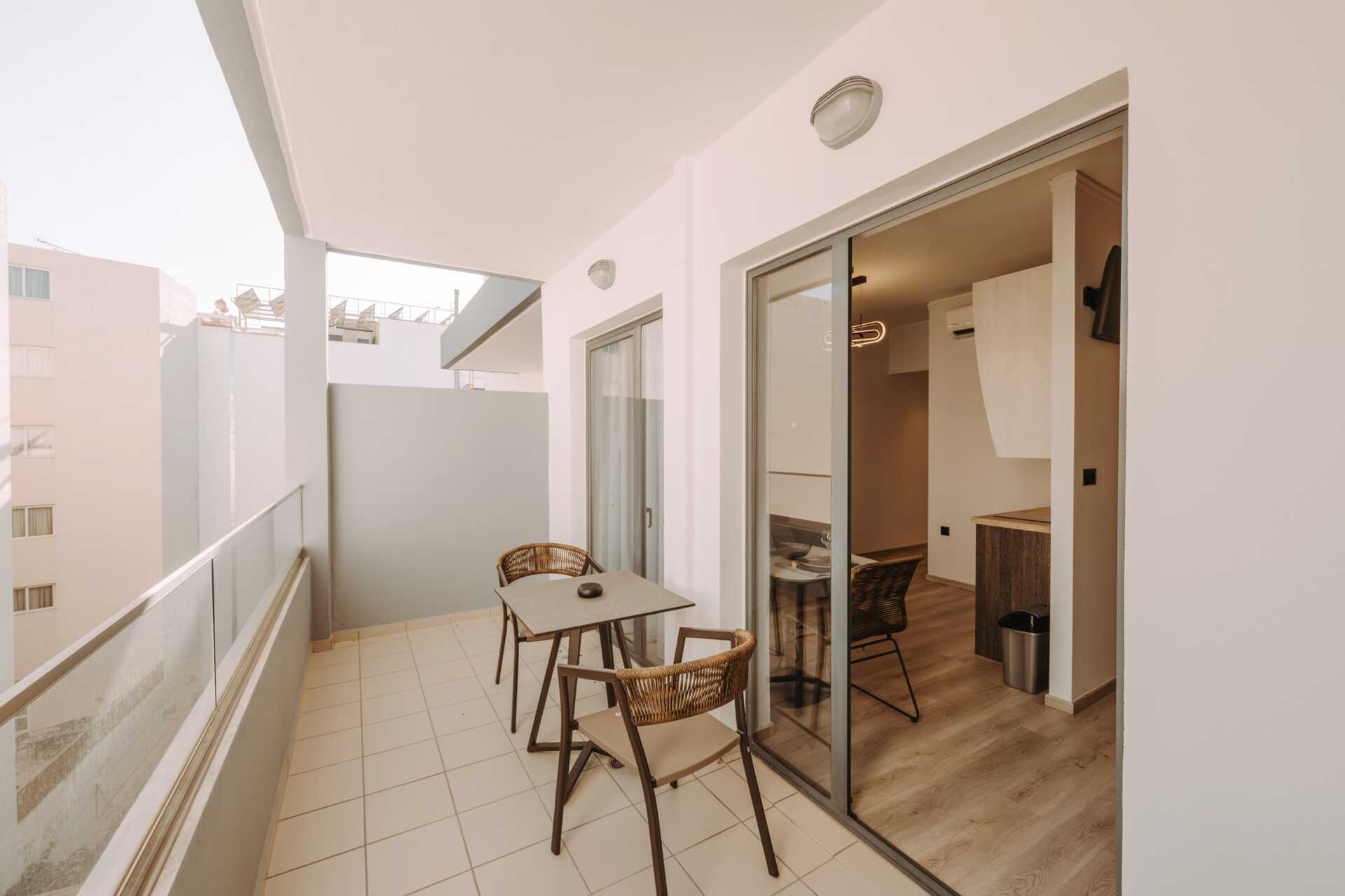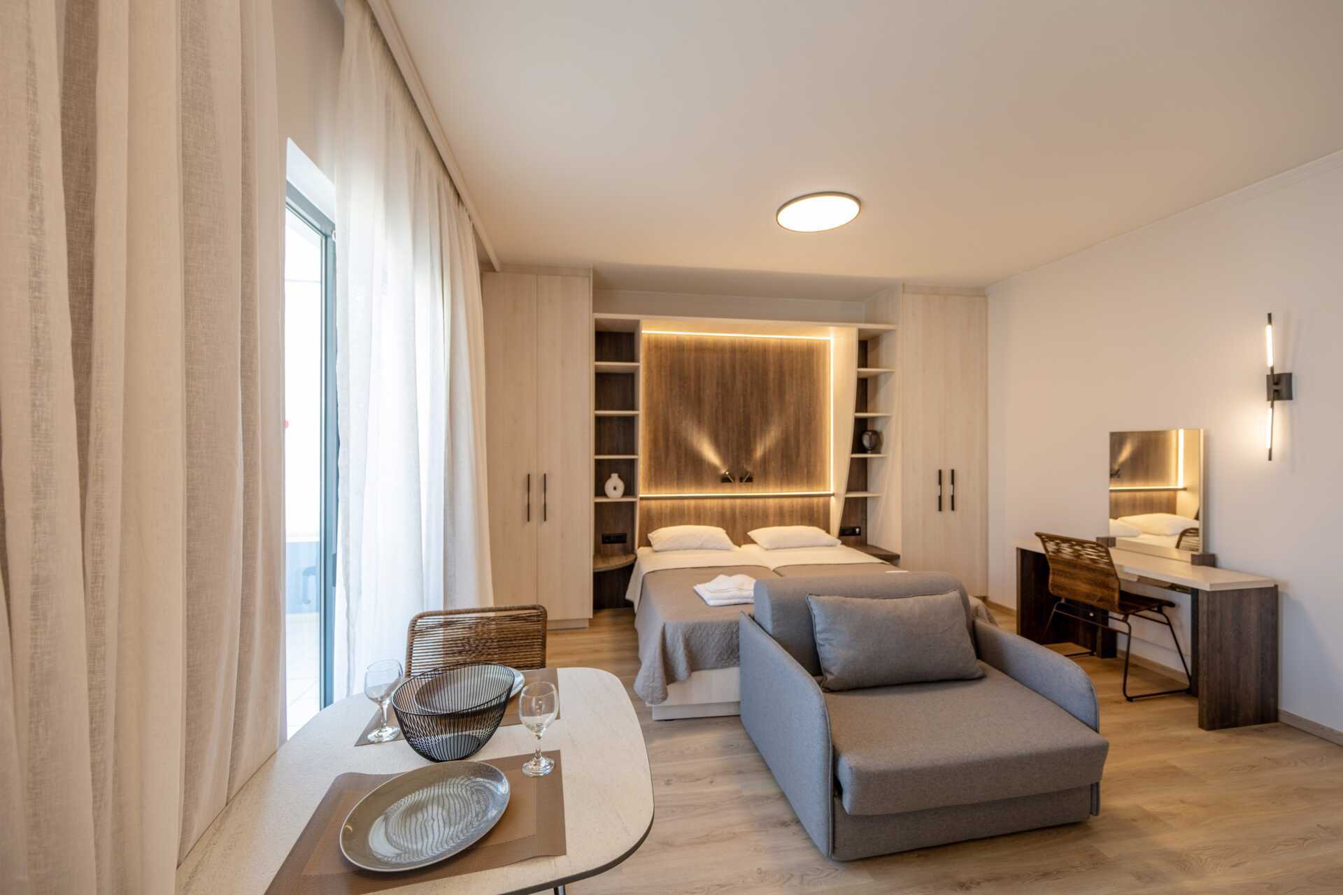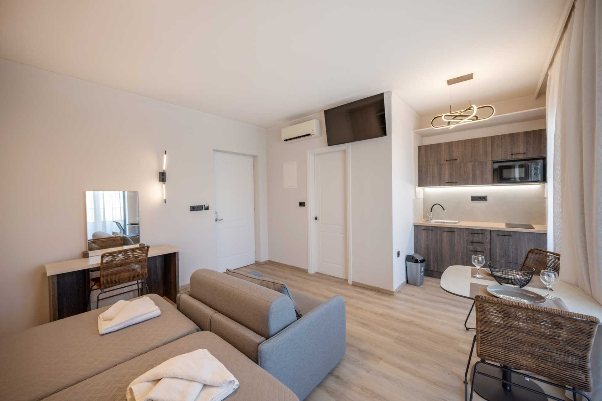 Toromsleilighet superior med balkong og havutsikt. Et soverom og stue med minikjøkken. En dobbeltseng. Mulig med ekstraseng i enkeltseng eller en sovesofa til to personer. Minikjøkken med kjøleskap, kokeplater, kaffetrakter eller vannkoker, brødrister og enkelt kjøkkenutstyr. Wifi og luftkondisjonering er inkludert. Safe mot avgift. TV med lokale kanaler. Hårføner. Bad med dusj og wc. Rengjøring 6 ggr/uke. I rom for opptil tre personer regnes barn under to år inn i maksantallet i rommet.