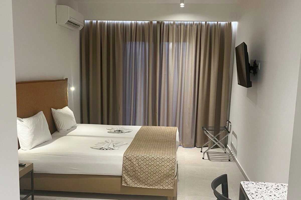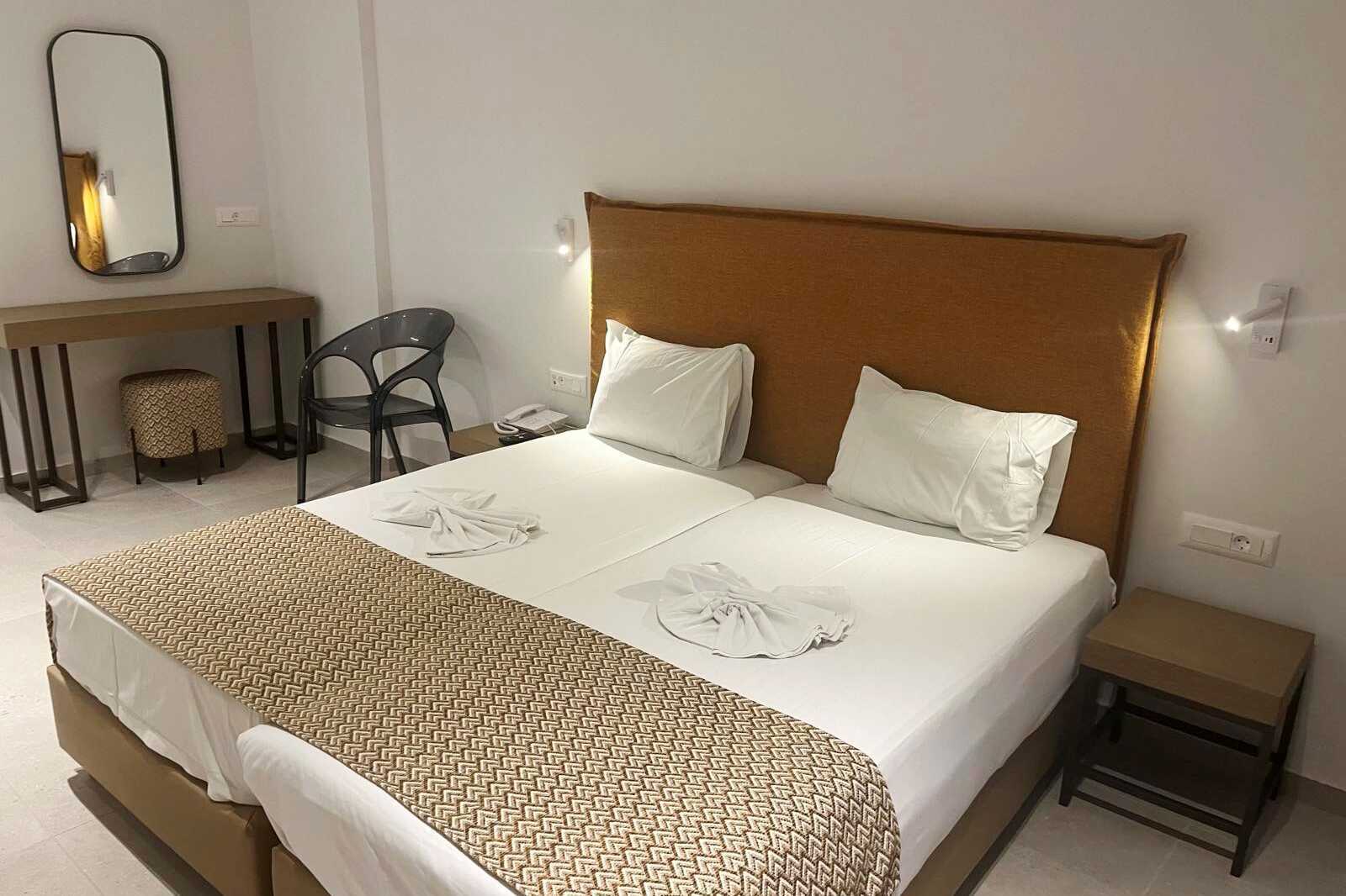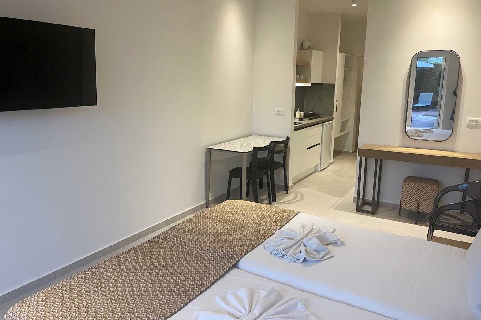 Ettromsleilighet superior med 2 ord. senger og markterrasse. Soverom kombinert med minikjøkken. To enkeltsenger. Mulig med en ekstraseng i enkeltseng. Minikjøkken med kokeplater, kjøleskap, vannkoker og enkelt kjøkkenutstyr. Wifi inkludert. Luftkondisjonering og safe mot avgift. TV. Hårføner. Dusj og wc. Rengjøring 6 ggr/uke.