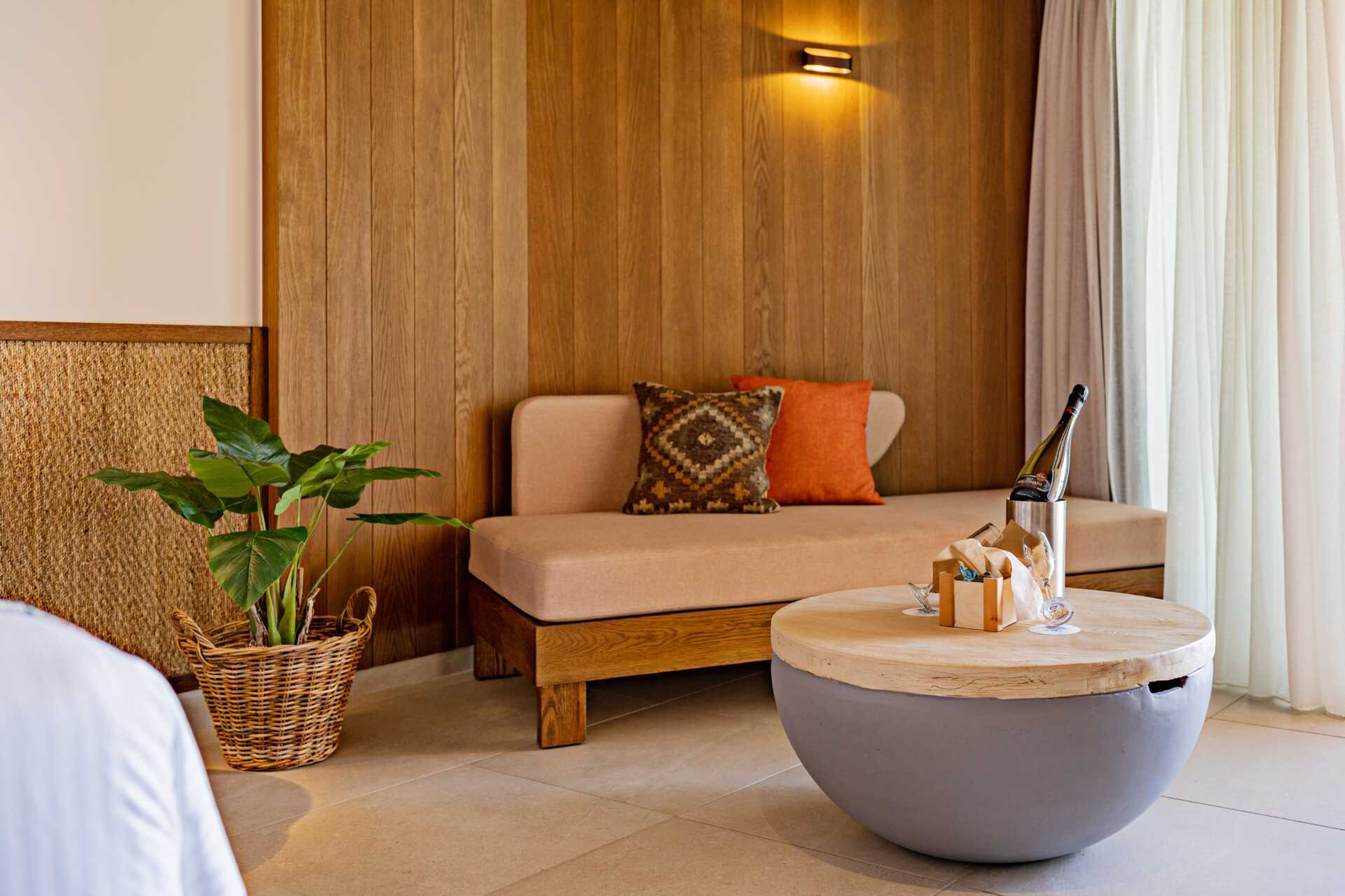 Juniorsuite superior med balkong. En dobbeltseng. Putemeny. Wifi, luftkondisjonering og safe inkludert. Kjøleskap. Nespresso kaffemaskin, kapsler inkludert ved ankomst. Vannkoker samt kaffe og te. Musserende vin, en flaske vann og frukt ved ankomst. TV. Badekåper og tøfler Strykejern og strykebrett. Basseng- og strandhåndklær Hårføner. Dusj og wc. Rengjøring 7 ggr/uke.