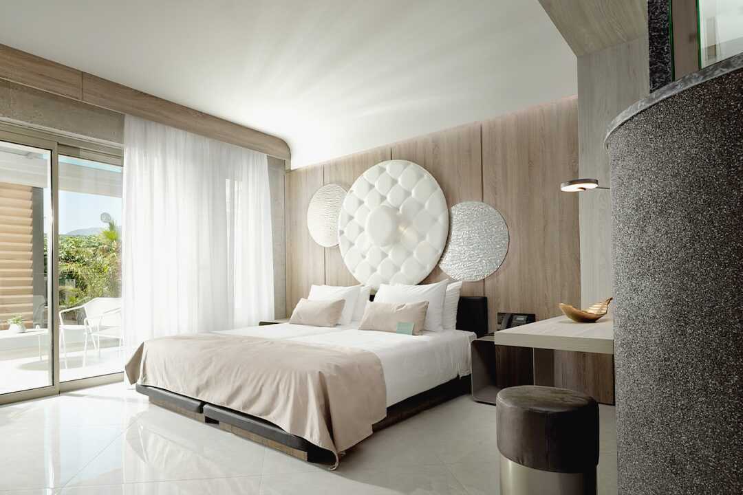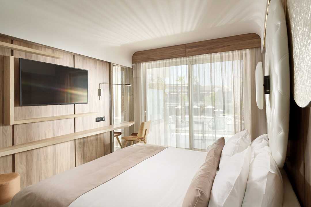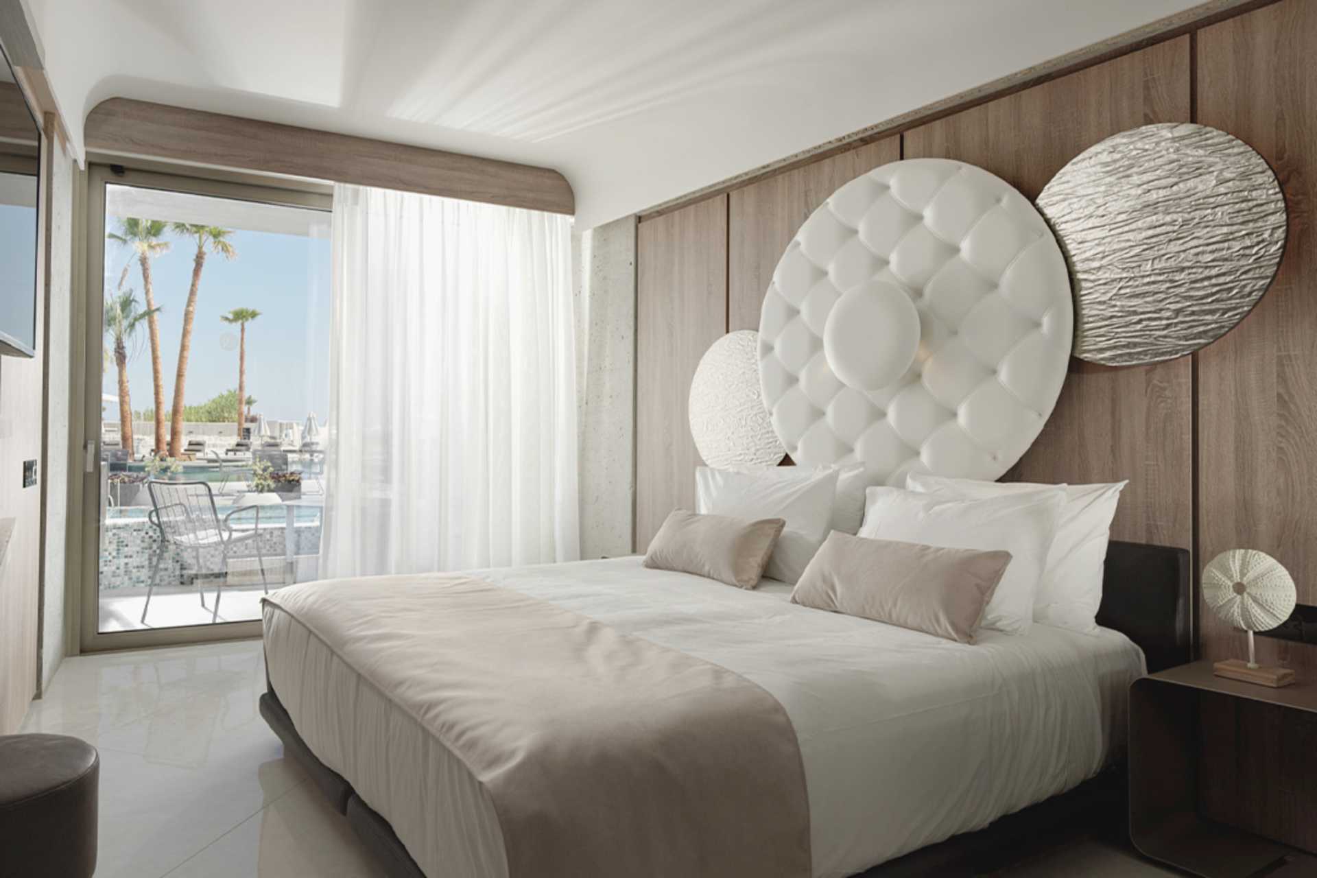 Superiorrom med tilgang til bassenget og utsikt over bassenget. Bassenget er et grunnere plaskebasseng. Trappetrinn fra balkongen til bassenget. En dobbeltseng. Putemeny. Luftkondisjonering, safe og wifi inkludert. Minibar. TV. Badekåper og tøfler. Hårføner. Bad med badekar eller dusj og separat wc. Rengjøring 7 ggr/uke.