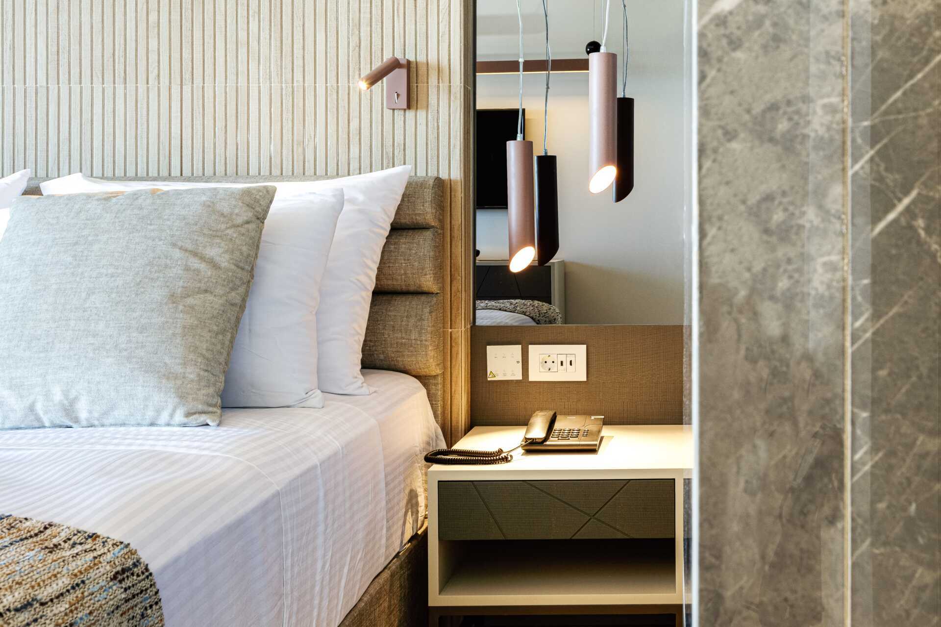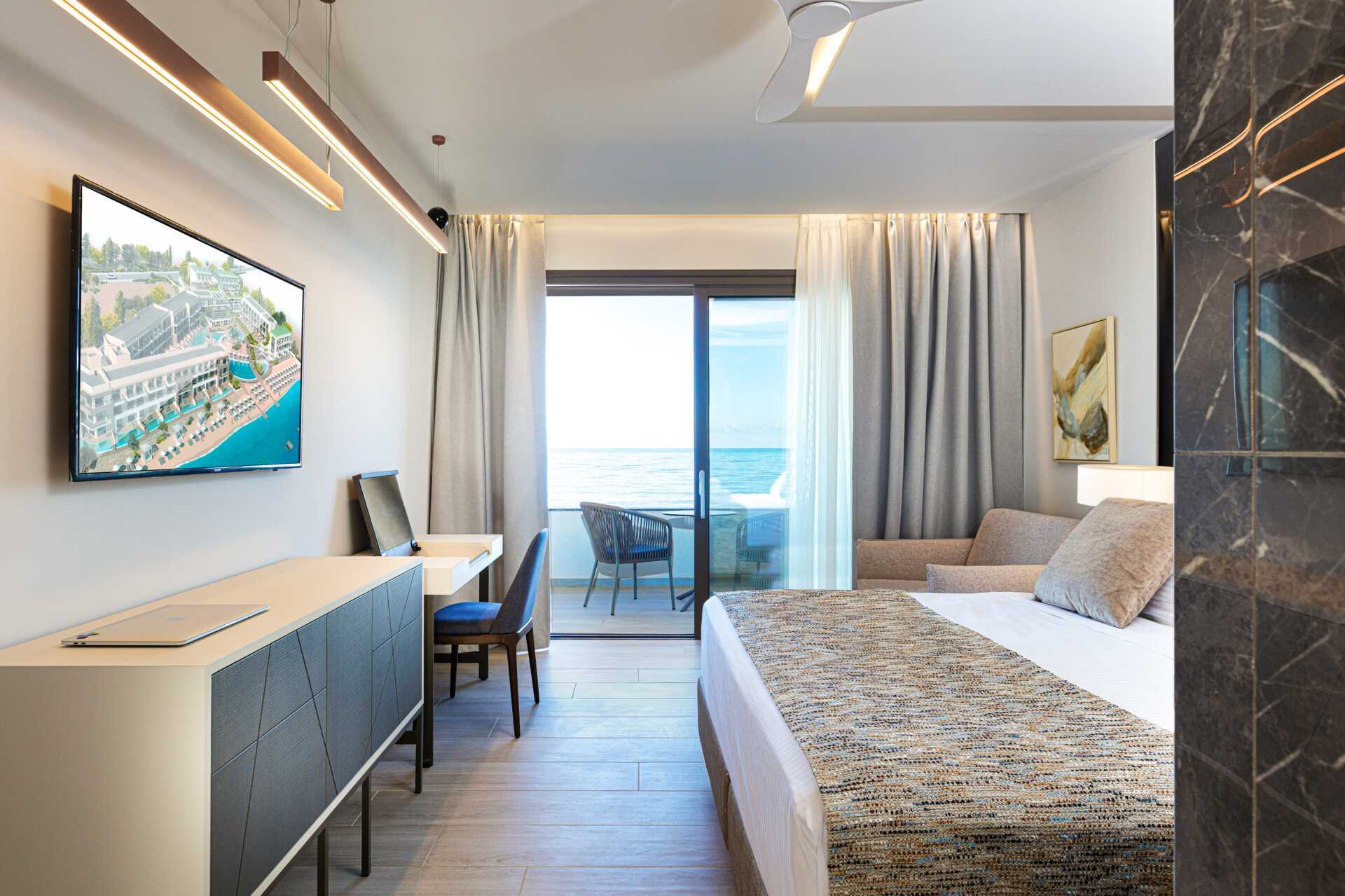 Superiorrom Seafront med balkong og havutsikt. Rommene har den aller beste beliggenheten nærmest havet og stranden med fantastisk havutsikt. En dobbeltseng. Wifi, luftkondisjonering og safe inkludert. Kjøleskap. Espresso kaffemaskin. Kapsler inkludert og etterfylles hver dag. Vannkoker samt kaffe og te. TV med internasjonale kanaler. Strykejern og strykebrett. Badekåper og tøfler Hårføner. Baderom med dusj og wc. Rengjøring 7 ggr/uke.