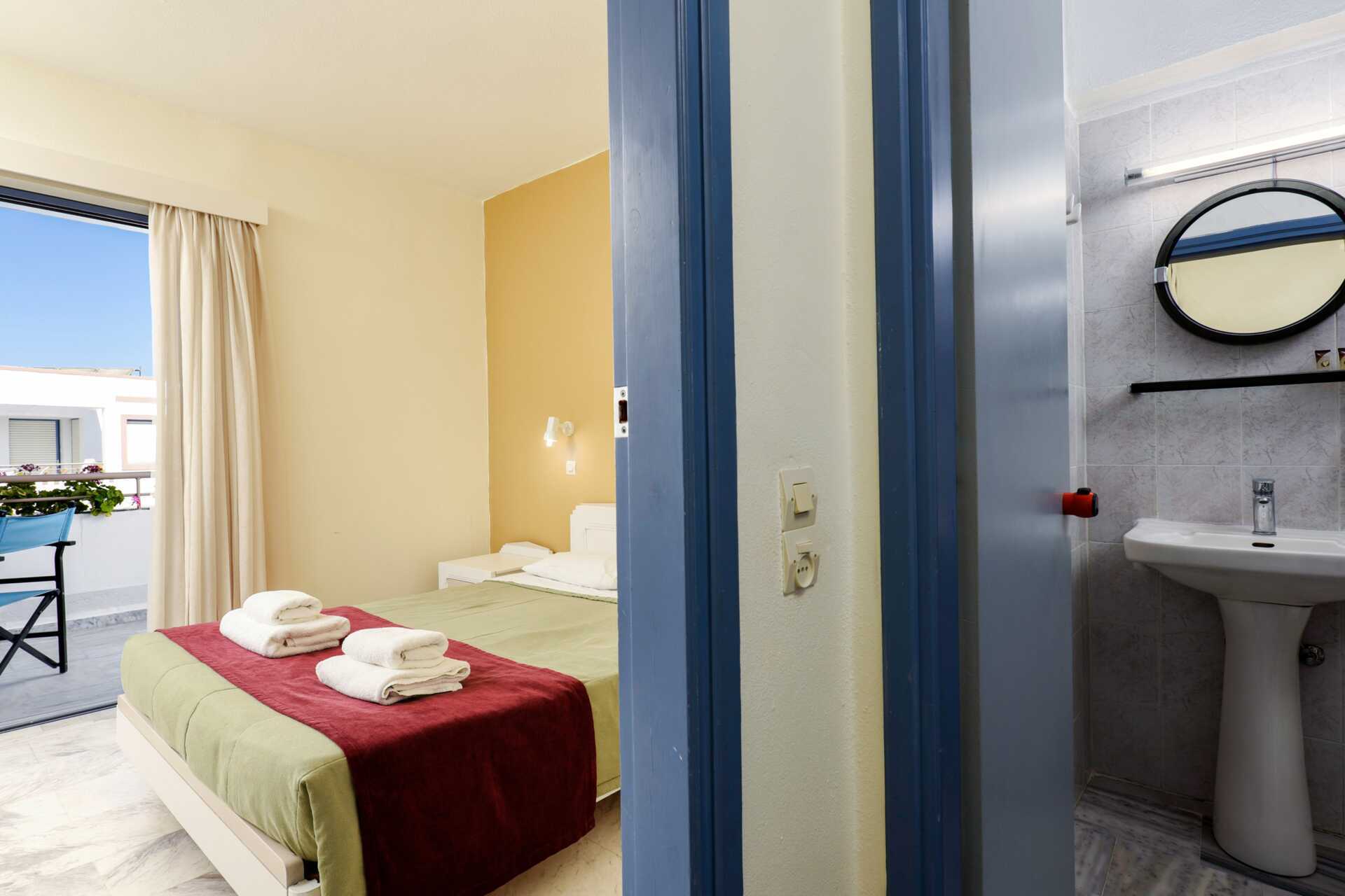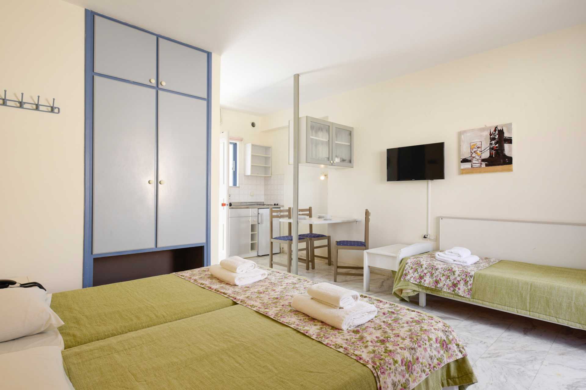 Toromsleilighet med balkong eller terrasse. Et soverom og stue med minikjøkken. To enkeltsenger. Mulig med ekstrasenger i to sovesofaer. Minikjøkken med kokeplater, kjøleskap, vannkoker og enkelt kjøkkenutstyr. Wifi og luftkondisjonering er inkludert. Safe mot avgift. TV. Hårføner. Dusj og wc. Rengjøring 6 ggr/uke.