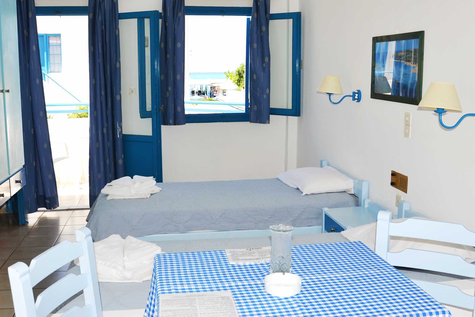 Ettromsleilighet med balkong eller terrasse. Soverom kombinert med minikjøkken. To enkeltsenger. Mulig med ekstraseng for en tredje person. Minikjøkken med kokeplater, kjøleskap, vannkoker, kaffetrakter og enkelt kjøkkenutstyr. Wifi og luftkondisjonering inkludert. Safe mot avgift. TV. Hårføner. Badekar eller dusj samt wc. Rengjøring 6 ggr/uke. Barn under 2 år regnes inn i maksantallet i rommet.