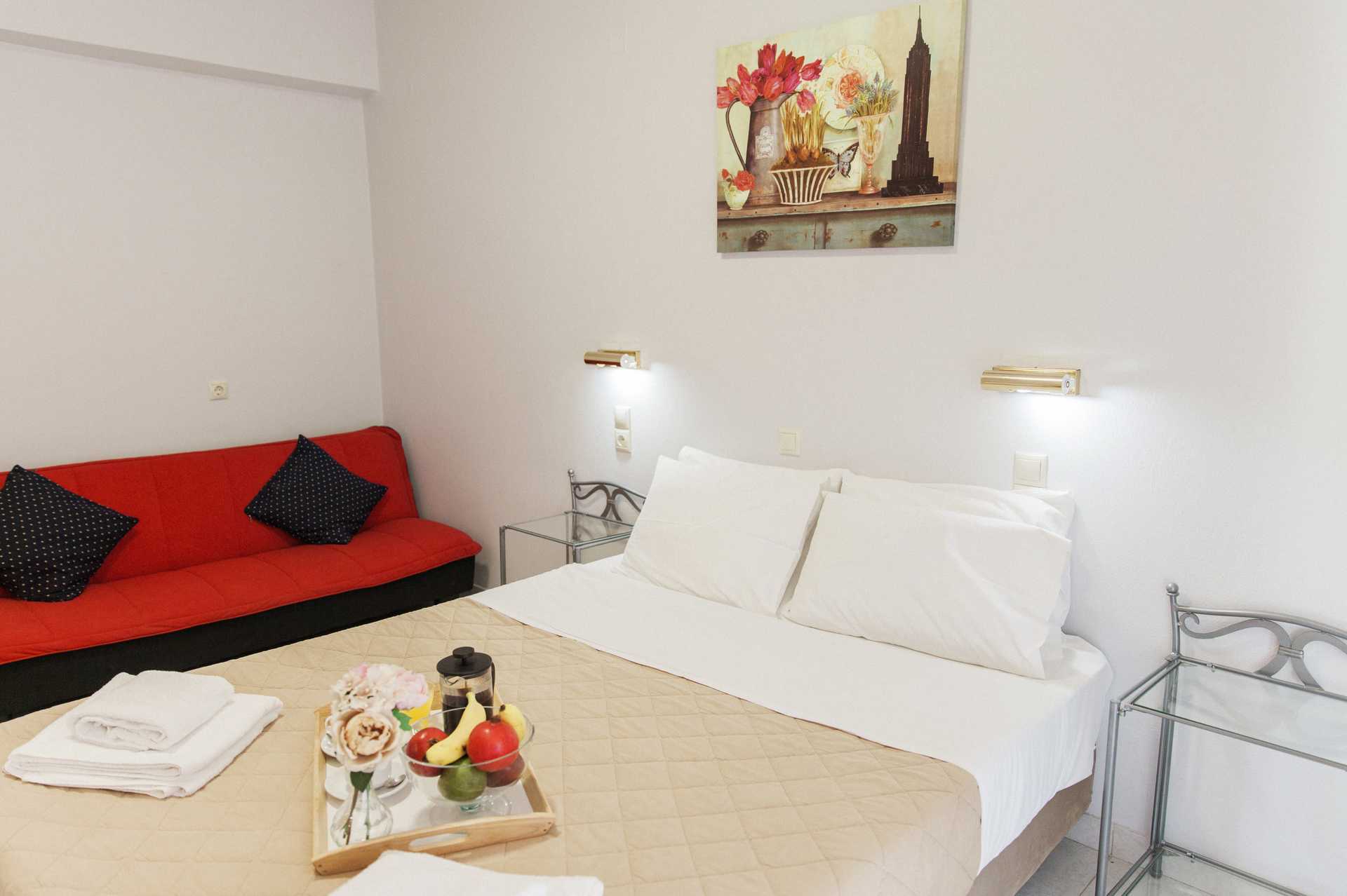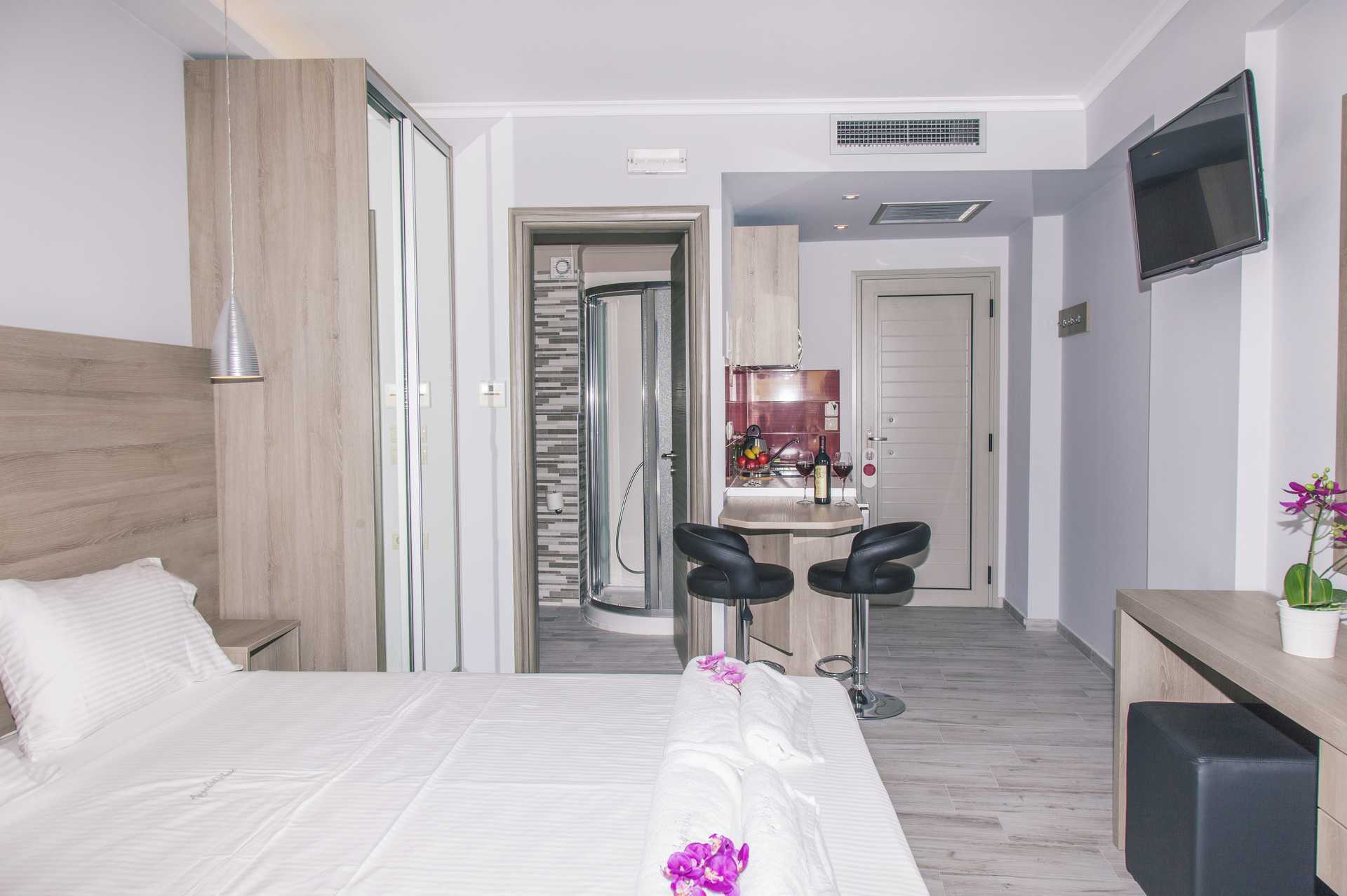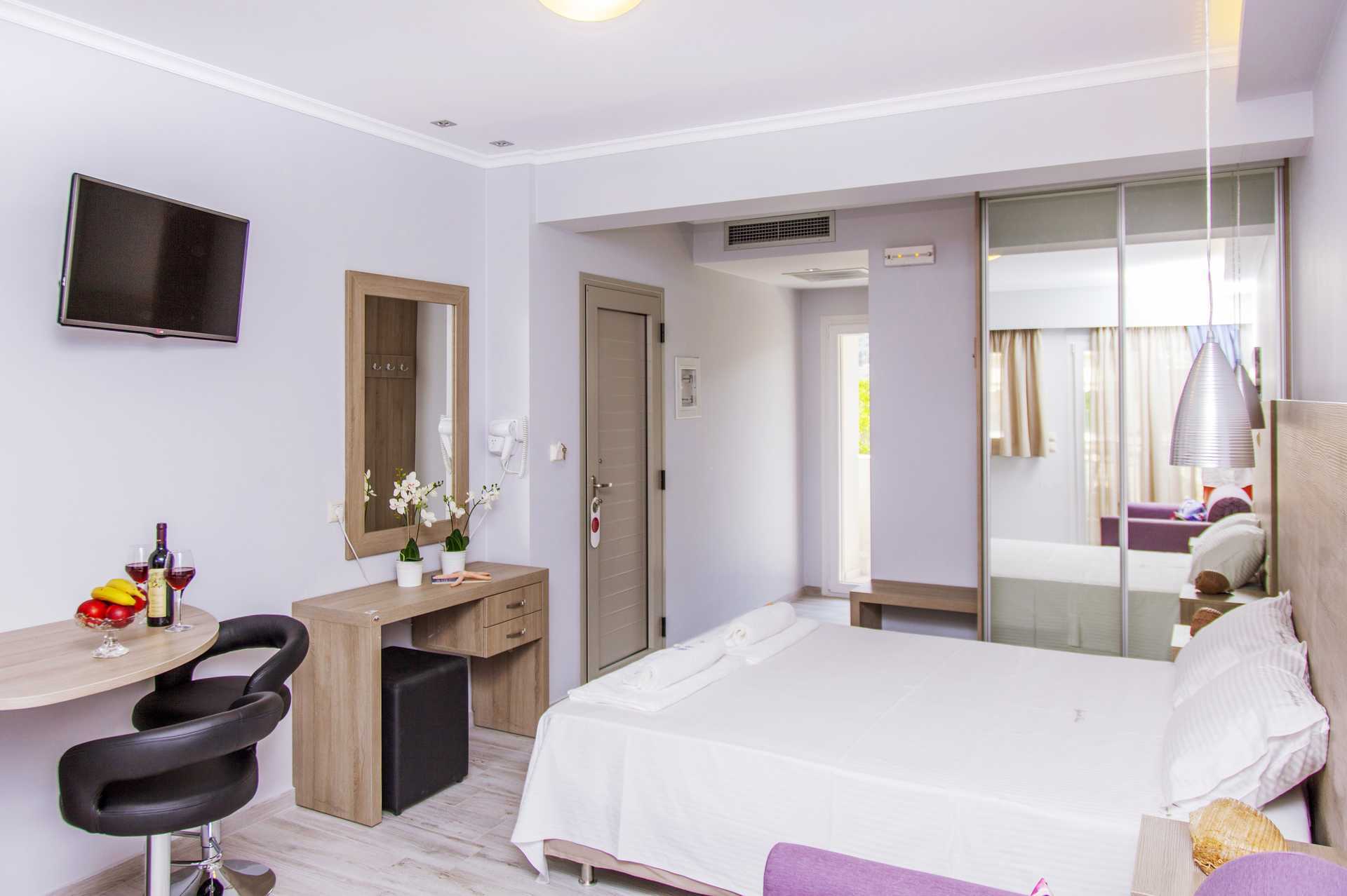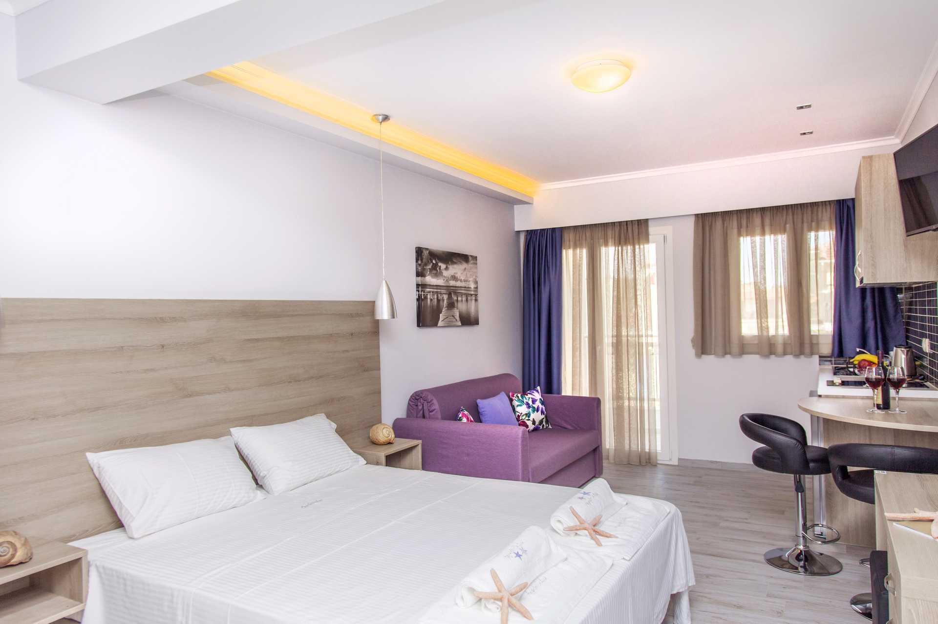 Ettromsleilighet med balkong. Minikjøkken. En dobbeltseng eller to enkeltsenger. Mulig med en ekstraseng i sovesofa. Hvis det bor tre personer i rommet, kan det oppleves som trangt. Minikjøkken med kokeplater, kjøleskap, vannkoker og enkelt kjøkkenutstyr. Wifi inkludert. Luftkondisjonering og safe mot avgift. TV. Hårføner. Baderom med dusj og wc. Rengjøring 6 ggr/uke.