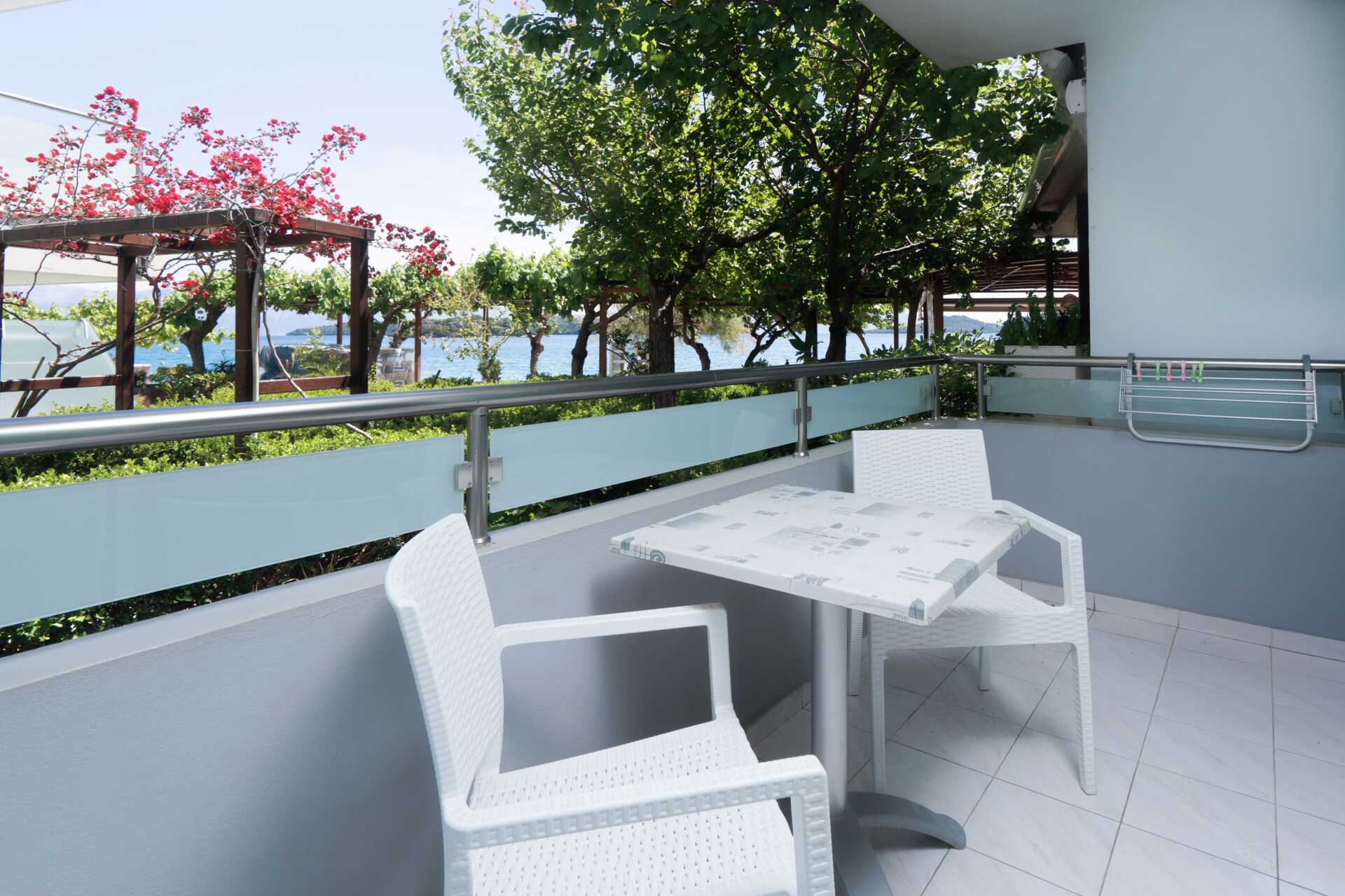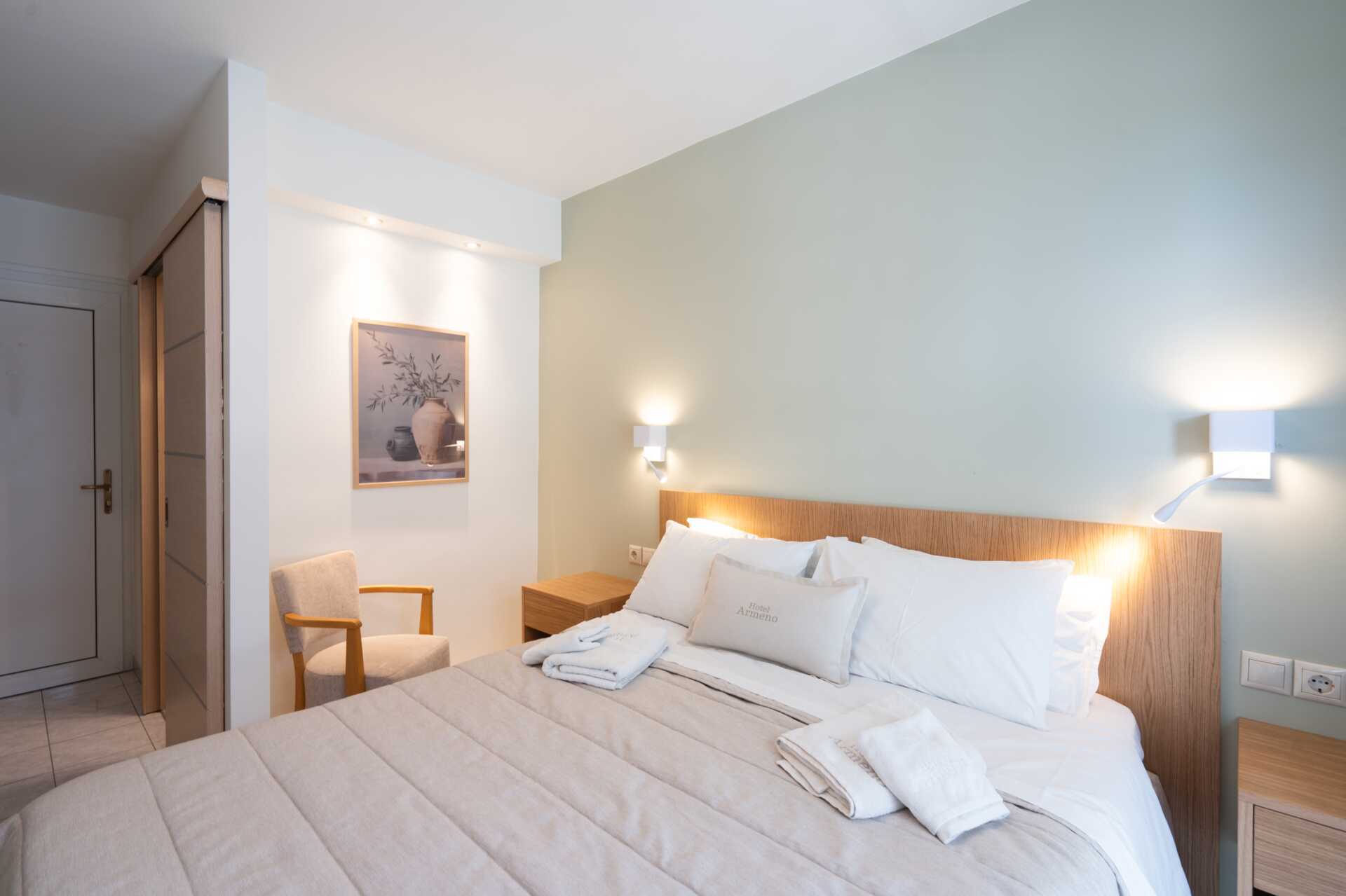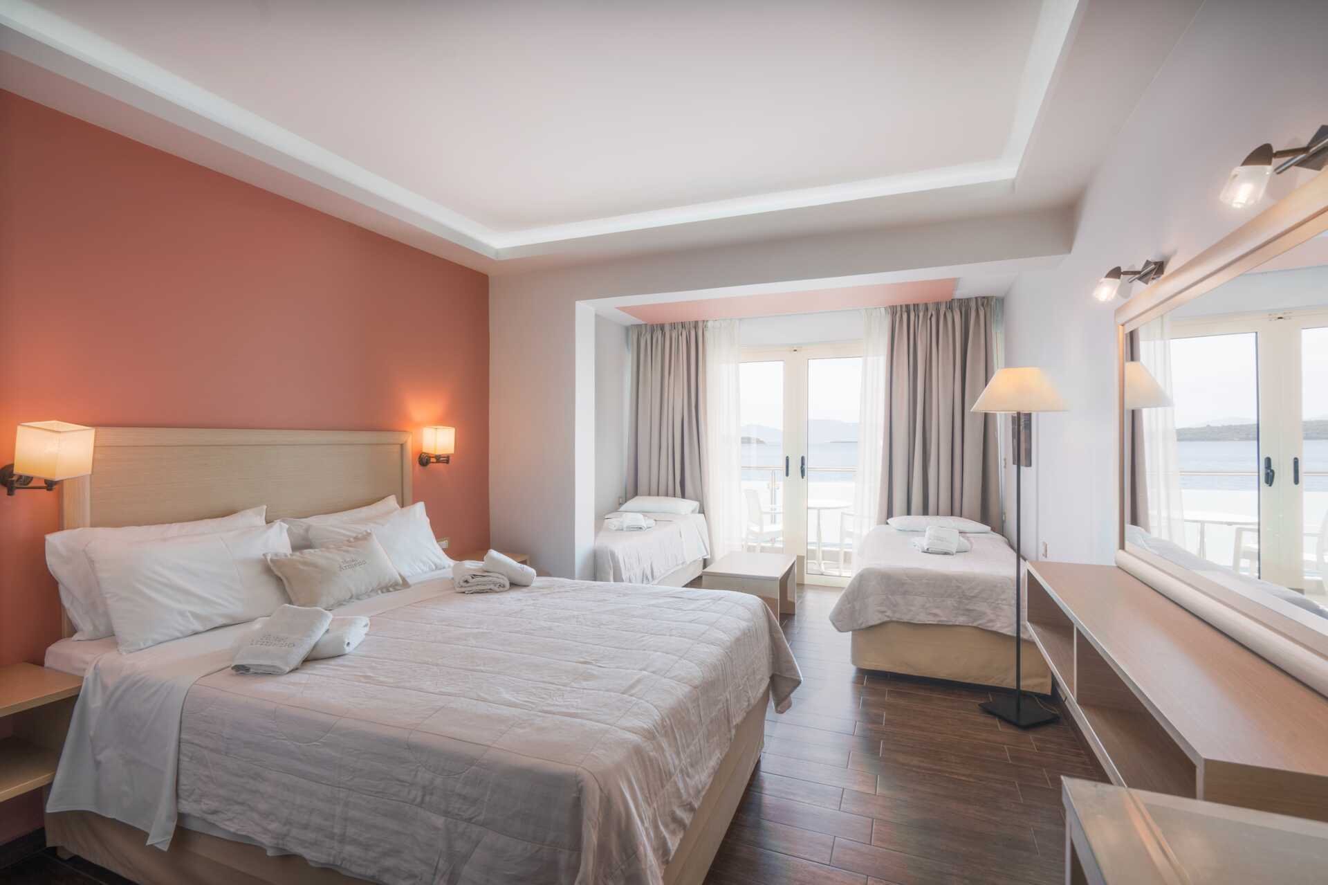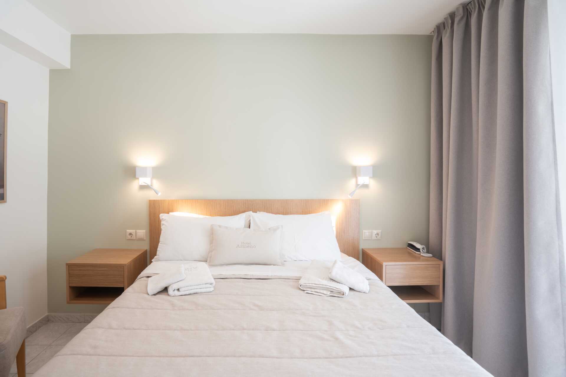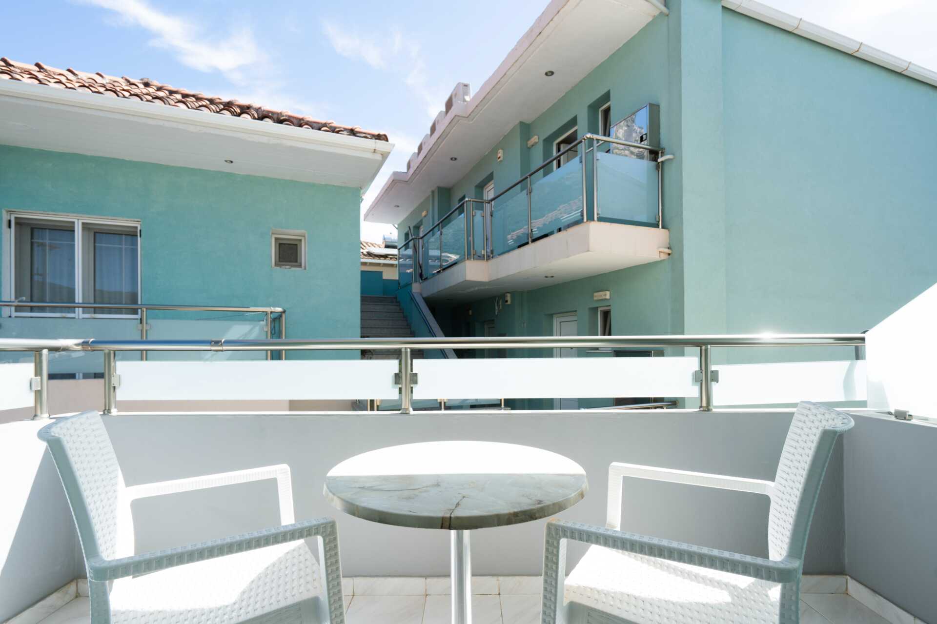 Dobbeltrom med balkong eller terrasse i første etasje, med begrenset havutsikt eller med havutsikt. En dobbeltseng eller to enkeltsenger. Mulig med ekstrasenger i enkeltsenger. Wifi, luftkondisjonering og safe inkludert. Kjøleskap. Vannkoker samt kaffe og te. TV. Hårføner. Baderom med dusj og wc. Rengjøring 7 ggr/uke.