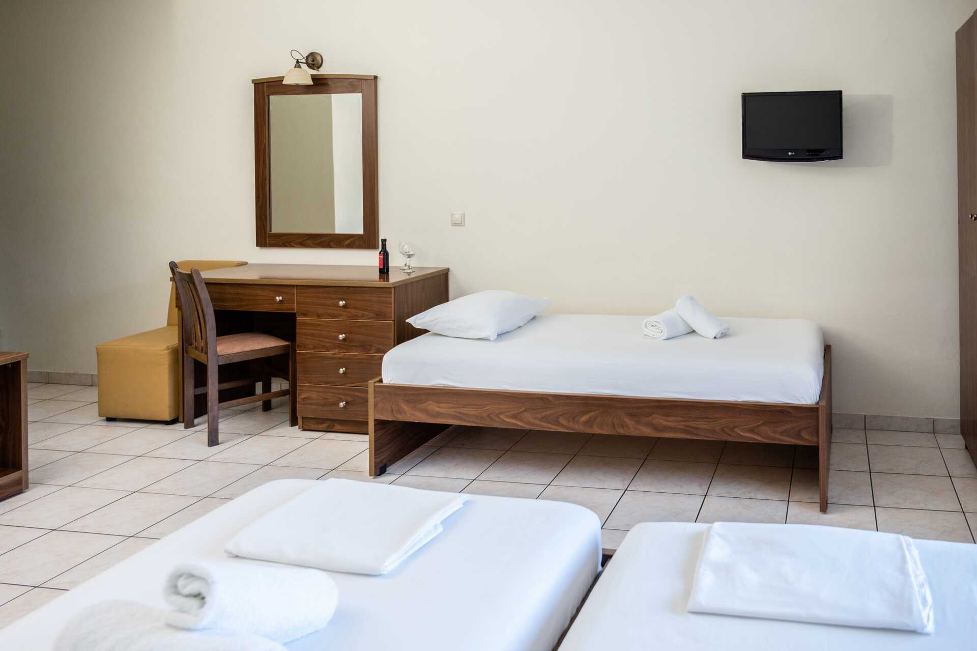 Dobbeltrom med balkong. Tre enkeltsenger. Wifi og safe inkludert. Luftkondisjonering mot avgift. TV med lokale kanaler. Dusj og wc. Rengjøring 6 ggr/uke. Barn under 2 år regnes inn i maksantallet i rommet.