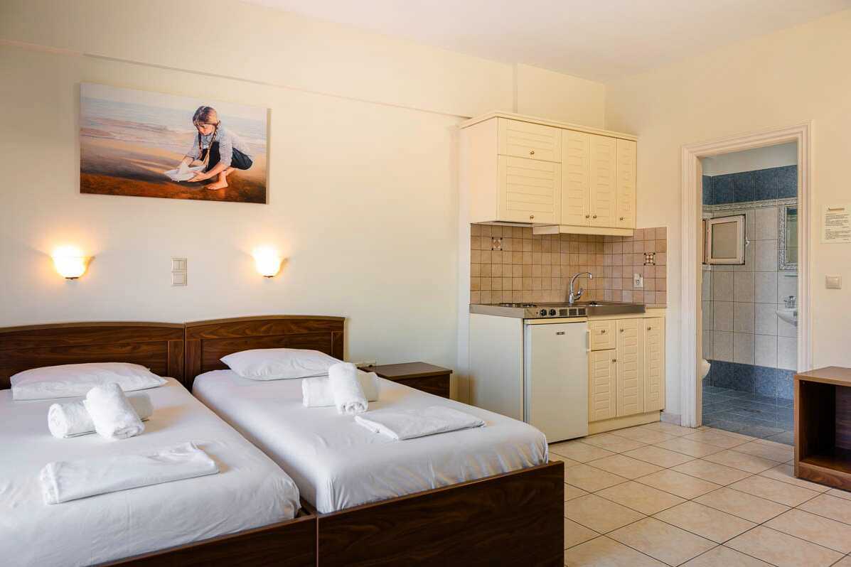 Ettromsleilighet med balkong. Minikjøkken. To enkeltsenger. Minikjøkken med kjøleskap, kokeplater og enkelt kjøkkenutstyr. Wifi og safe inkludert. Luftkondisjonering mot avgift. TV med lokale kanaler. Dusj og wc. Rengjøring 6 ggr/uke. Barn under 2 år regnes inn i maksantallet i rommet.