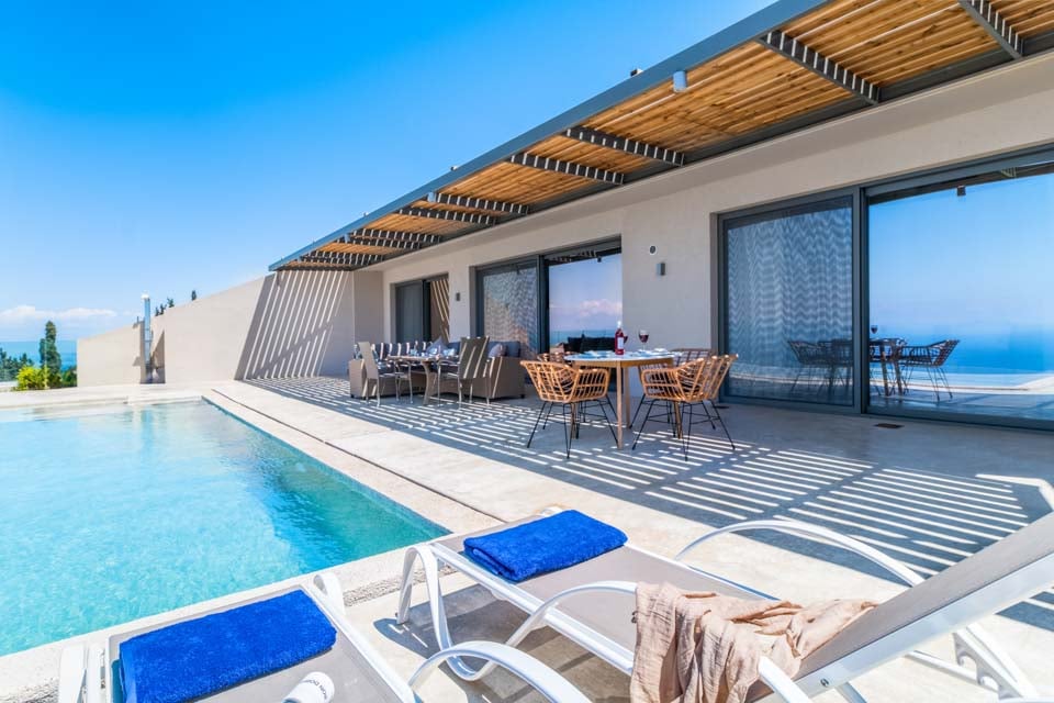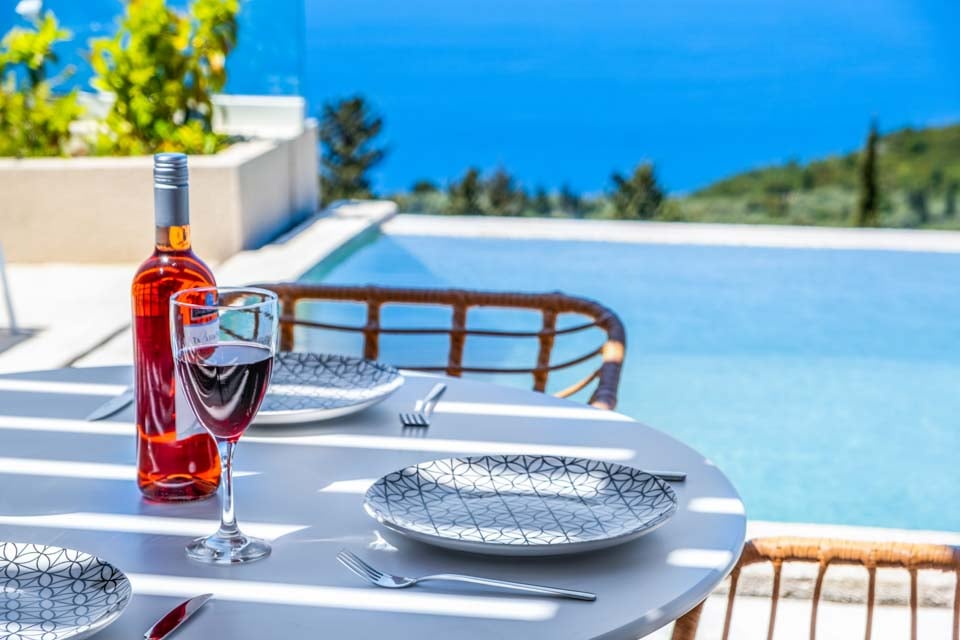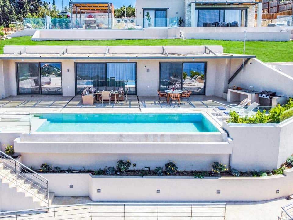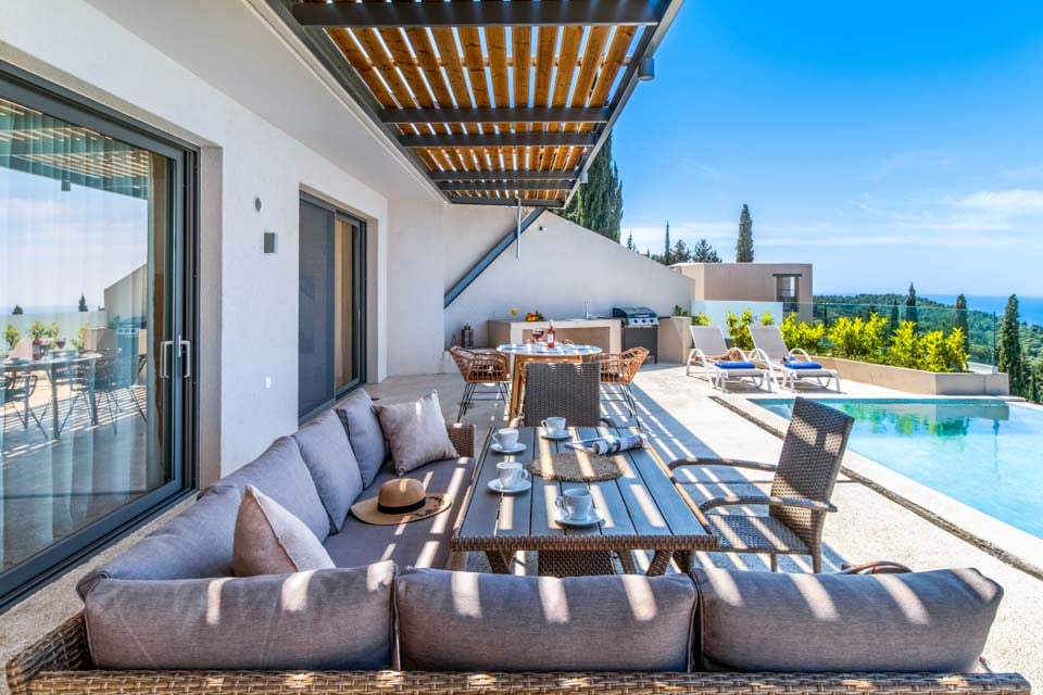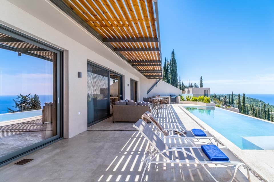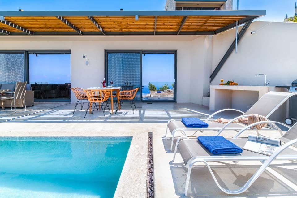 Uteområdet tilbyr en sjenerøs terrasse med utendørs servering og grillområde, samt svært komfortable solsenger for avslapning ved bassenget. Det store, rektangulære evighetsbassenget tilbyr strålende utsikt ned den bratte, skogkledde åssiden mot havet, og mange timer vil garantert bli tilbrakt med å bare stirre ut mot havet fra solsengene og uteserveringen.