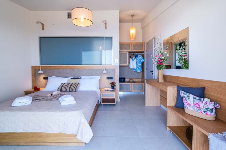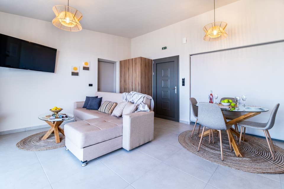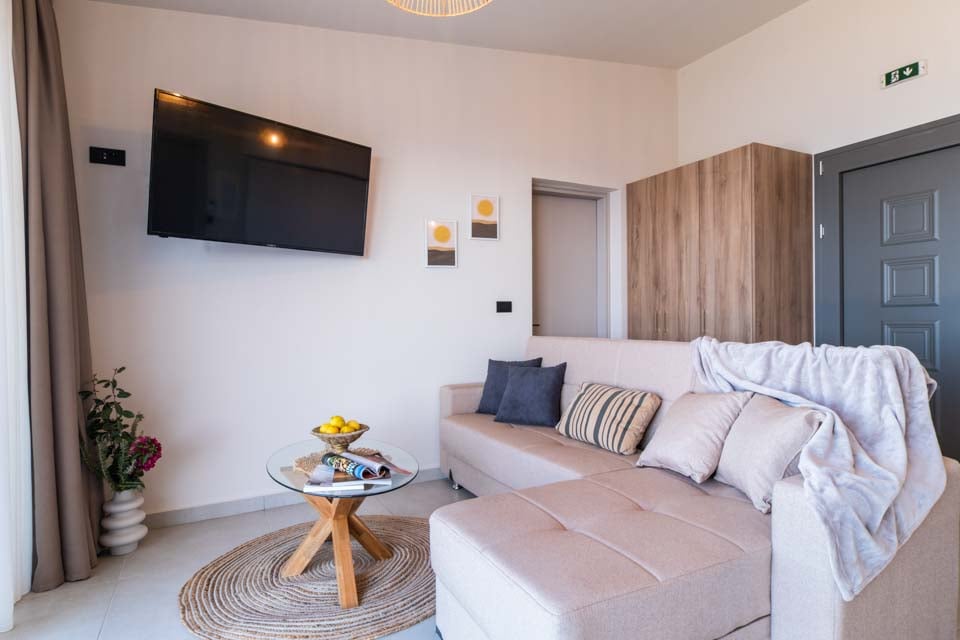 Komfortabel sittegruppe, klimaanlegg, flatskjerm-TV, spiseplass, dører til terrasse, havutsikt