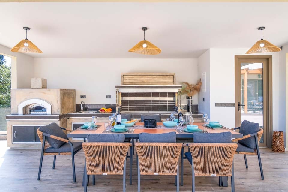 Overbygd terrasse, komfortabel sittegruppe, utendørs spiseplass, åpen terrasse, solsenger, parasoll, mursteinsgrill
