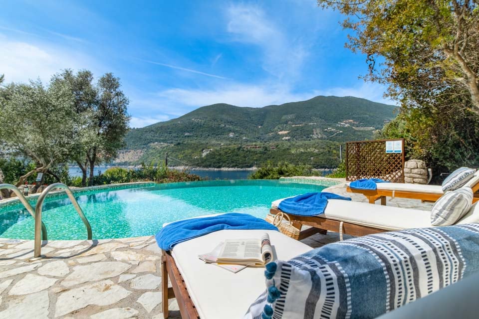 Villaen er designet for å utfylle de naturlige omgivelsene, og har et fantastisk, buet evighetsbasseng som ligger langs forsiden av eiendommen. Det strålende turkise bassenget står i kontrast til det asurblå i Det joniske hav nedenfor. Solsengene i tre ved bassengkanten er smart plassert for å gi utsikt over den fantastiske utsikten. Det er også rottingstoler og spisemøbler slik at man kan nyte måltider og drikke utendørs.
