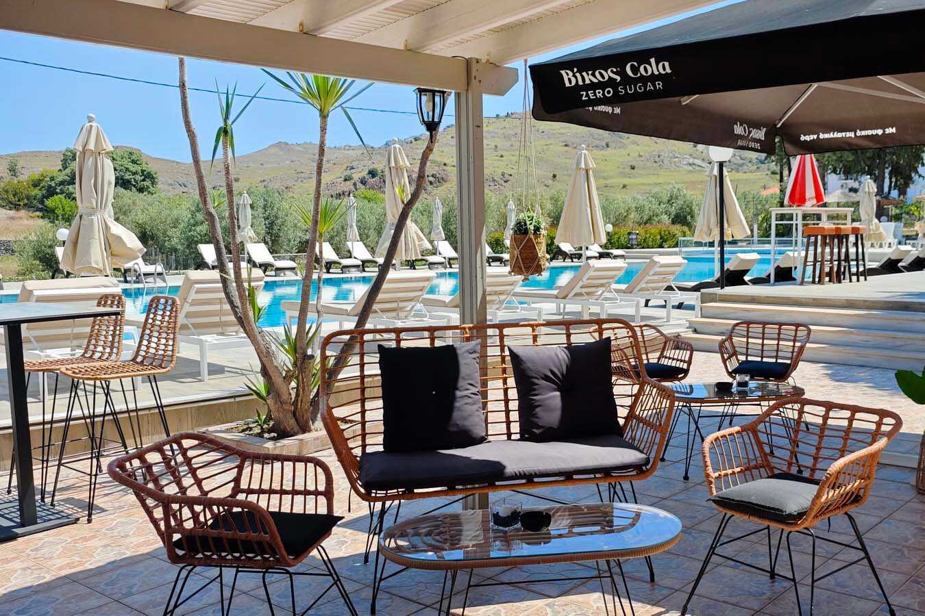 Hotellet har en restaurant som tilbyr greske retter, samt en bar.