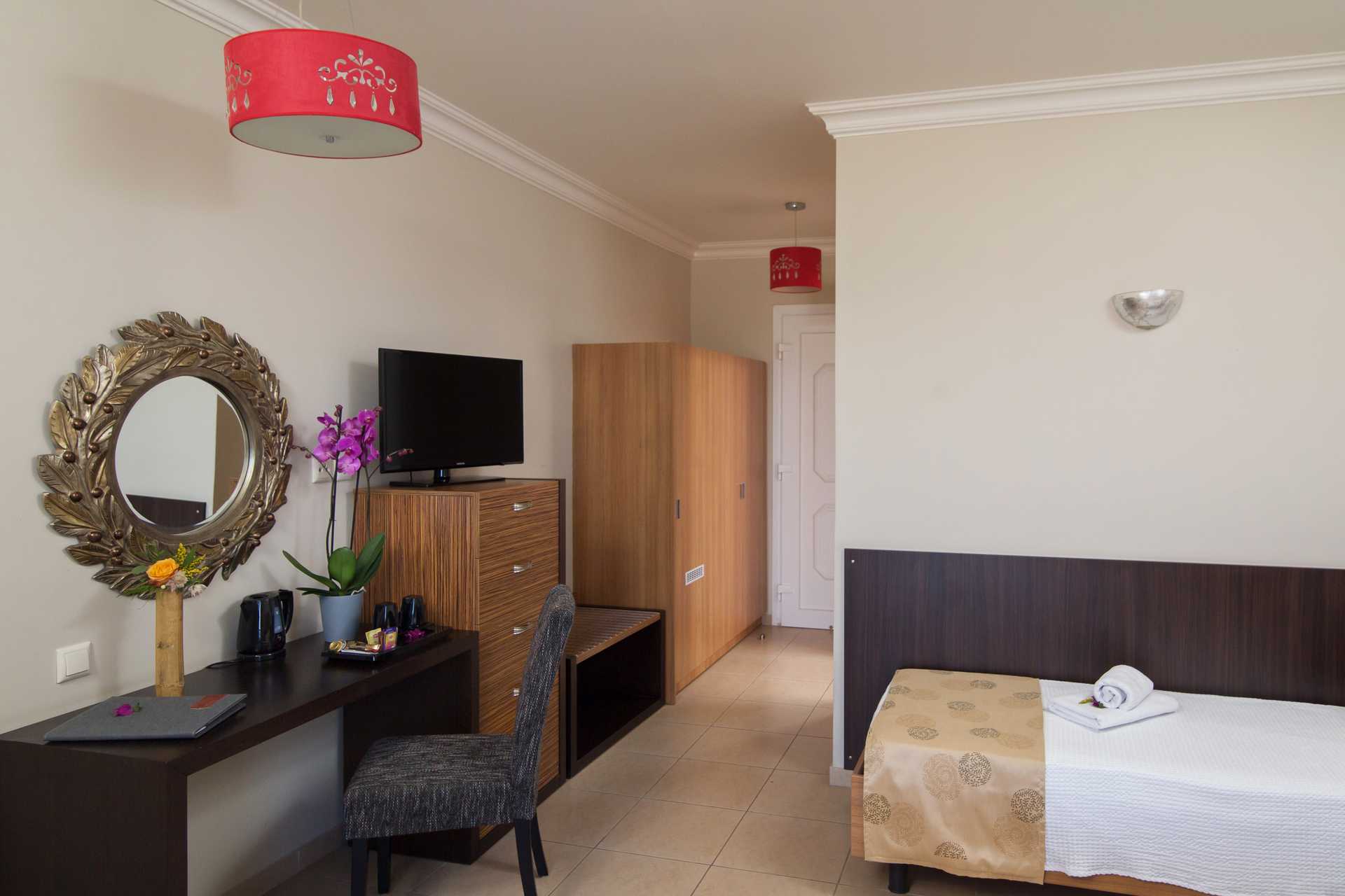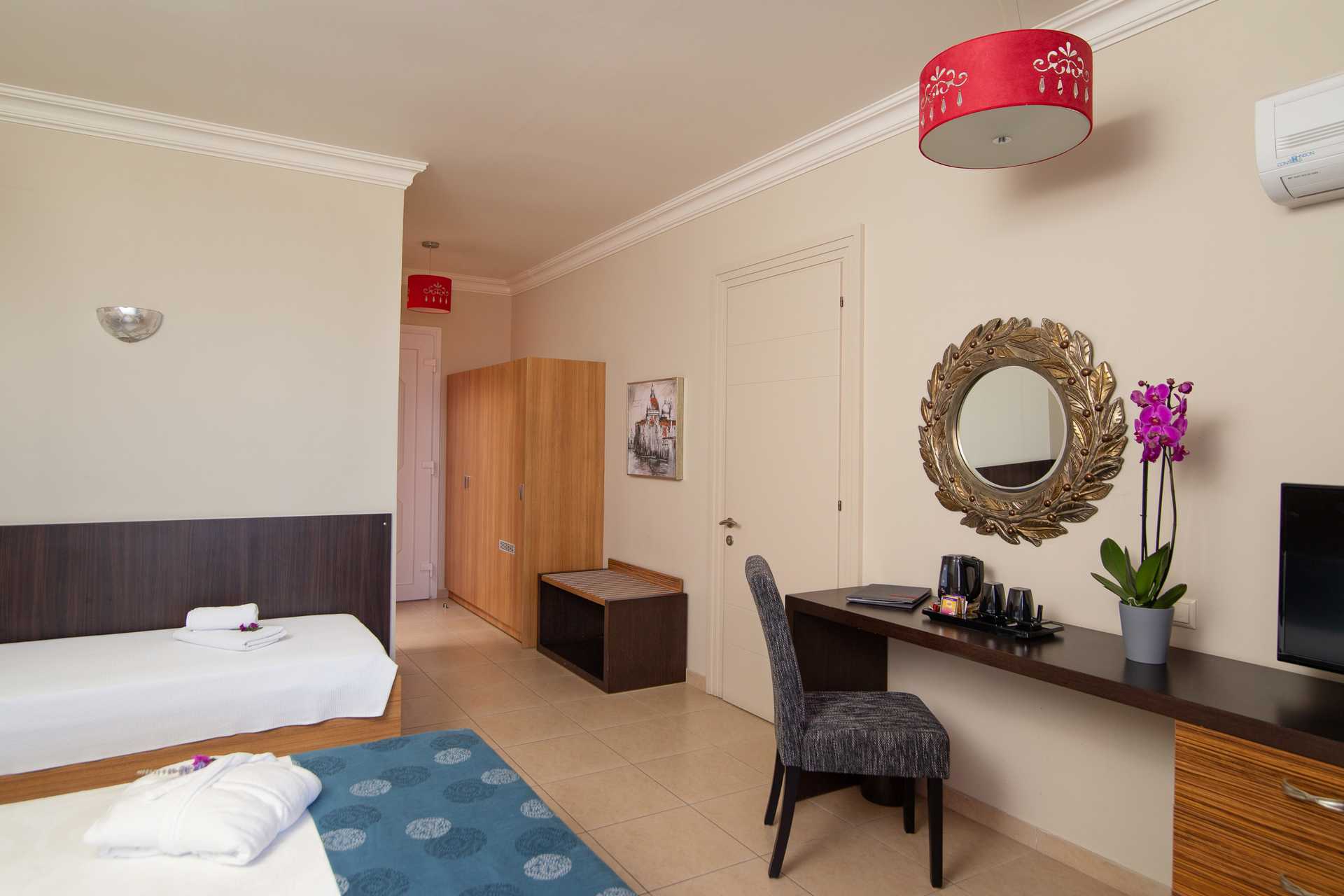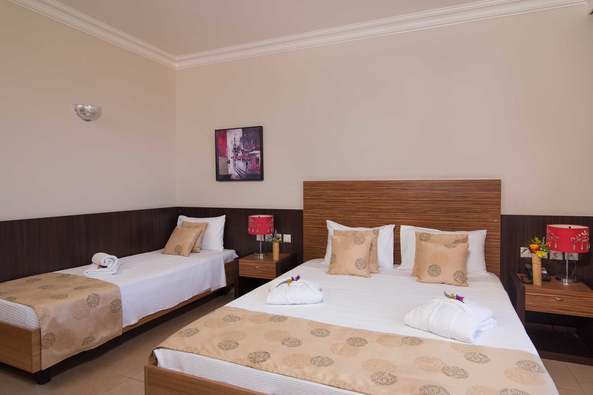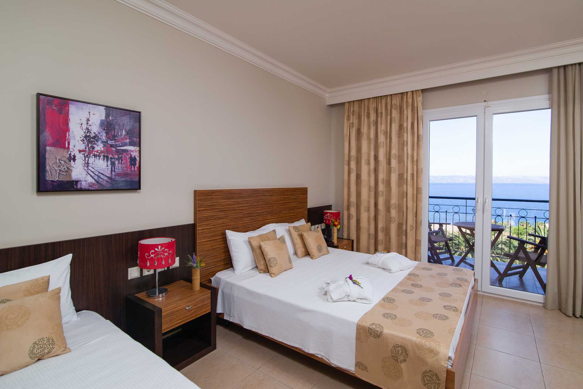 Superiorrom med balkong som vender mot havet. En dobbeltseng eller to enkeltsenger. Mulighet for ekstrasenger i enkeltseng og en dobbeltseng. Wifi, luftkondisjonering og safe er inkludert. Kjøleskap. Vannkoker samt kaffe og te. TV. Badekåper og tøfler. Hårføner. Dusj og wc. Rengjøring 7 ggr/uke.