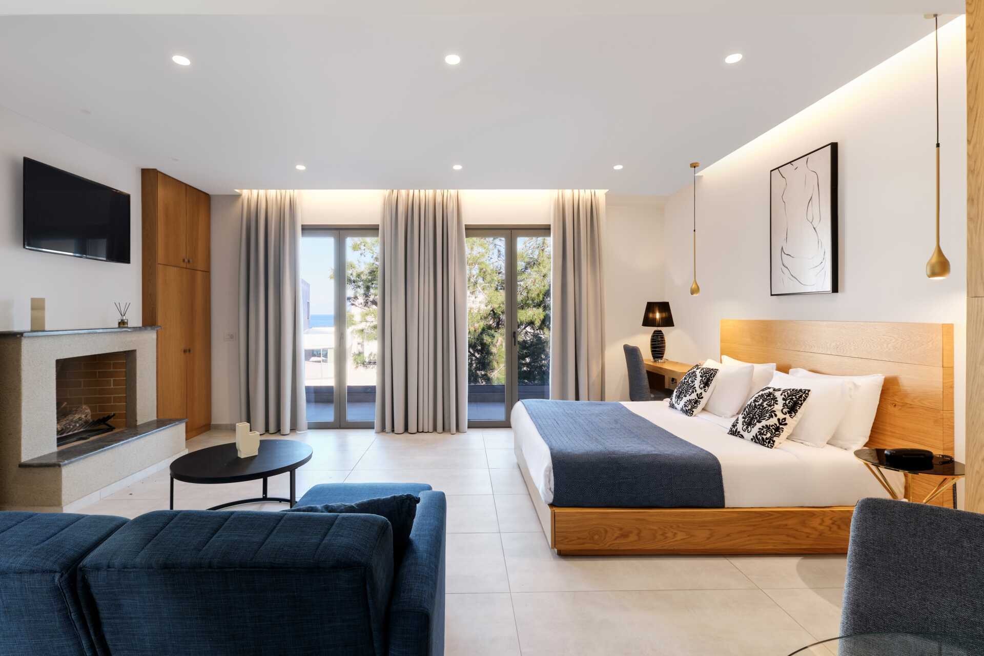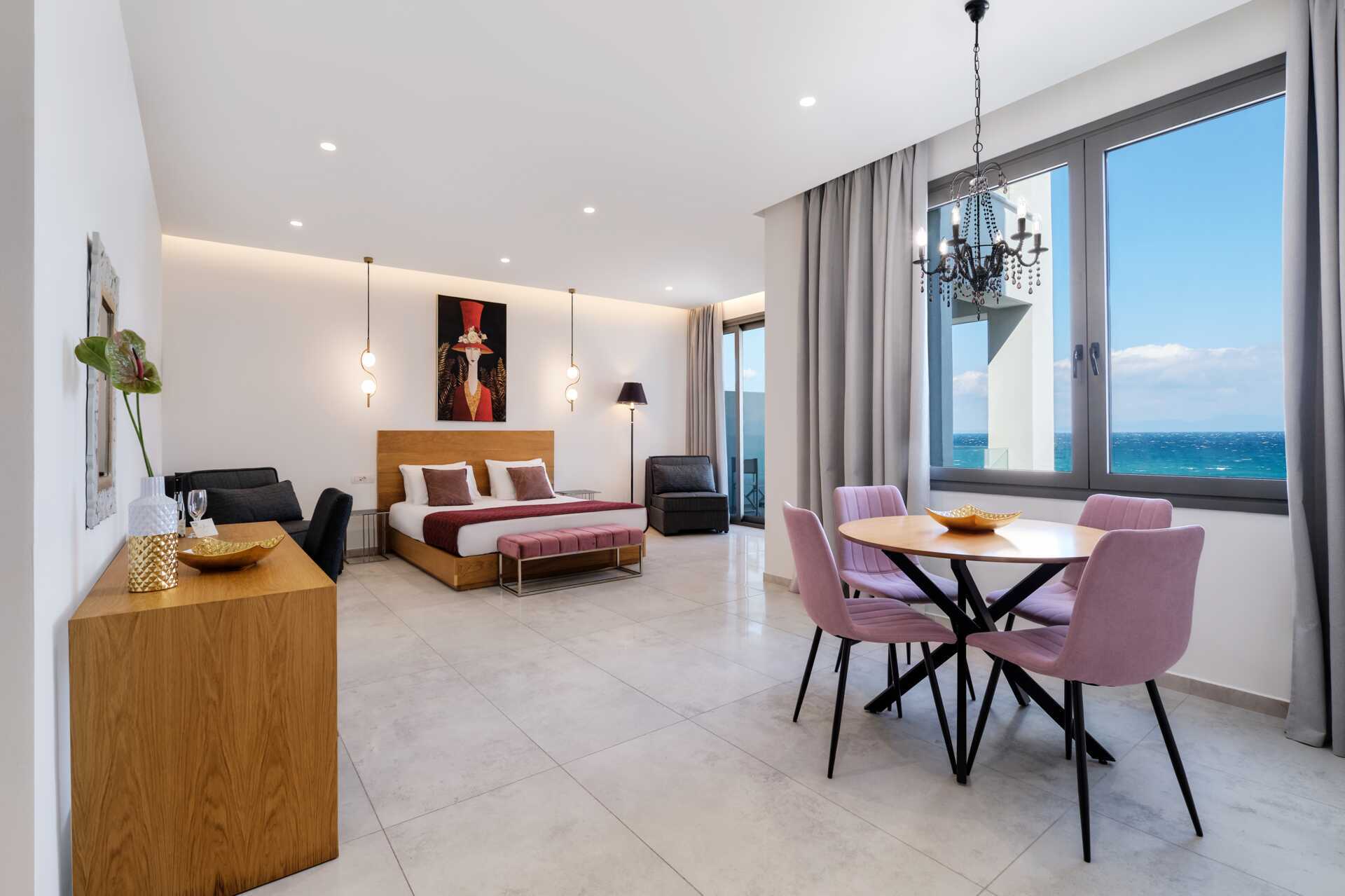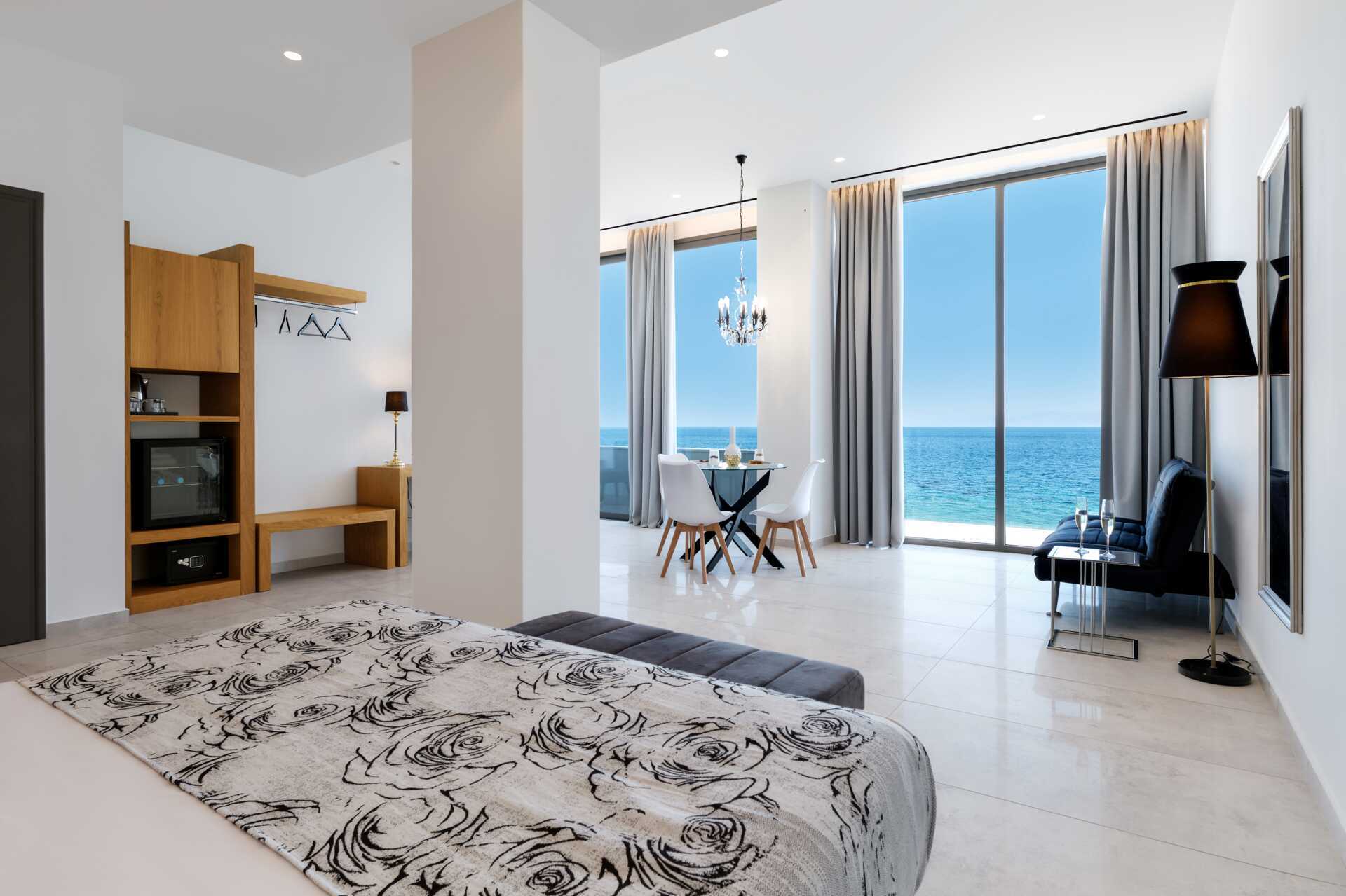 Deluxesuite med balkong. En dobbeltseng. Mulig med en ekstraseng i oppredbar lenestol. Wifi, luftkondisjonering og safe inkludert. Minibar. TV. Badekåper og tøfler Hårføner. Dusj og wc. Rengjøring 7 ggr/uke.
