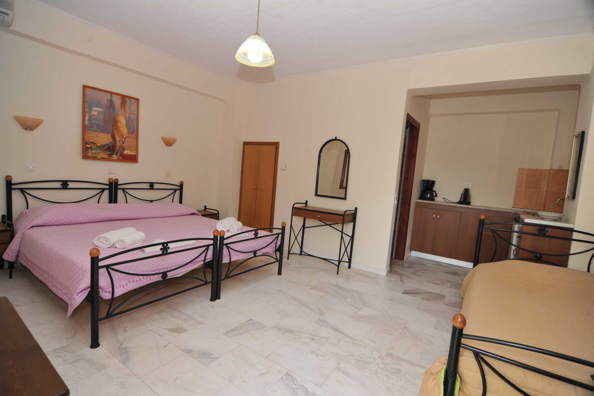 Større ettromsleilighet med markterrasse som vender mot hagen. Soverom kombinert med minikjøkken. To enkeltsenger og én bred enkeltseng. Mulig med ekstrasenger i ordinære senger. Minikjøkken med kokeplater, kjøleskap, vannkoker og enkelt kjøkkenutstyr. Wifi og luftkondisjonering er inkludert. TV med lokale kanaler. Dusj og wc. Rengjøring 6 ggr/uke.