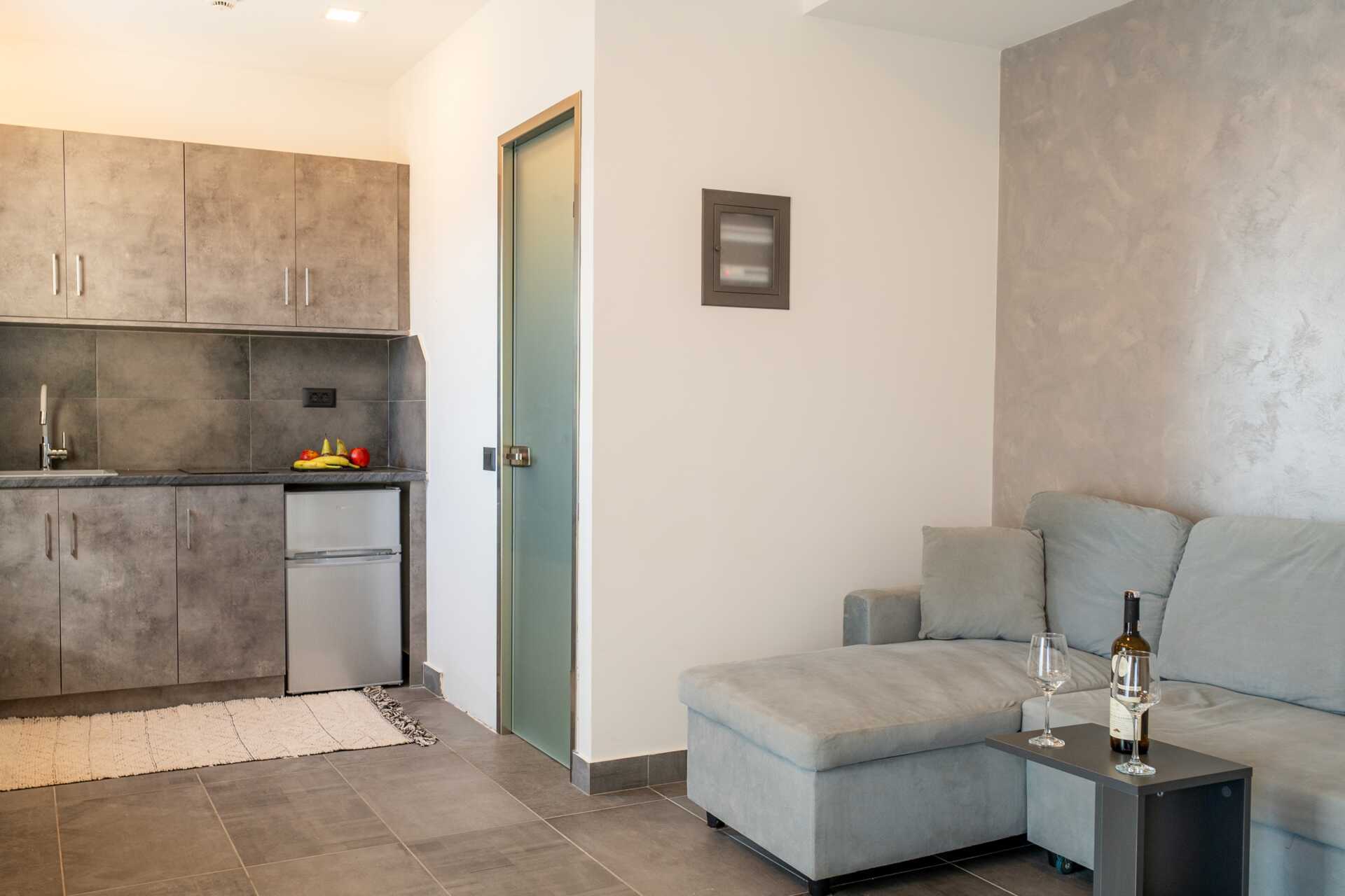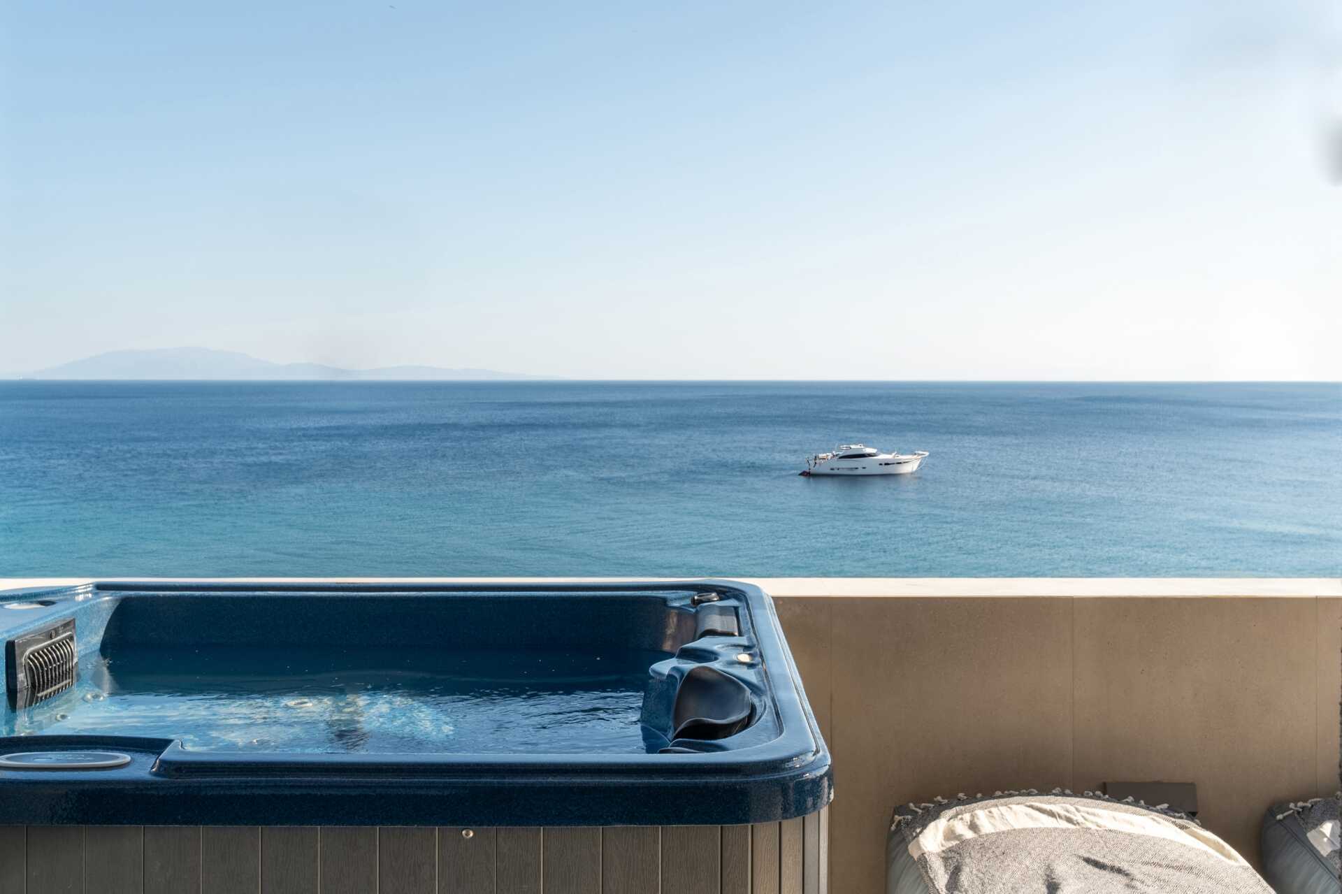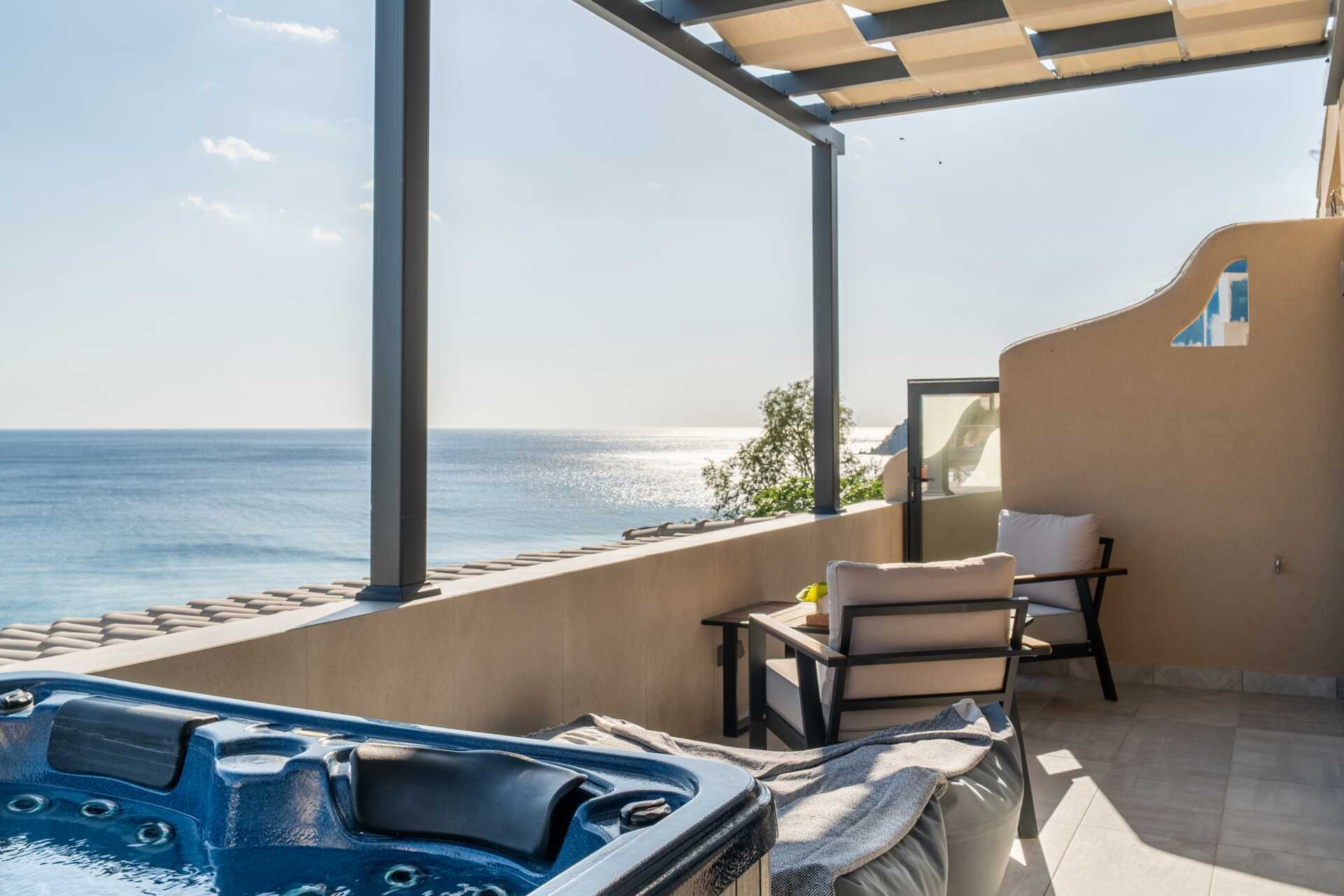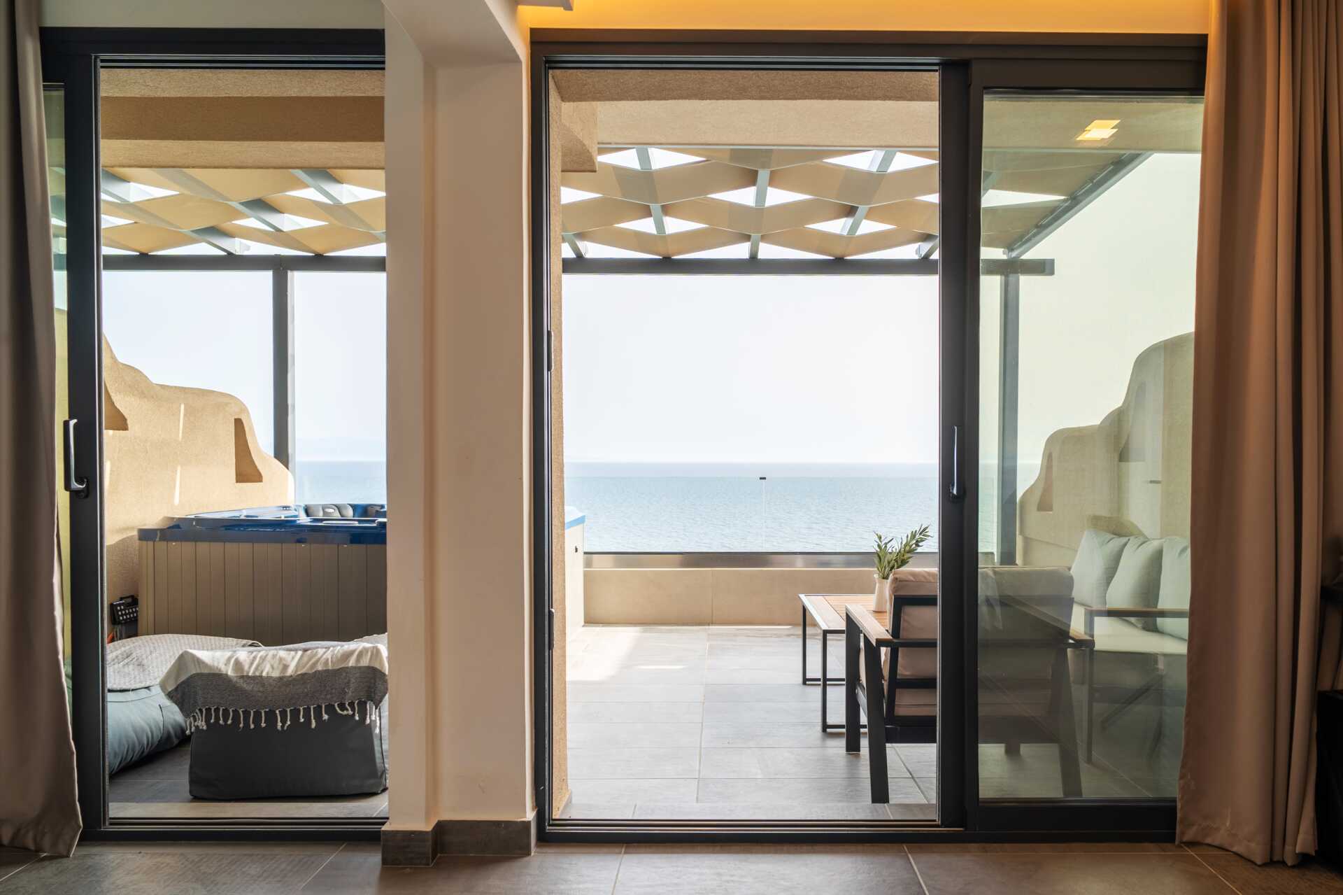 Toromsleilighet med balkong og havutsikt. På balkongen er det jacuzzi og solsenger samt bord og stoler. Soverom med minikjøkken. En dobbeltseng. Mulig med ekstrasenger i sovesofaer. Minikjøkken med kokeplater, kjøleskap med liten fryseboks, mikrobølgeovn, sandwichgrill og enkelt kjøkkenutstyr. Wifi, luftkondisjonering og safe inkludert. TV. Steamer. Badekåper. Hårføner. Bad med dusj og wc. Rengjøring 7 ggr/uke.