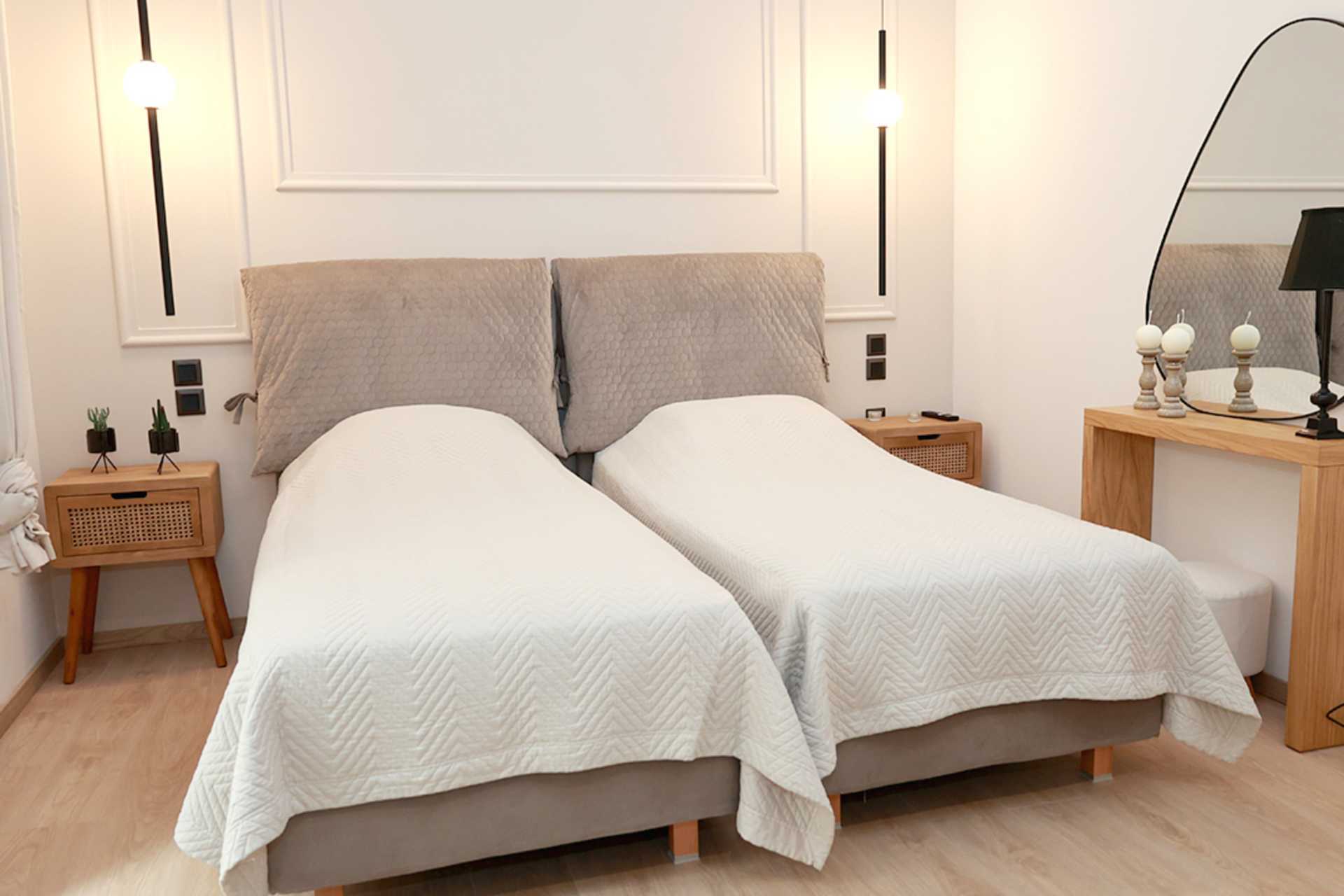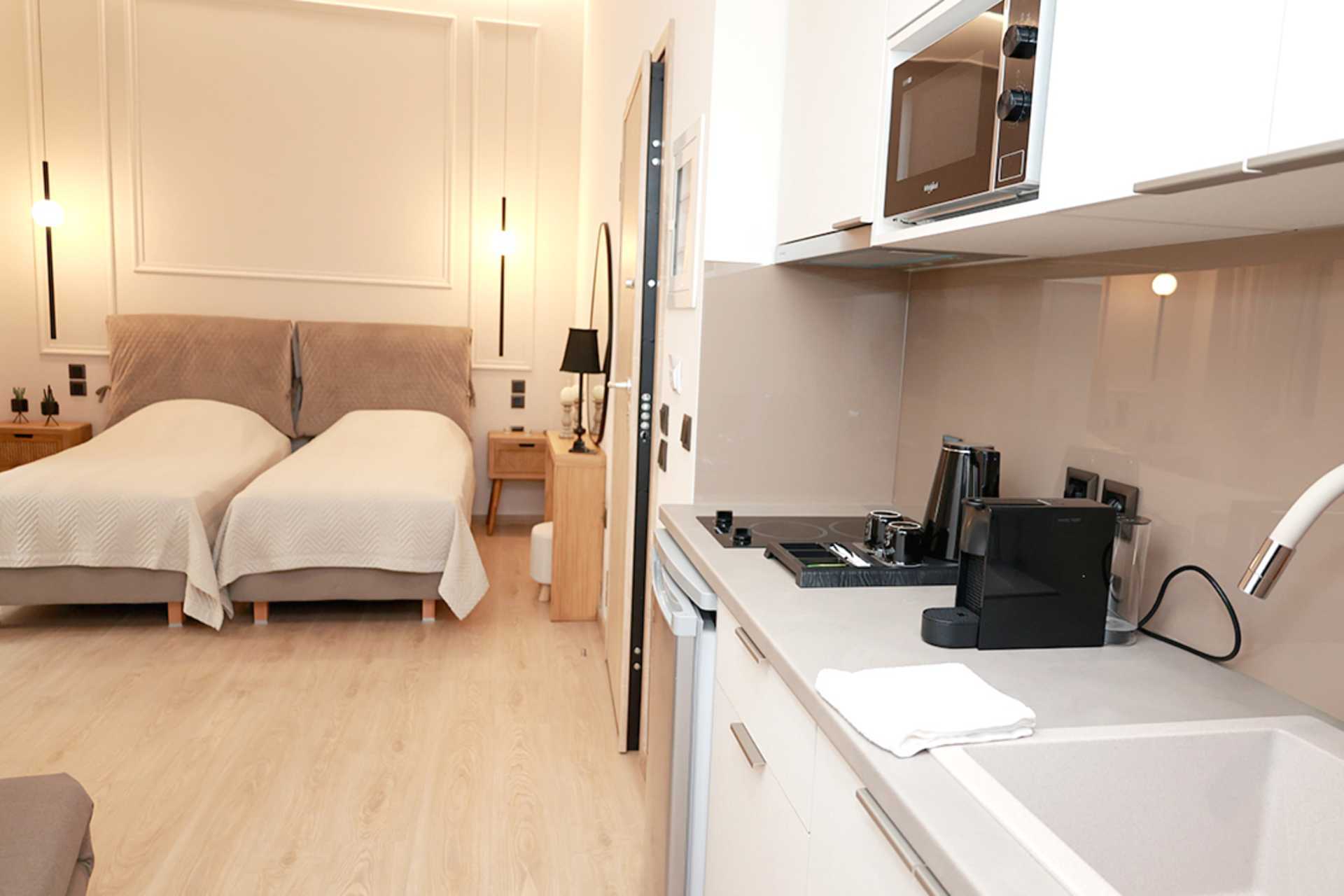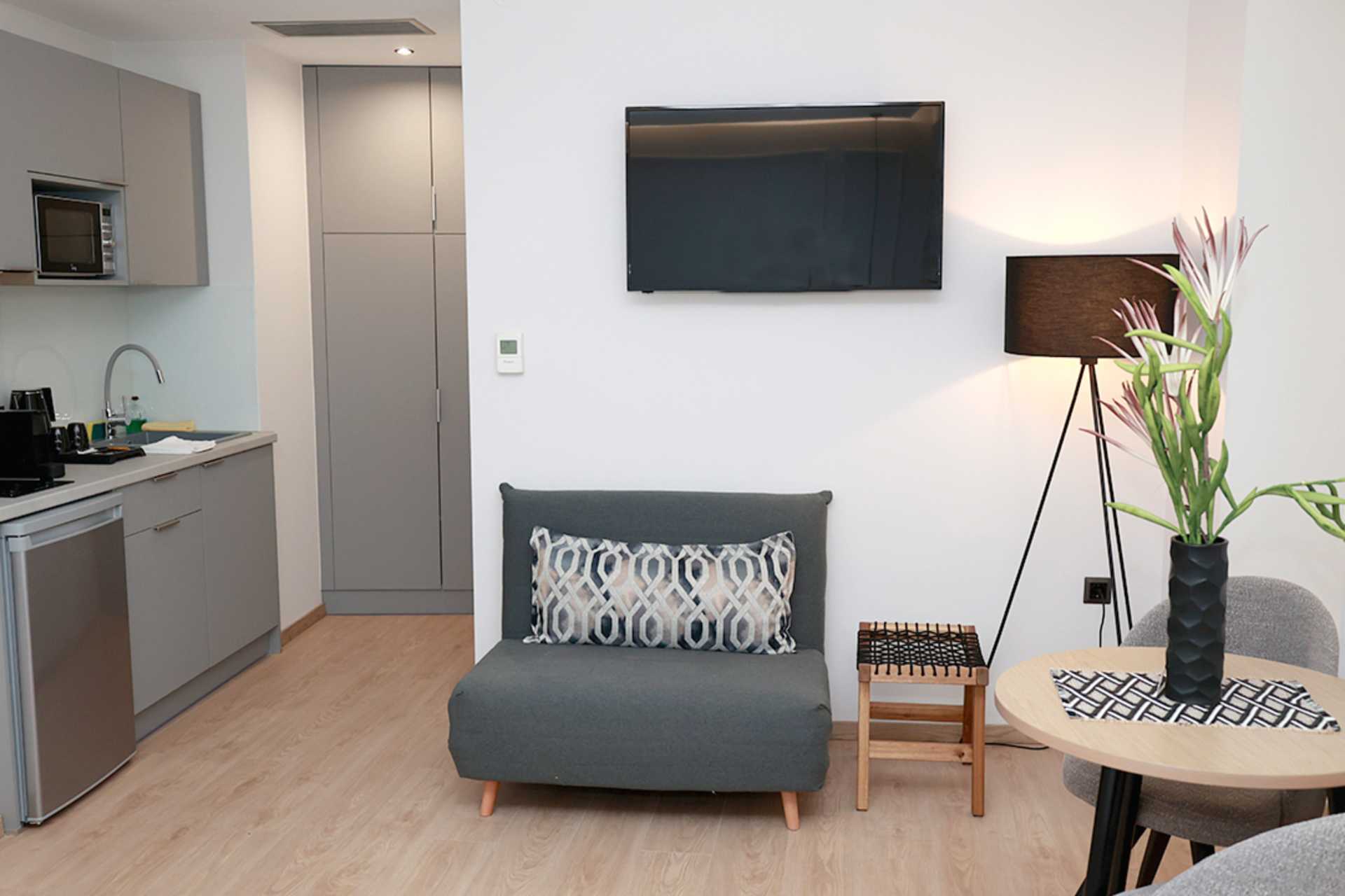 Ettromsleilighet med markterrasse, balkong eller stor balkong/terrasse. Minikjøkken. To enkeltsenger. Mulig med ekstraseng i sovesofa i noen leiligheter. Minikjøkken med kokeplater, kjøleskap, mikrobølgeovn, vannkoker, kaffetrakter og enkelt kjøkkenutstyr. Wifi, luftkondisjonering og safe inkludert. TV. Vaskemaskin. Badekåper. Hårføner. Bad med dusj og wc. Rengjøring 6 ggr/uke.