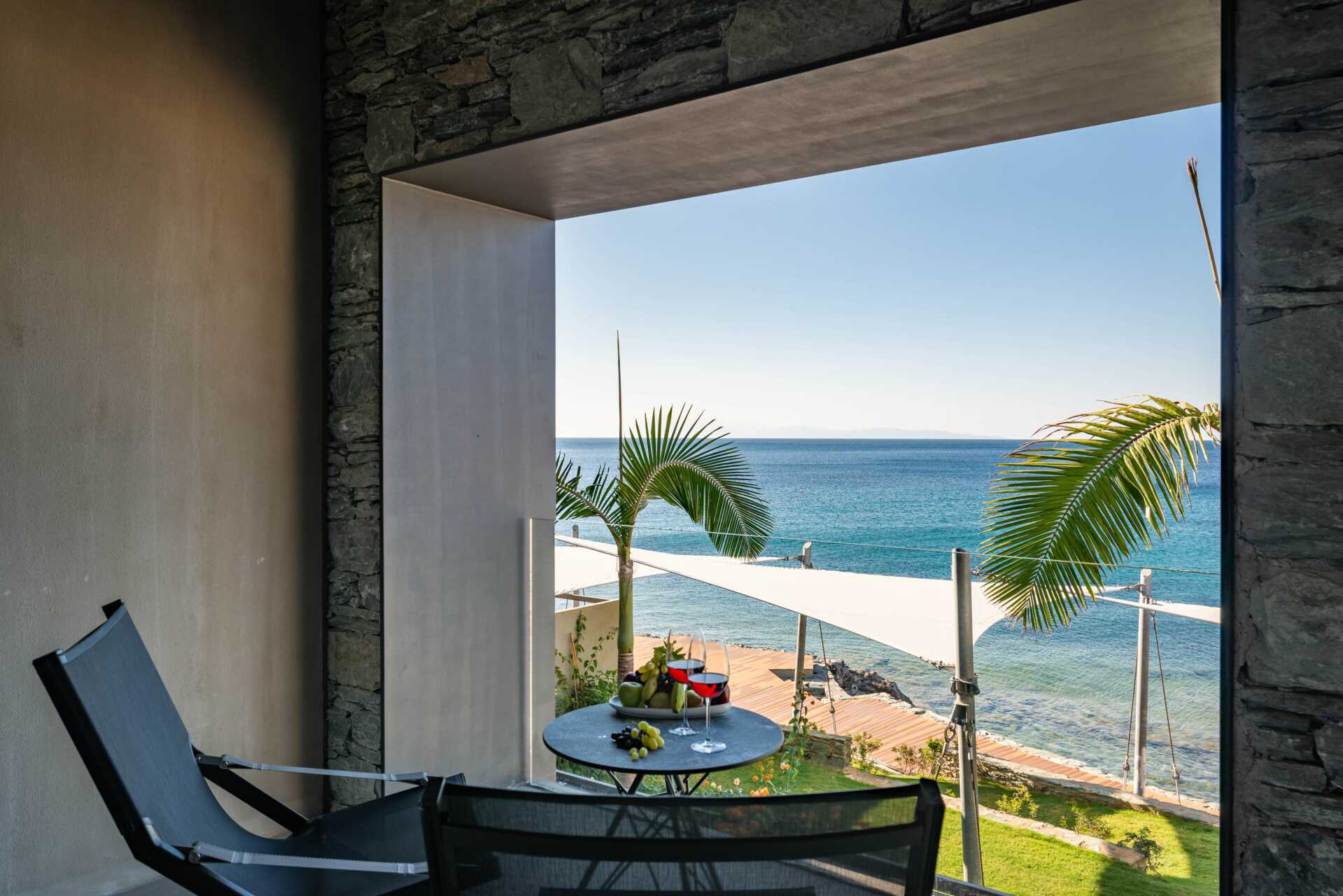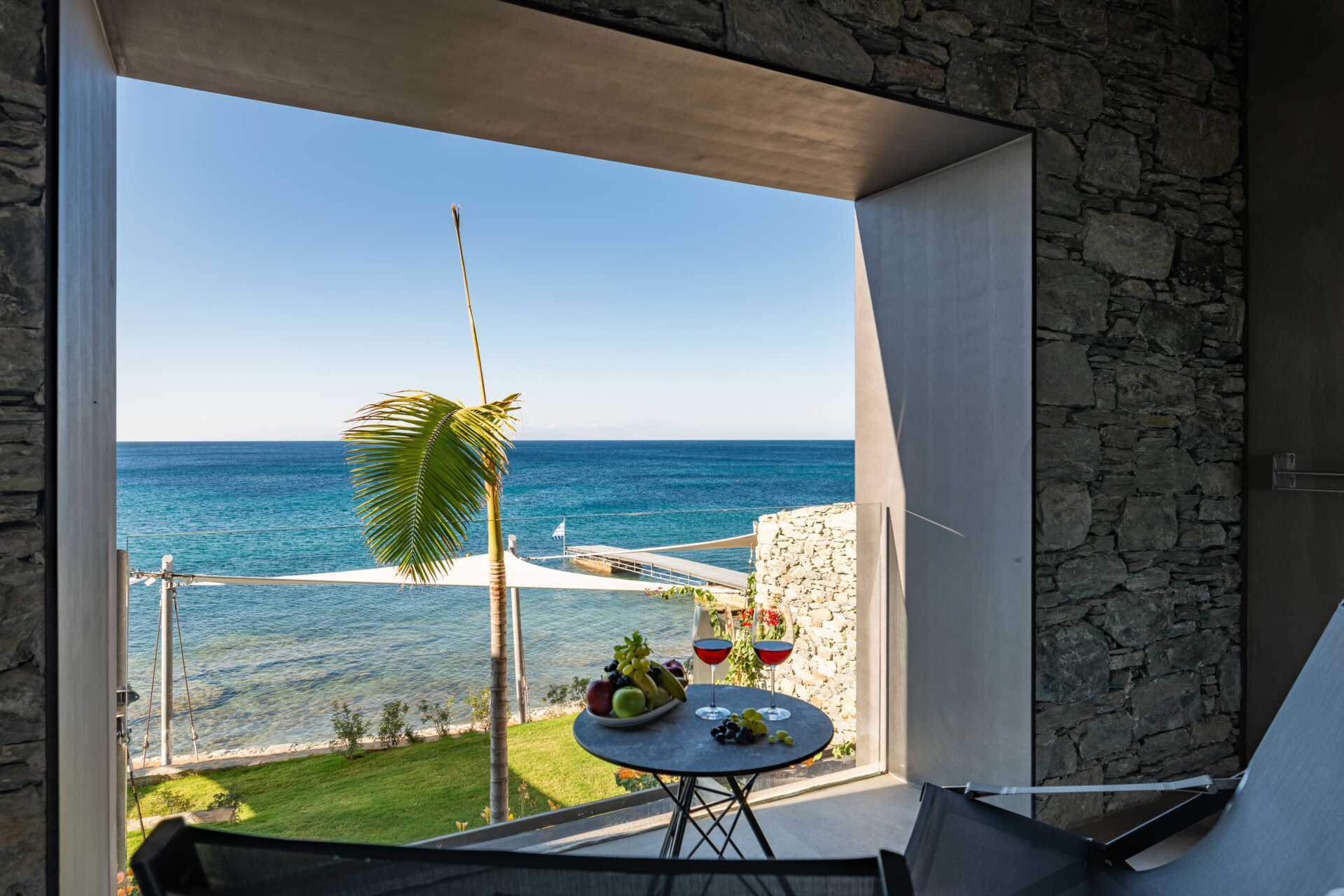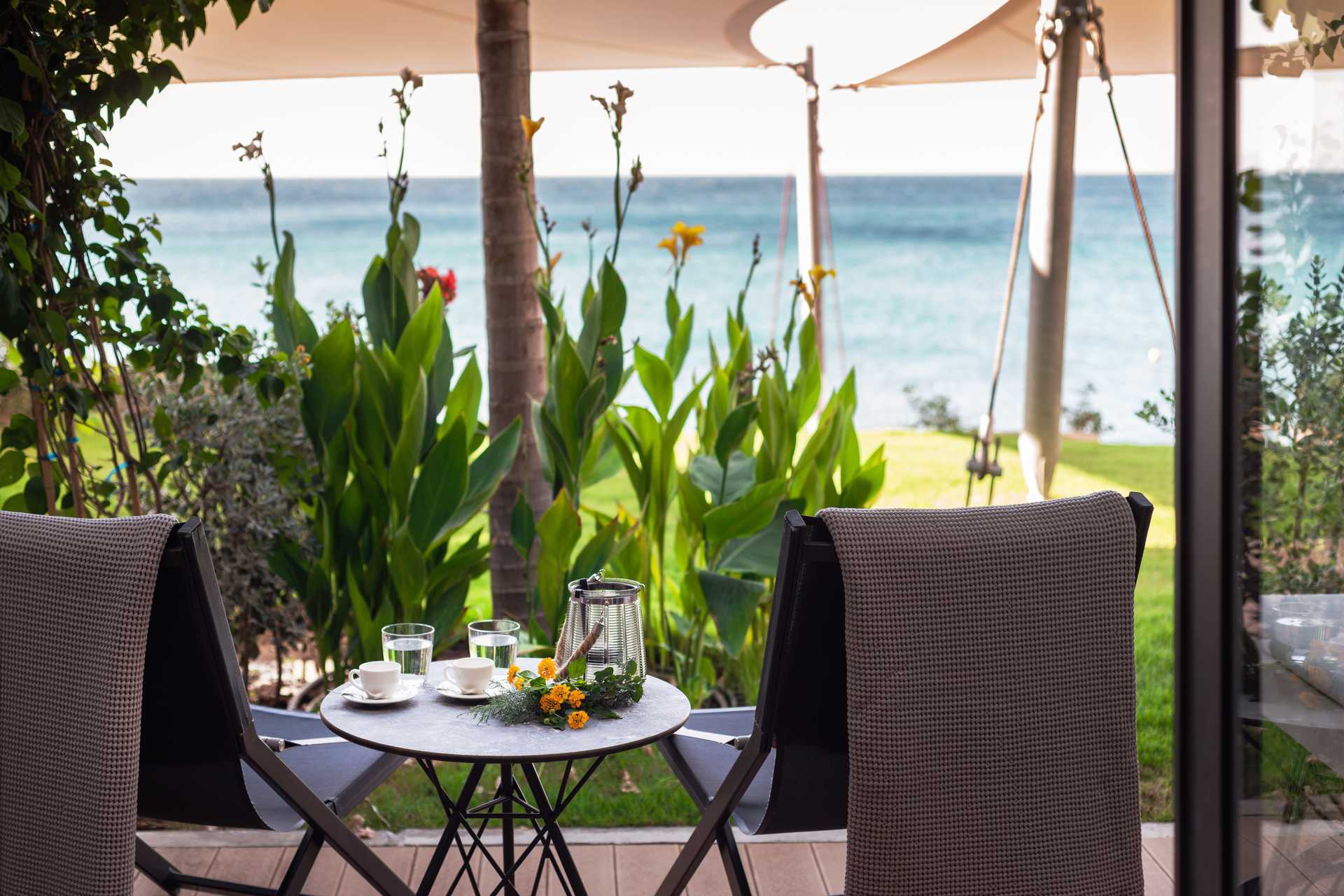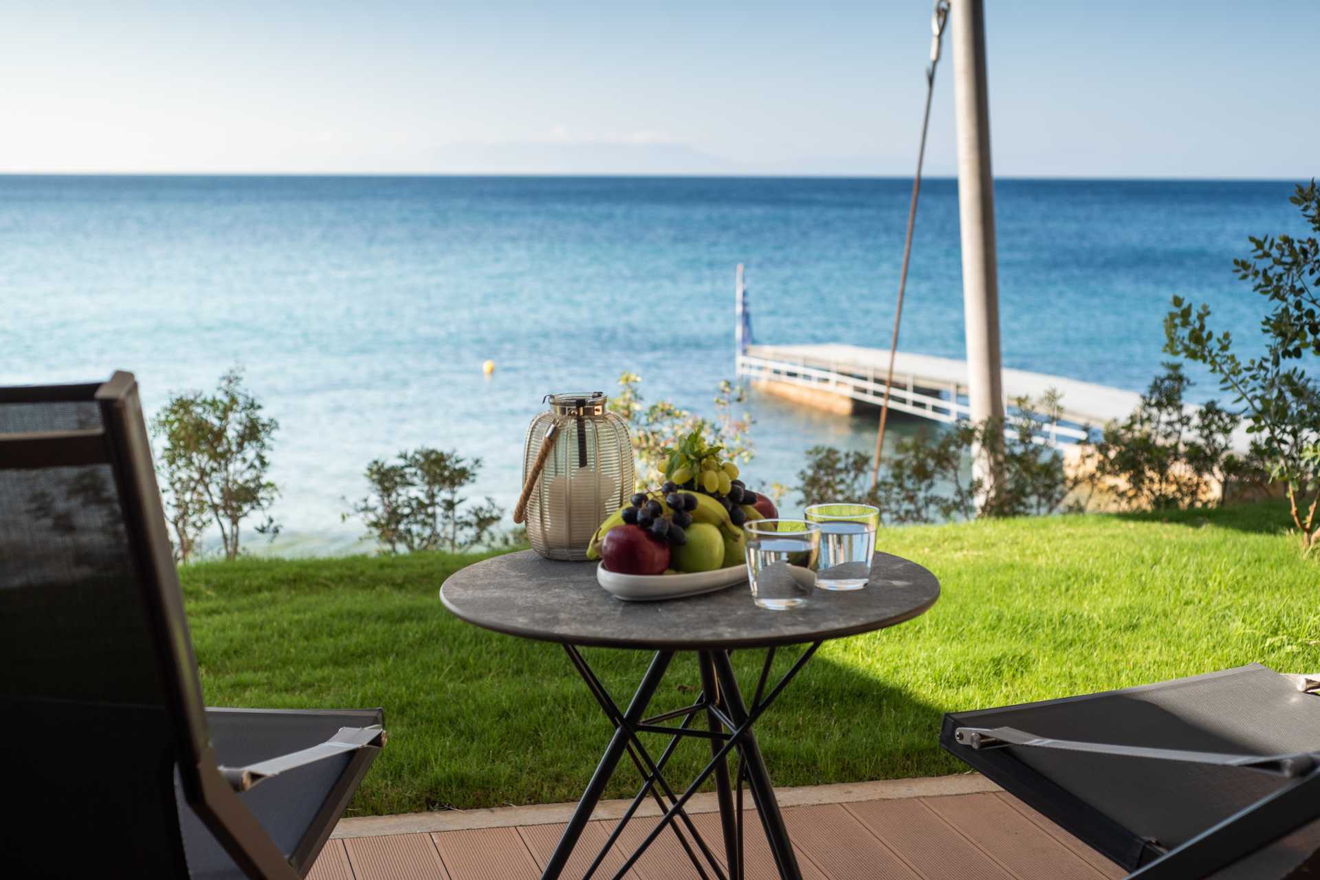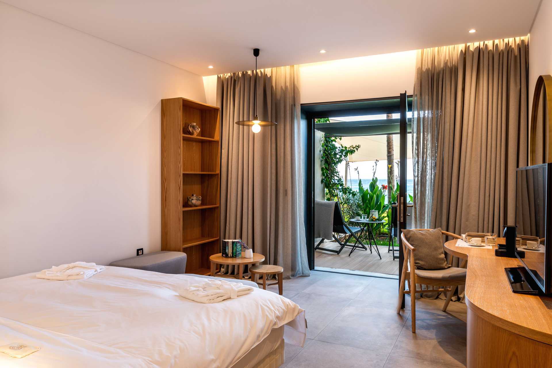Deluxerom med markterrasse og havutsikt. Sovekomforten er ekstra god med en komfortabel dobbeltseng og sengetøy av høy kvalitet. Mulig med ekstraseng i enkeltseng. Wifi, luftkondisjonering og safe er inkludert. Minibar/kjøleskap. Nespresso kaffemaskin, fire kaffekapsler inkludert, flere kan kjøpes i resepsjonen. Bluetooth-høyttalere kan lånes i resepsjonen mot et depositum. Badekåper. Hårføner. Dusj og wc. Rengjøring annenhver dag.