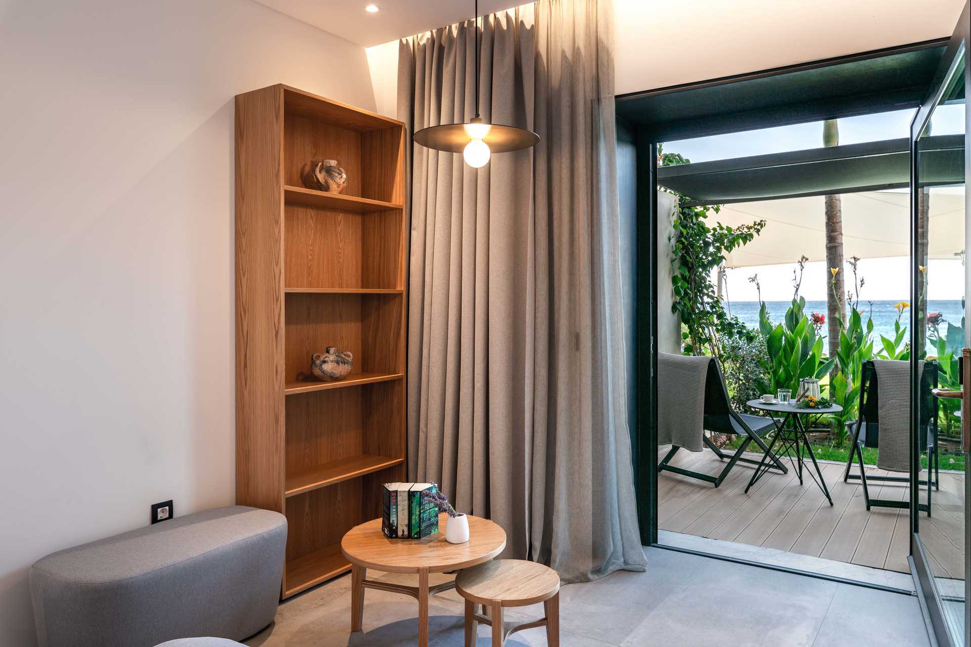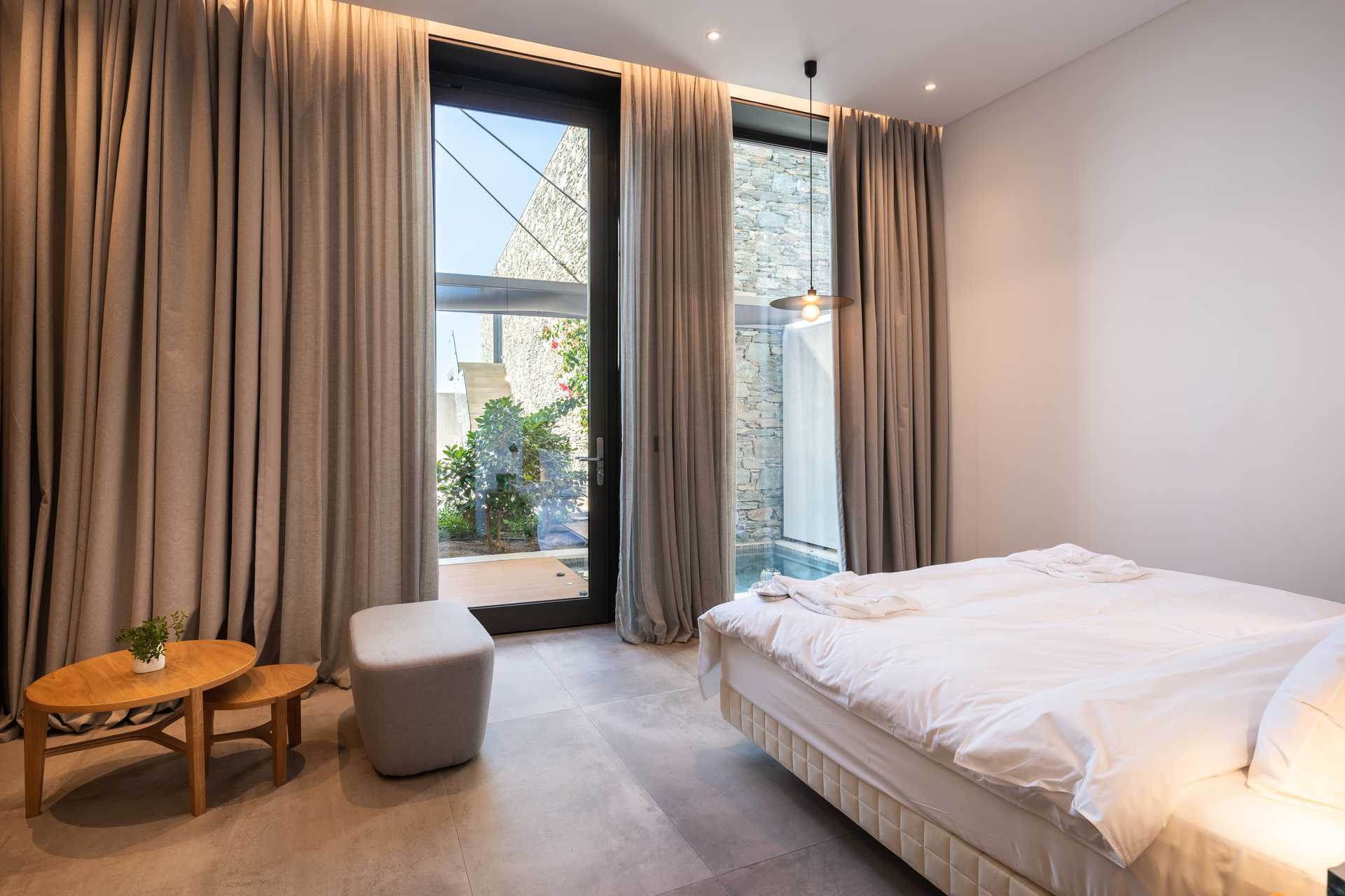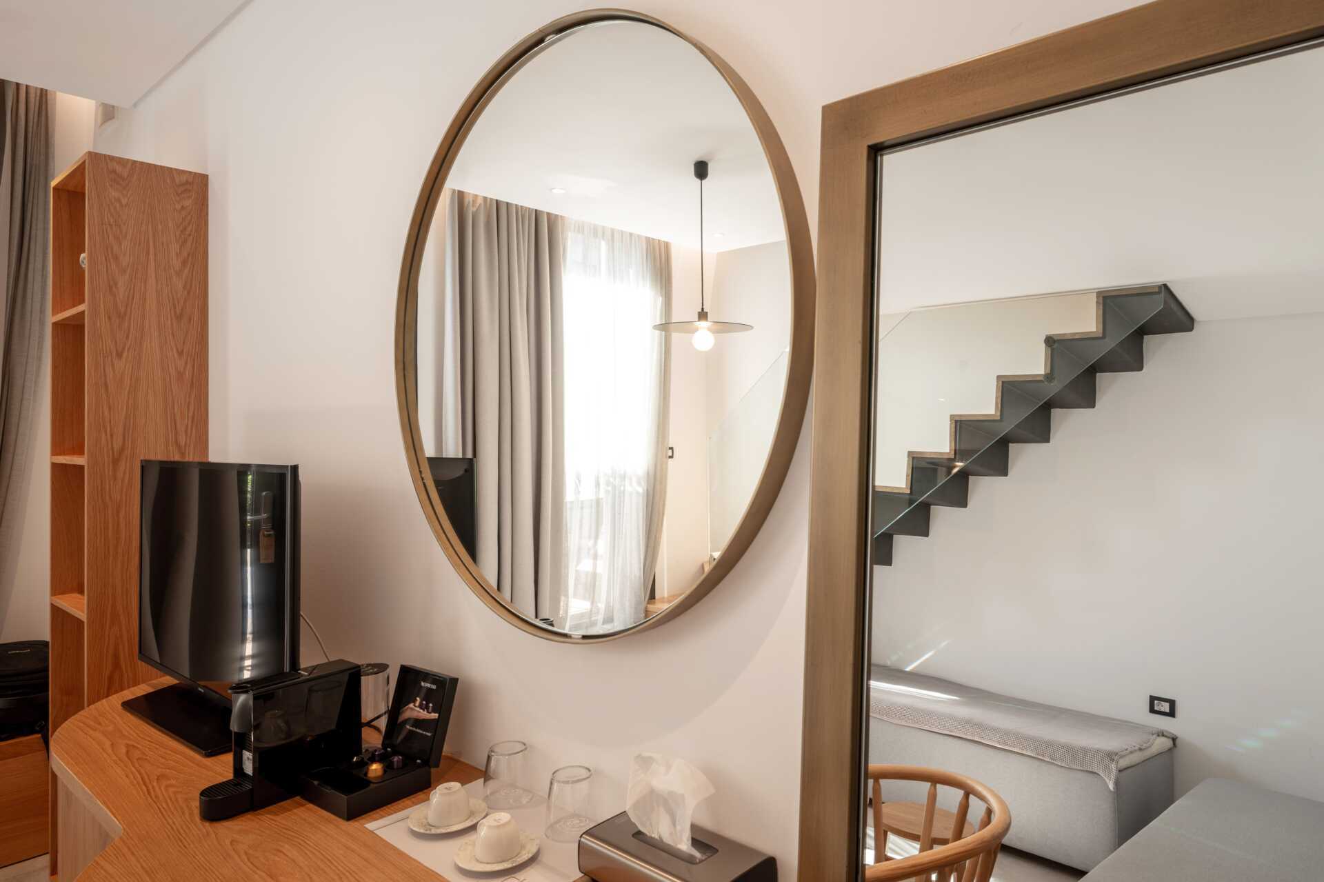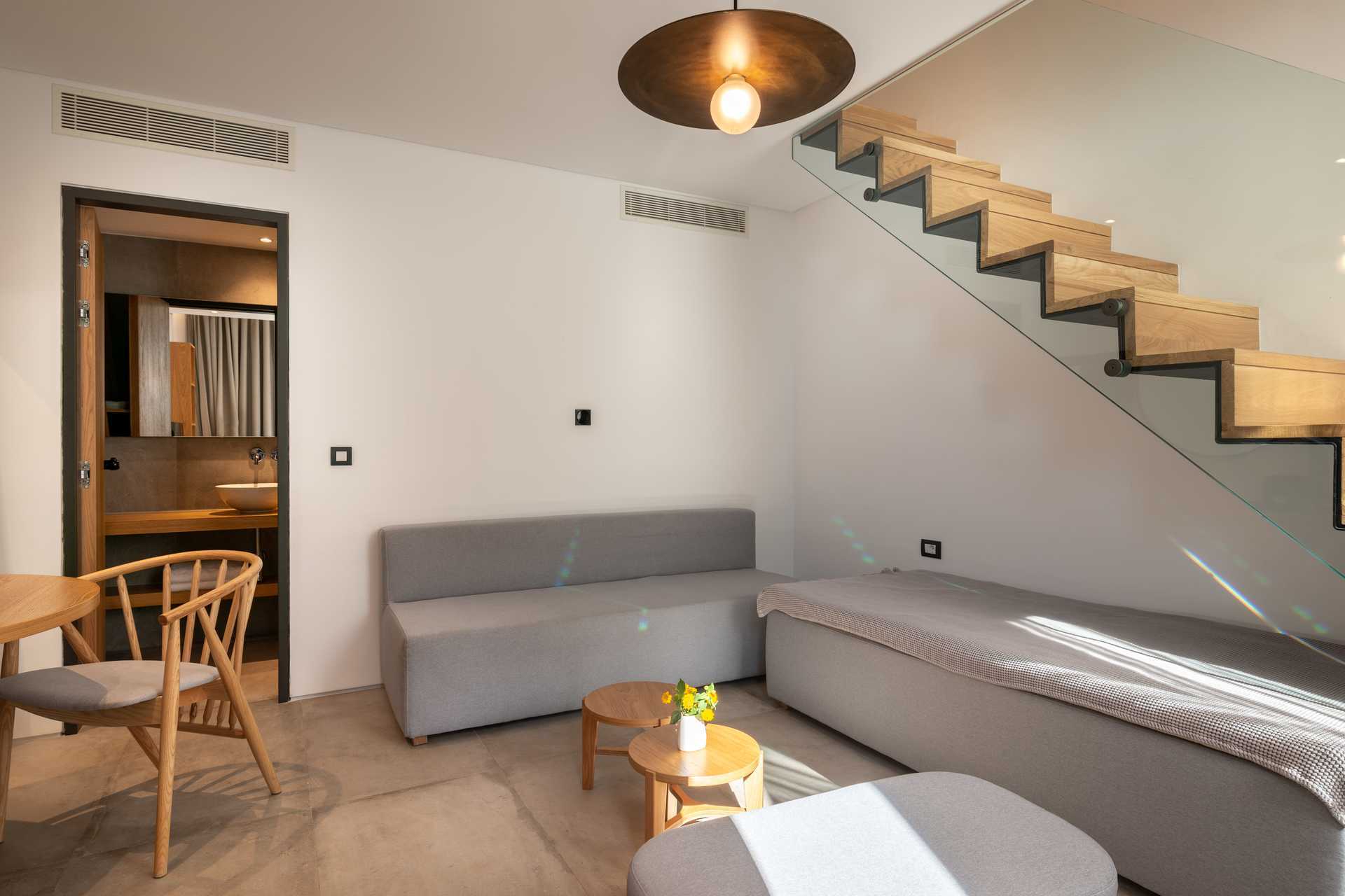Dobbeltrom i etasje med markterrasse, noen med begrenset havutsikt. En trapp opp til en sovehems hvor sovekomforten er ekstra god med en komfortabel dobbeltseng og sengetøy av høy kvalitet. Mulig med ekstraseng i enkeltseng. Wifi, luftkondisjonering og safe inkludert. Minibar/kjøleskap. Nespresso kaffemaskin, fire kaffekapsler inkludert, flere kan kjøpes i resepsjonen. Bluetooth-høyttalere kan lånes i resepsjonen mot et depositum. Hårføner. Et bad med dusj og wc i hver etasje. Rengjøring annenhver dag.