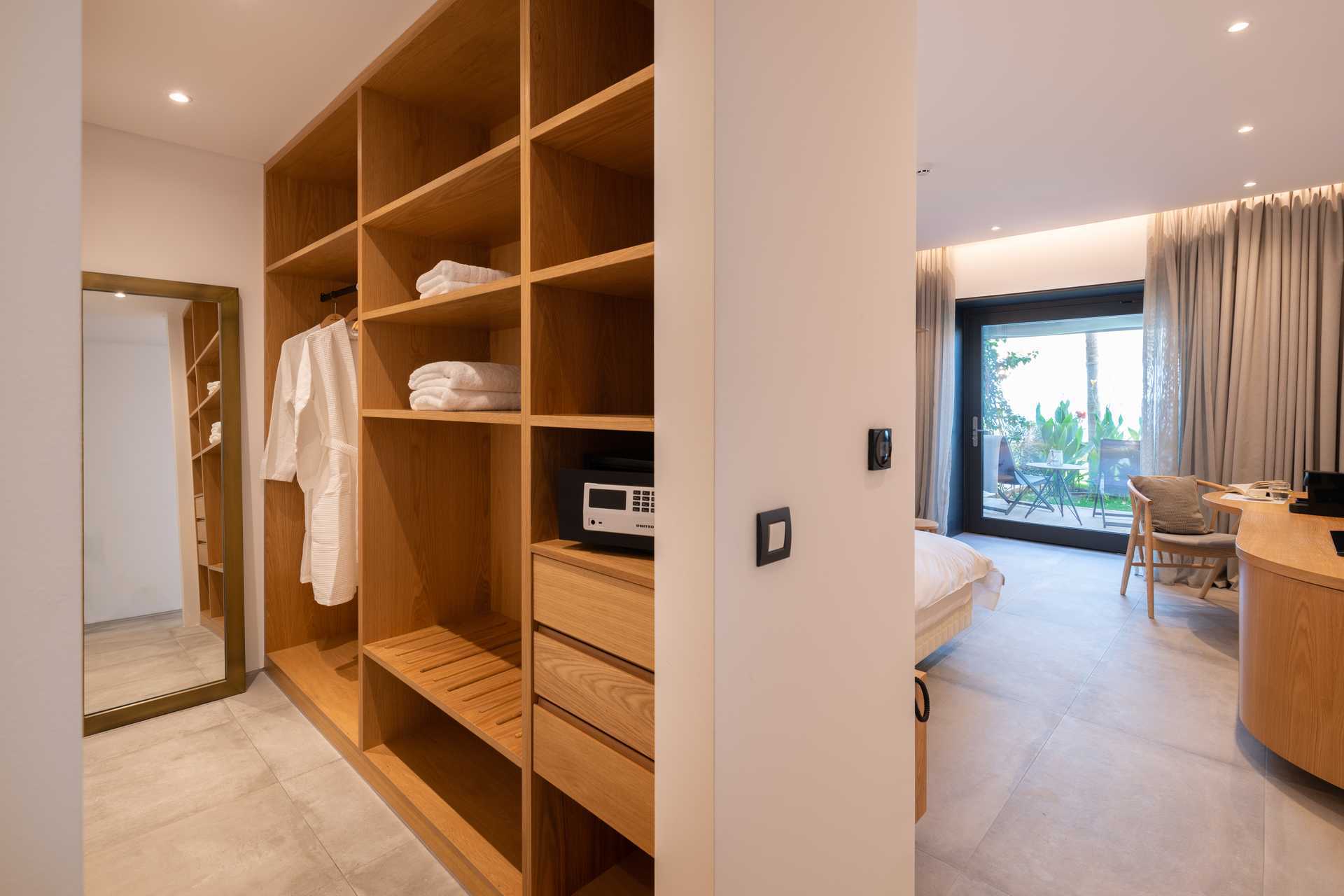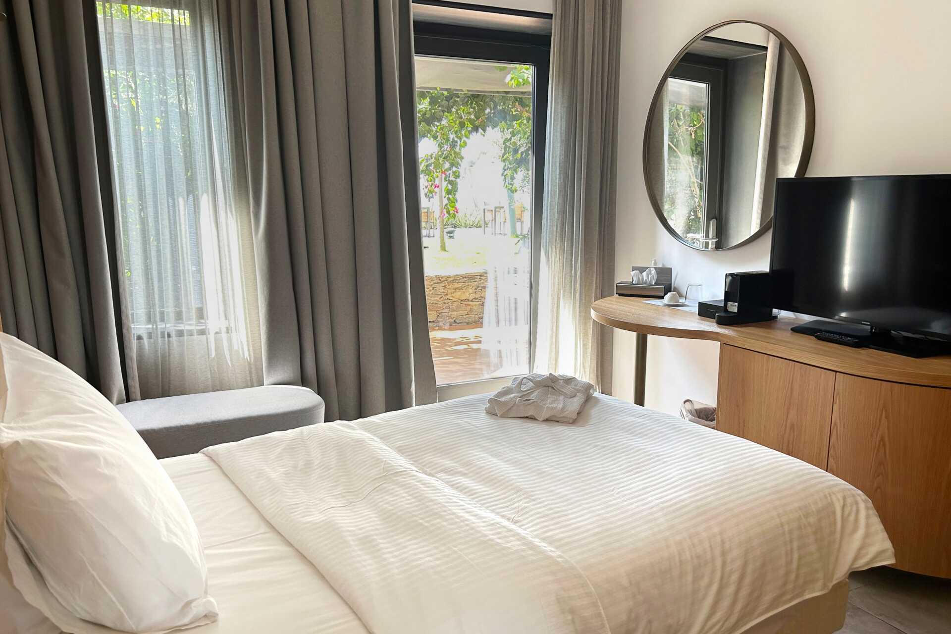 Deluxerom med markterrasse, noen med utsikt over bassenget. Det er en jacuzzi på terrassen som ikke er oppvarmet. Sovekomforten er ekstra god med gode senger og sengetøy av høy kvalitet. Wifi, luftkondisjonering og safe inkludert. Minibar/kjøleskap. Nespresso kaffemaskin, fire kaffekapsler inkludert, flere kan kjøpes i resepsjonen. Bluetooth-høyttalere kan lånes i resepsjonen mot et depositum. Badekåper. Hårføner. Baderom med dusj og wc. Rengjøring annenhver dag.