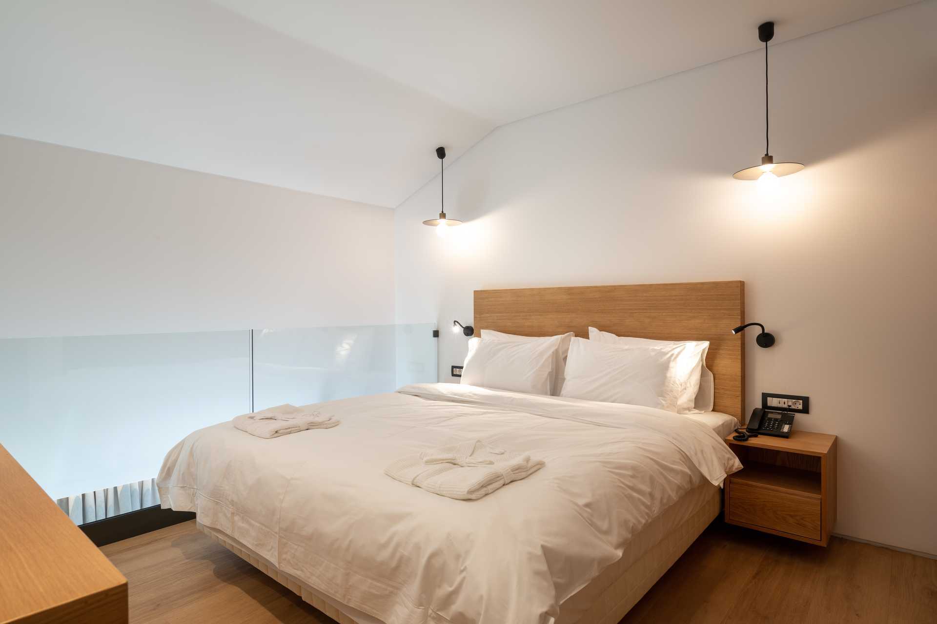 Deluxerom i etasje Et av deluxerommene har innebygd balkong, de andre har balkong med havutsikt. En trapp opp til en sovehems hvor sovekomforten er ekstra god med en komfortabel dobbeltseng og sengetøy av høy kvalitet. Mulig med ekstraseng i enkeltseng. Wifi, luftkondisjonering og safe inkludert. Minibar/kjøleskap. Nespresso kaffemaskin, fire kaffekapsler inkludert, flere kan kjøpes i resepsjonen. Bluetooth-høyttalere kan lånes i resepsjonen mot et depositum. Hårføner. To bad med dusj og wc i hver etasje. Rengjøring annenhver dag.